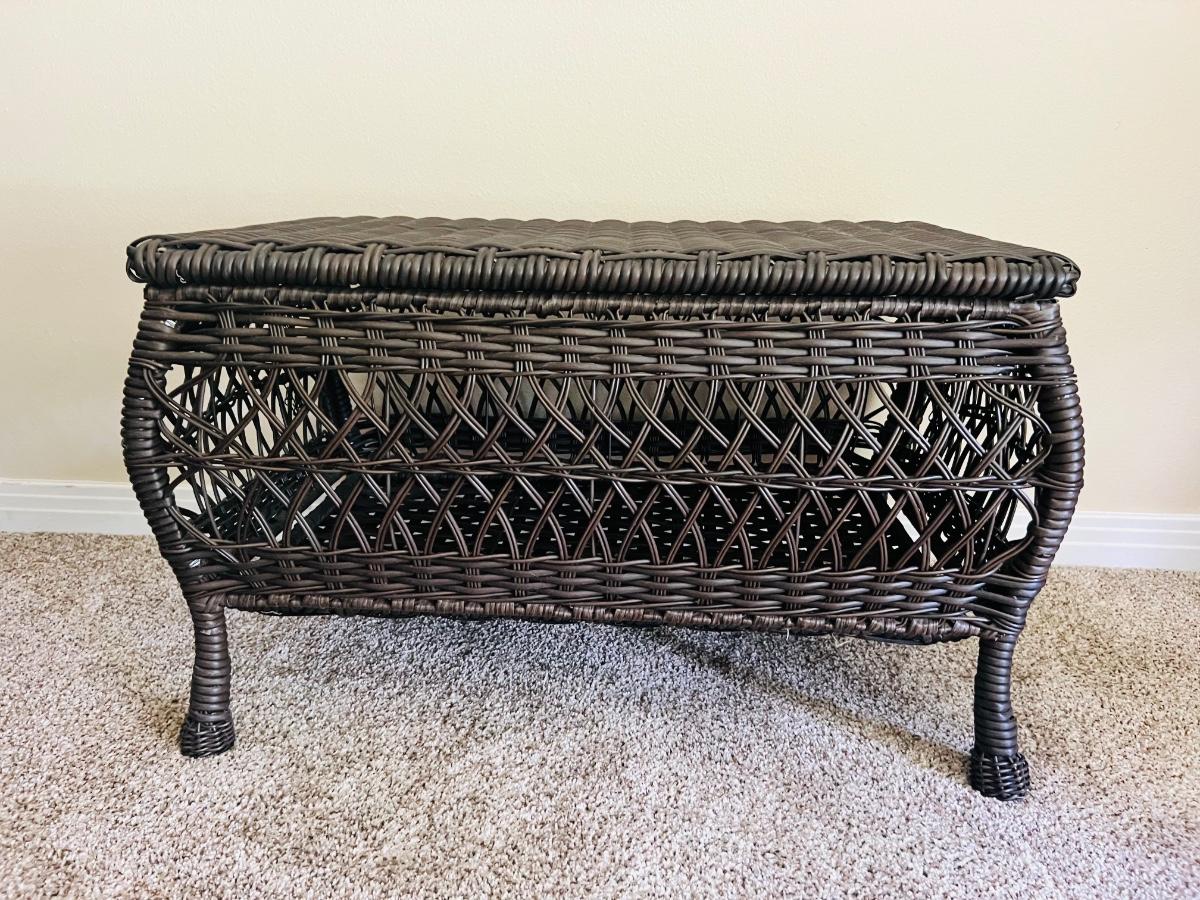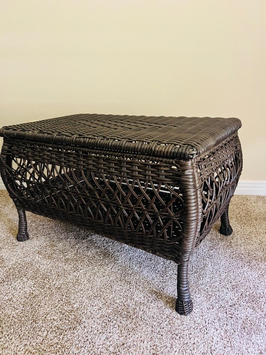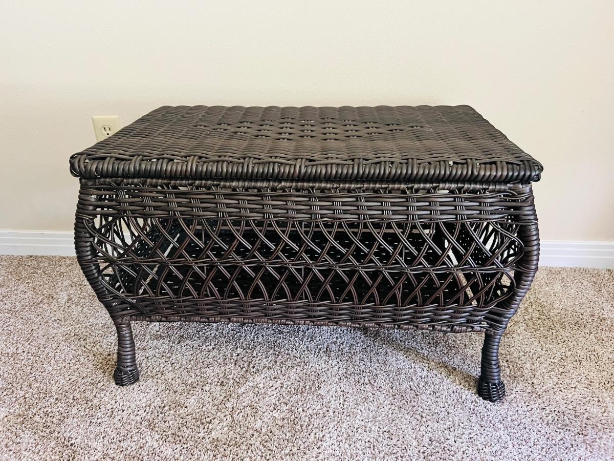Westbrook All-Weather indoor or outdoor Wicker Storage chest. Wicker Storage Patio Coffee Table measures 17 1/2 inches tall 29 inches wide and 16 1/2 inches deep