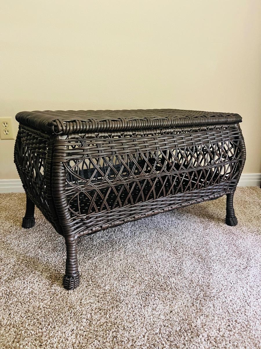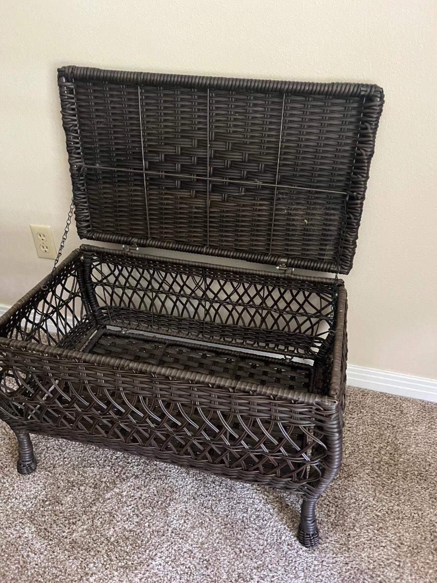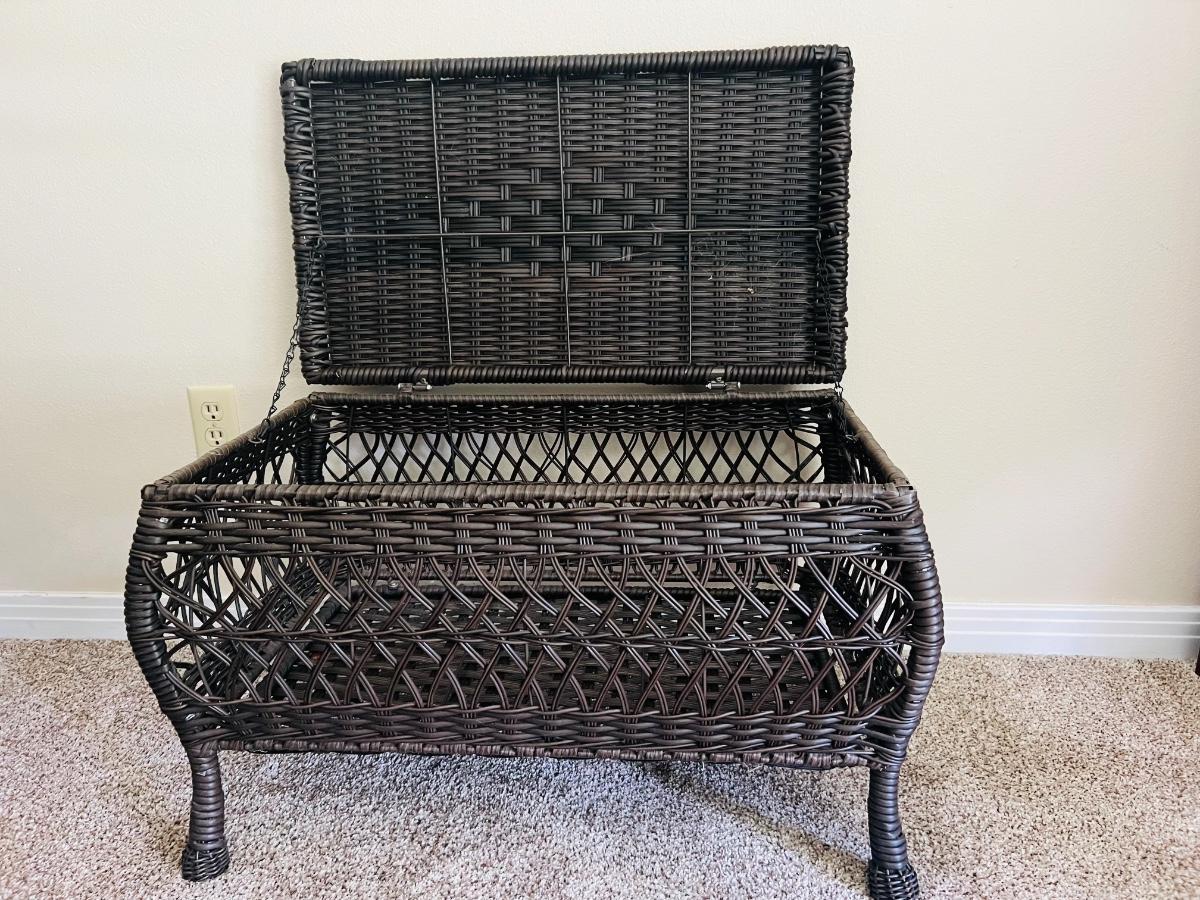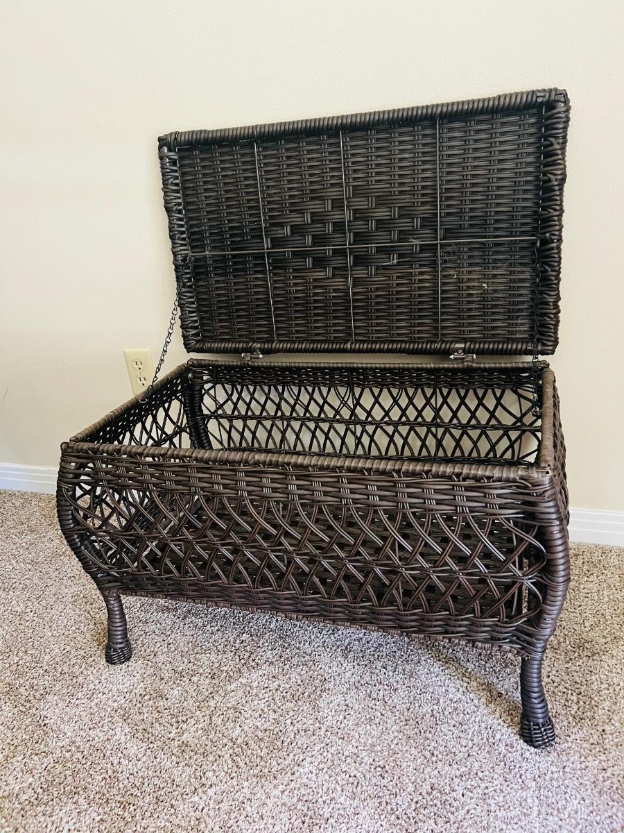 Westbrook All-Weather indoor or outdoor Wicker Storage chest. Wicker Storage Patio Coffee Table measures 17 1/2 inches tall 29 inches wide and 16 1/2 inches deep