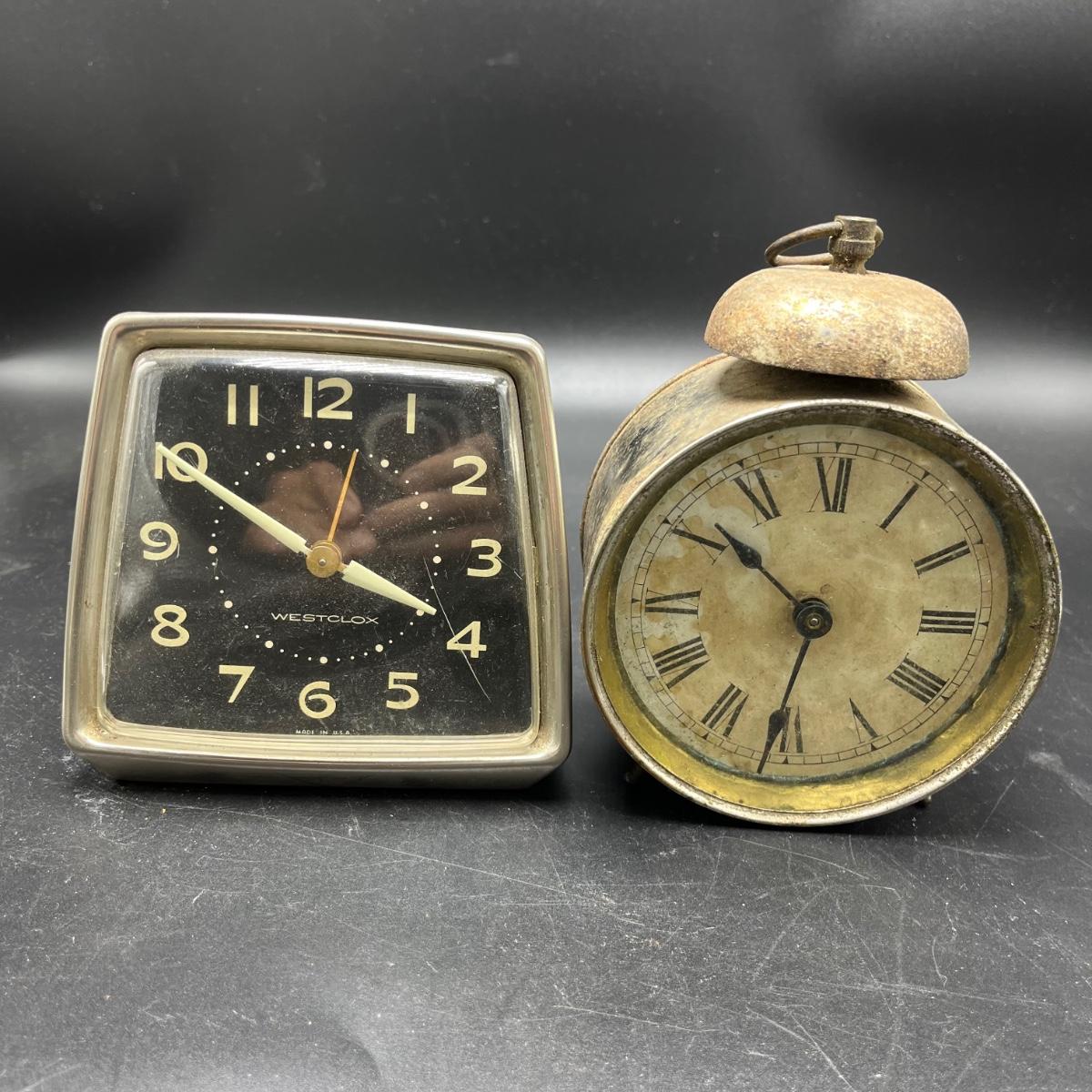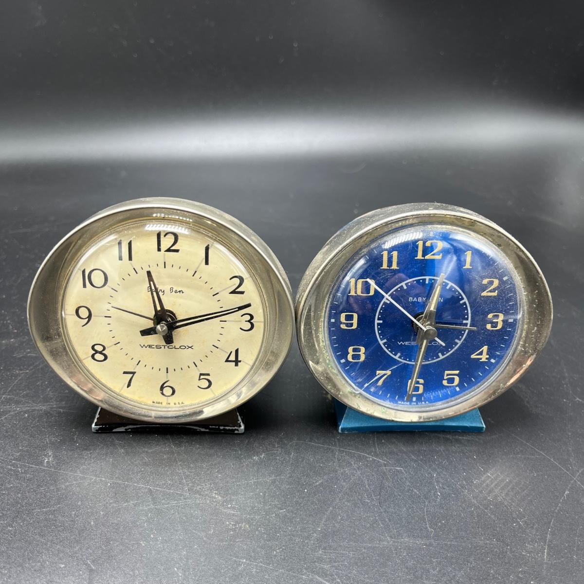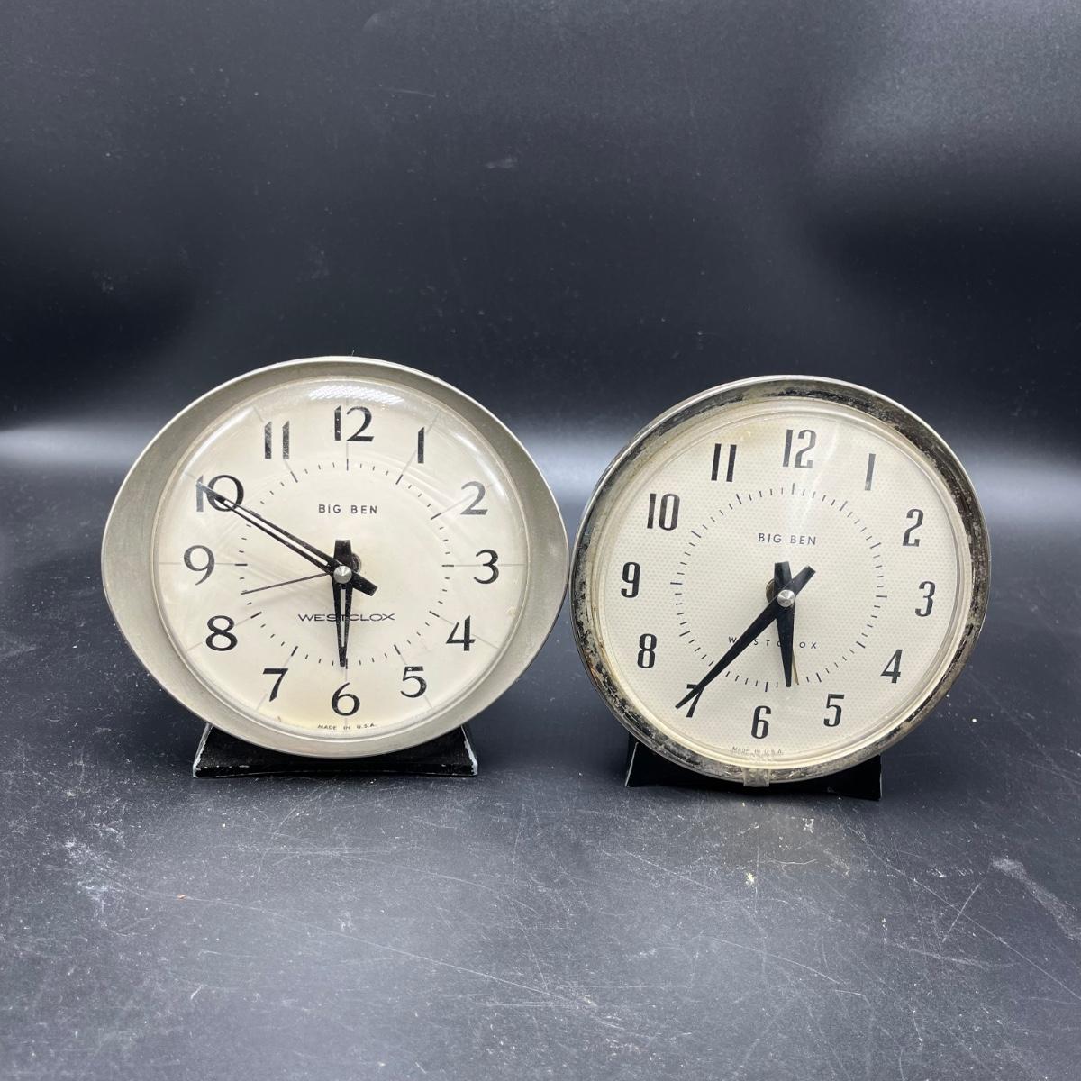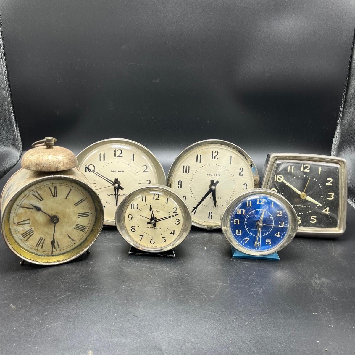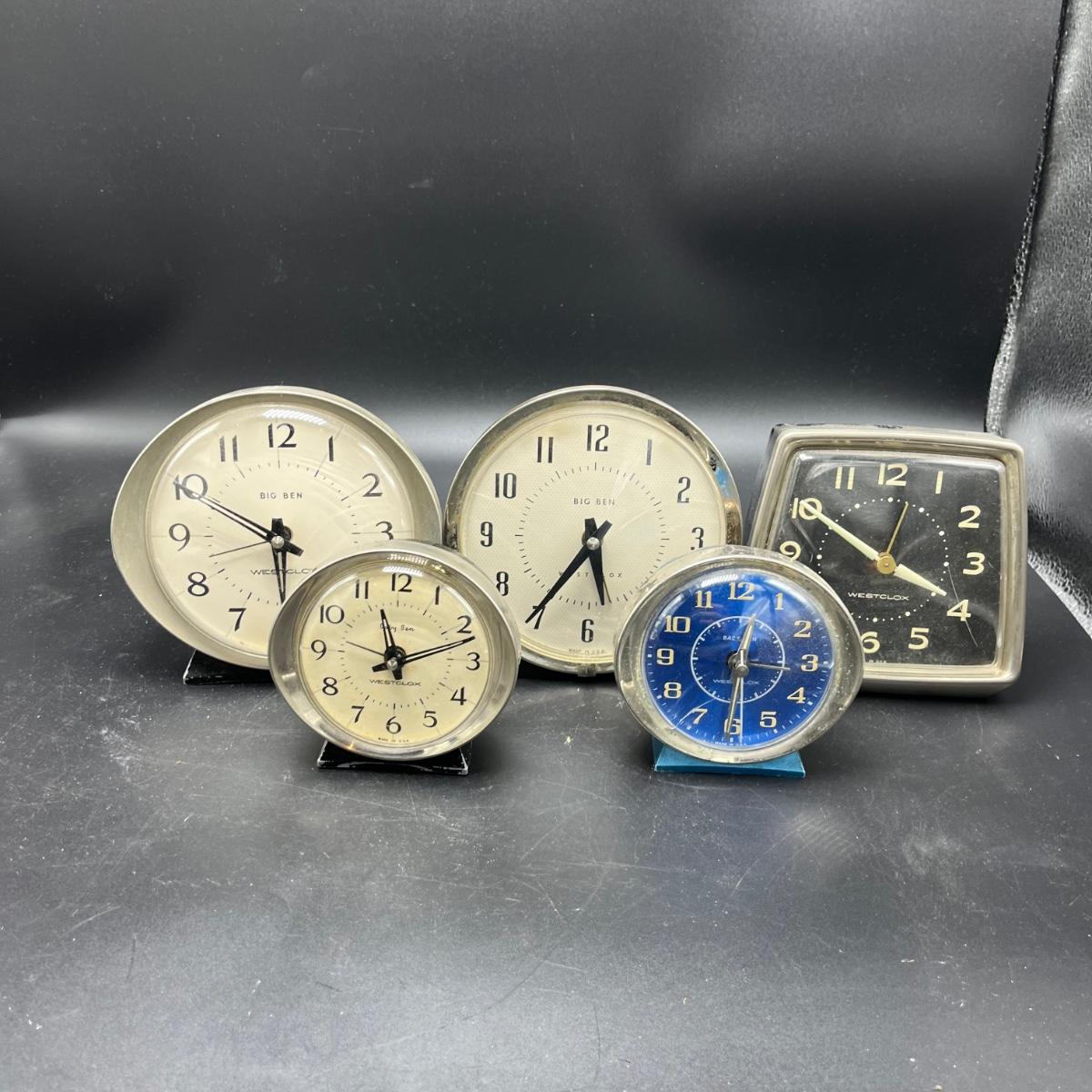 Lot includes two Westclox Big Ben alarm clocks, Two Baby Ben alarm clocks and a Westclox alarm clock. Also includes a unbranded alarm clock. Big Ben clocks measure 5”D x 2”. Baby Bens and round Big Ben worked when tested.