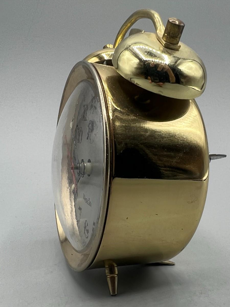 There is no significant damage to the alarm clock and is in good useable or collectible condition. The clock runs perfectly when wound up, the alarm has not been tested. Check pictures for more details and for sizing.