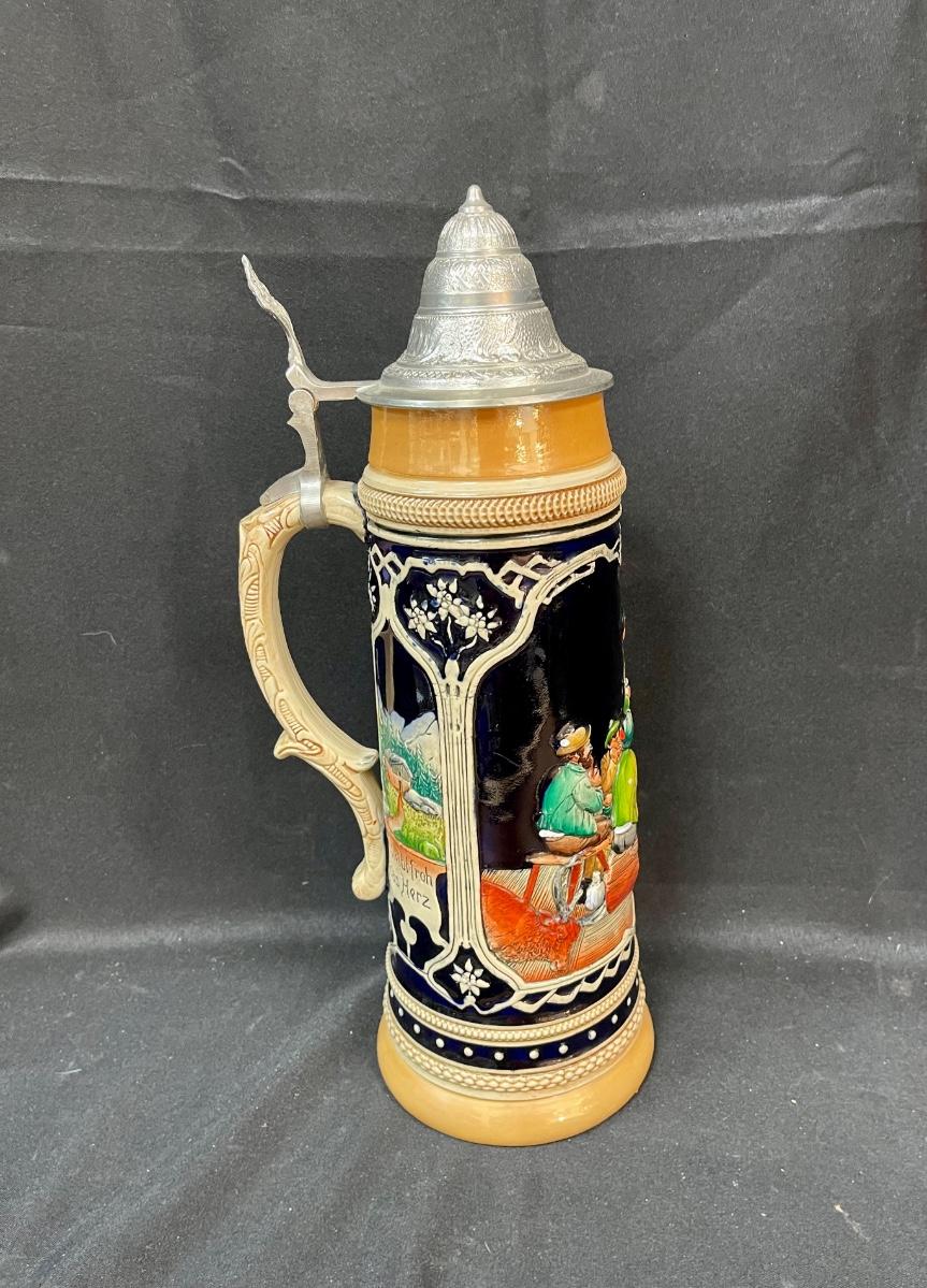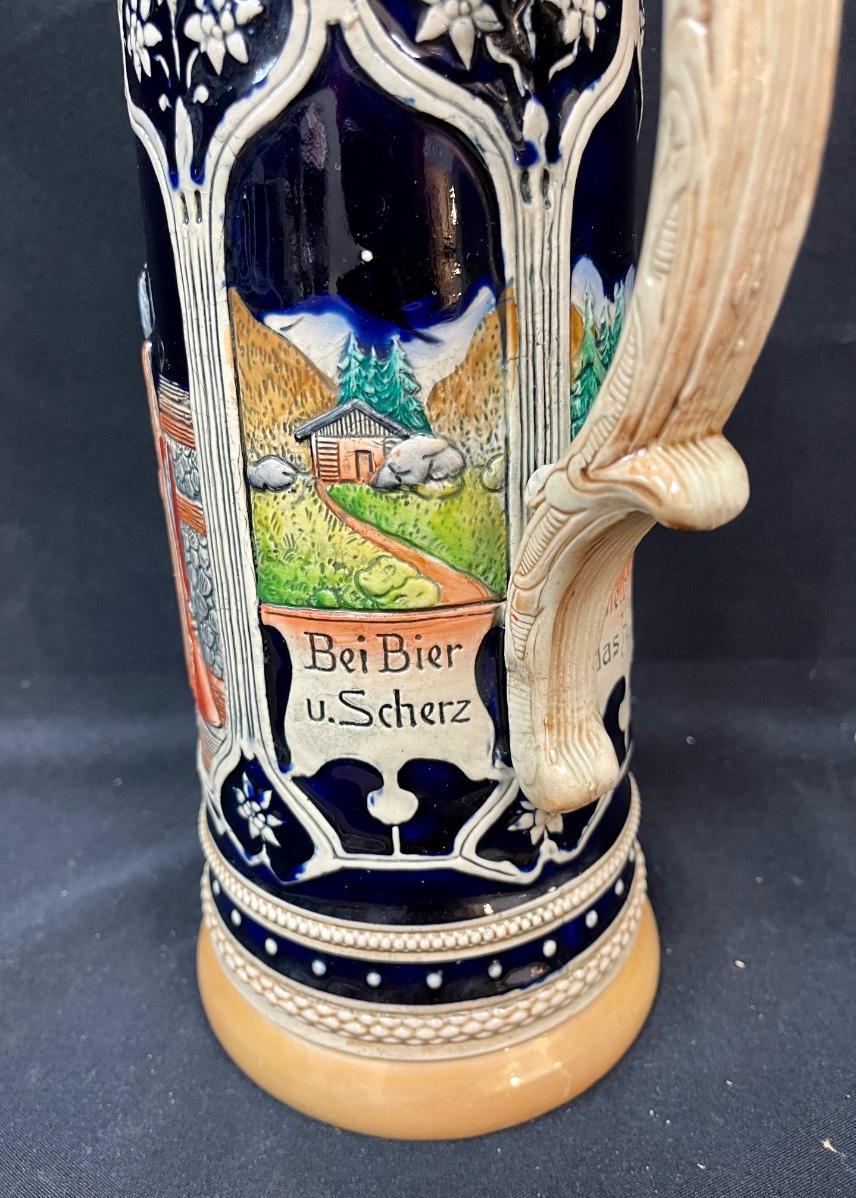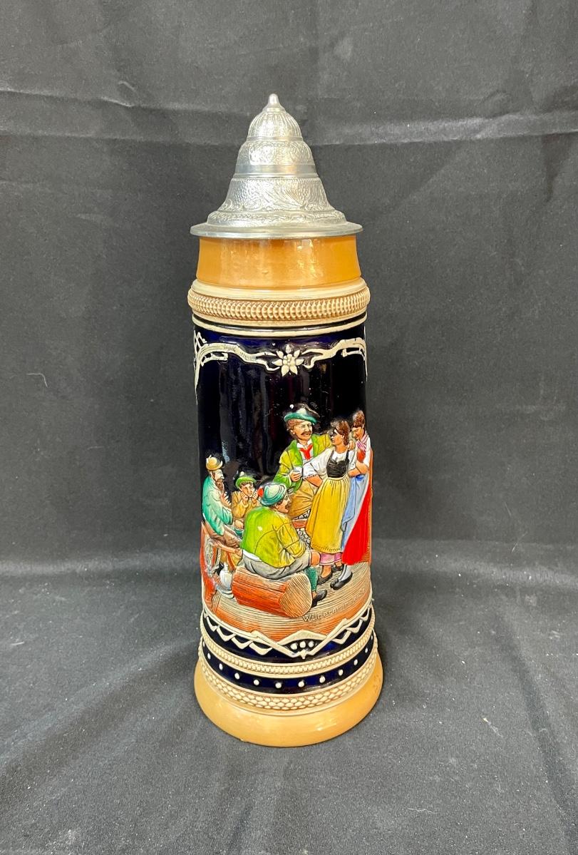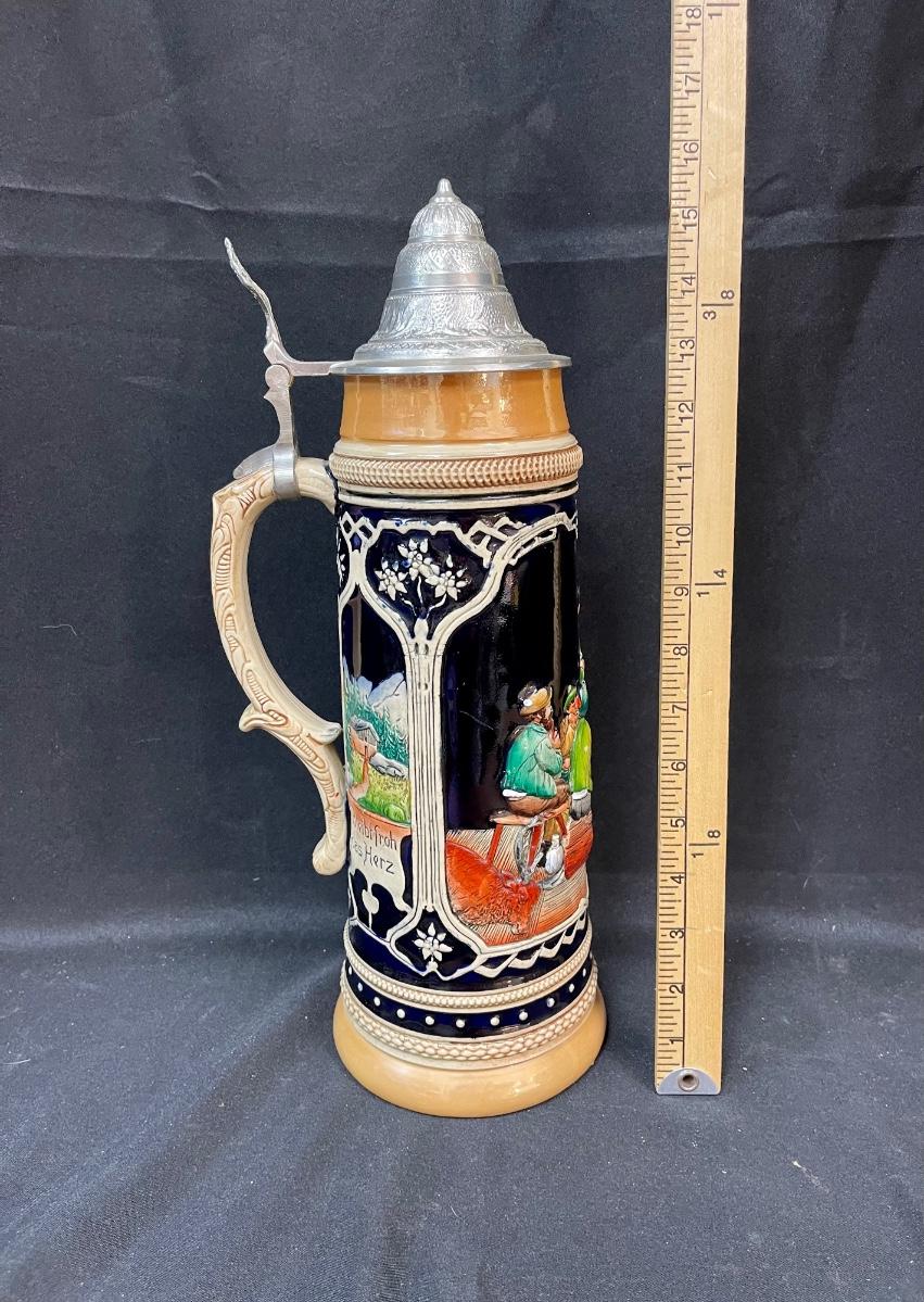 Western Germany Lidded Beer Stein 18” Tall Ceramic party scene
