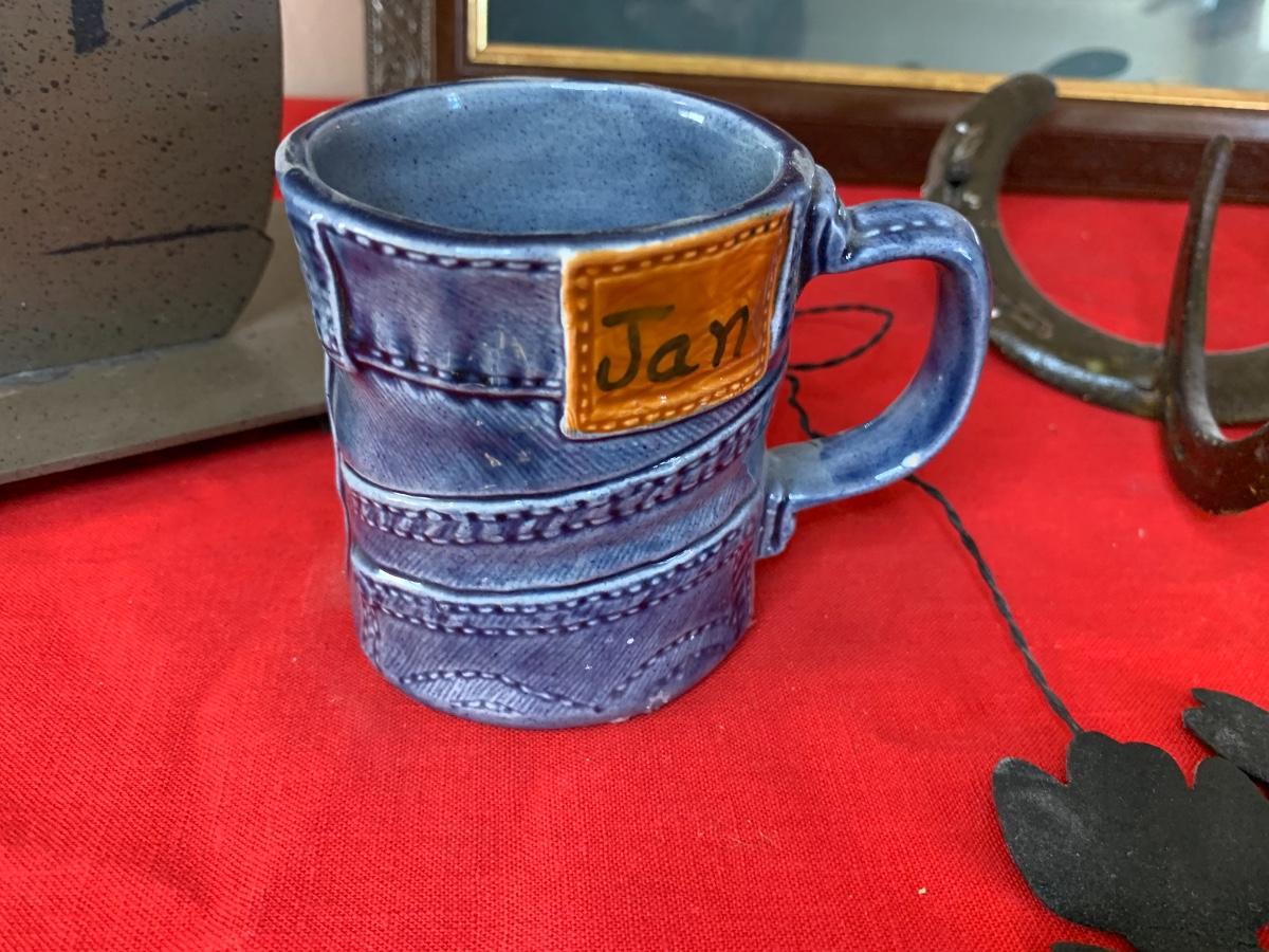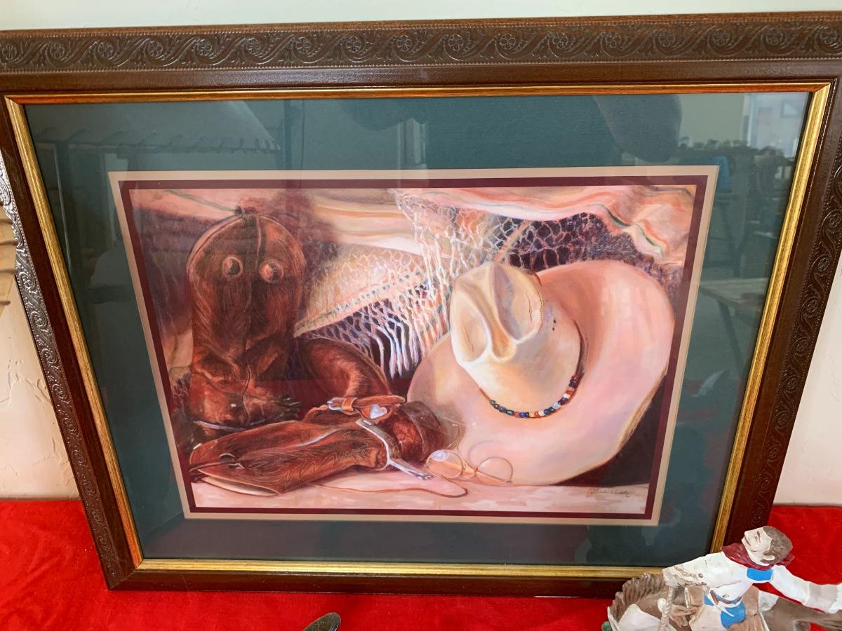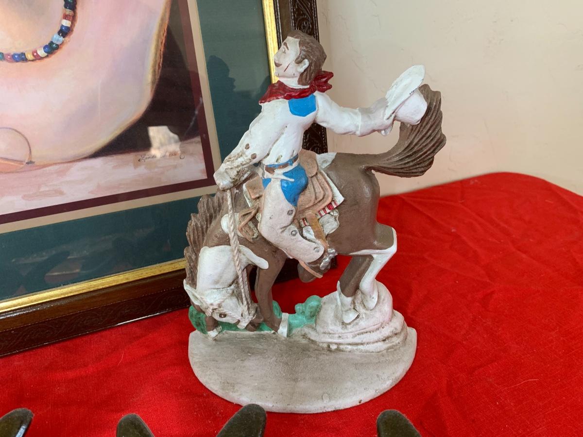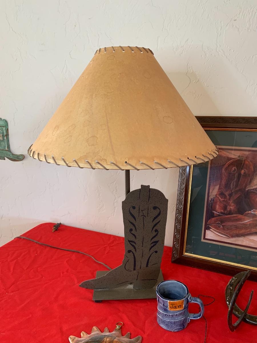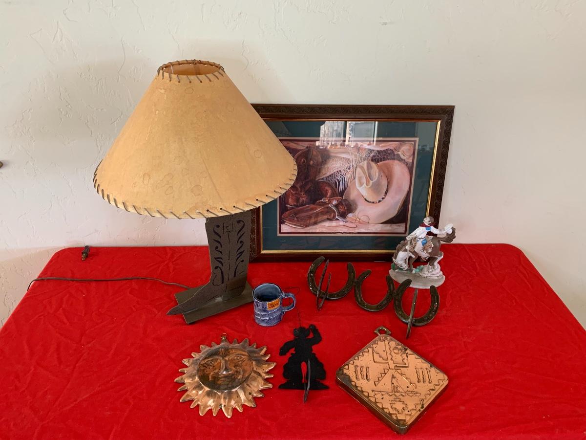 One lightweight painted metal cowboy boot table lamp with faux rawhide lamp shade with some staining, art is a Linda Wacaster cowboy art print with professional mat and frame, one welded horseshoe towel rack, one blue jean ceramic mug with “Jan”, one Midwest Importers cast iron doorstop, one black tin cowboy decor piece and two tarnished copper wall hangings.