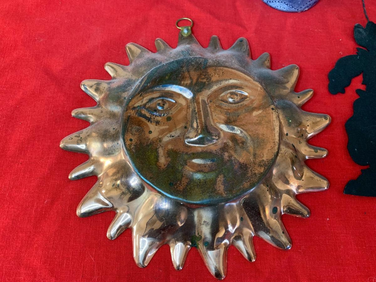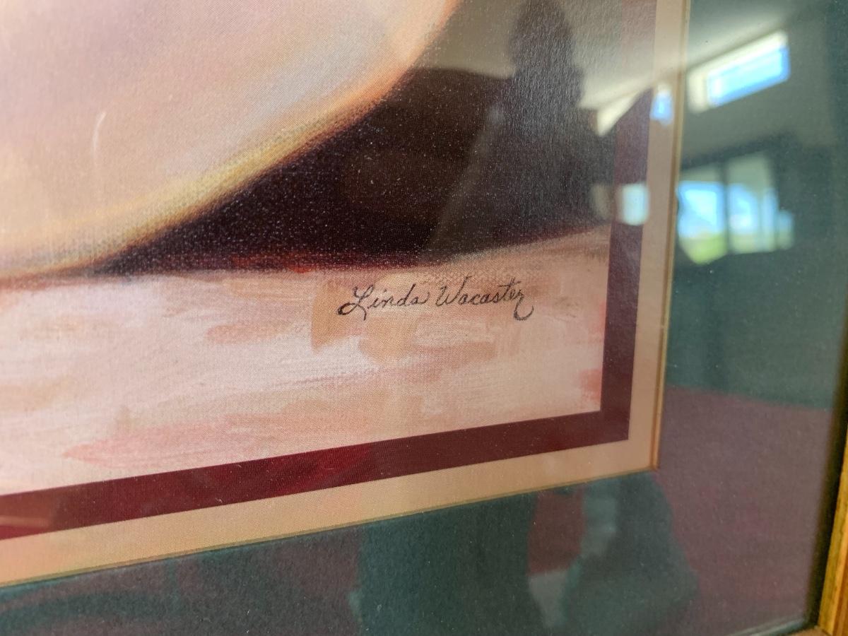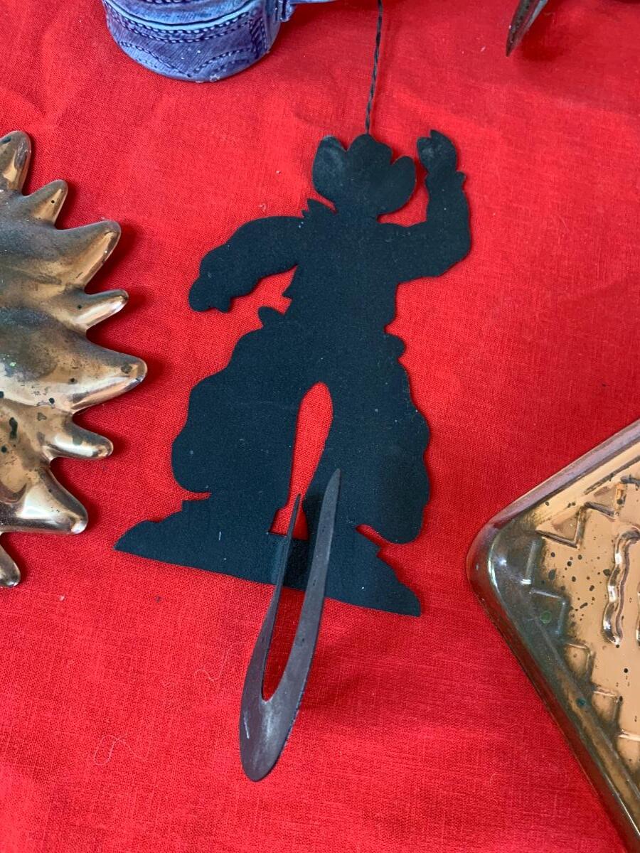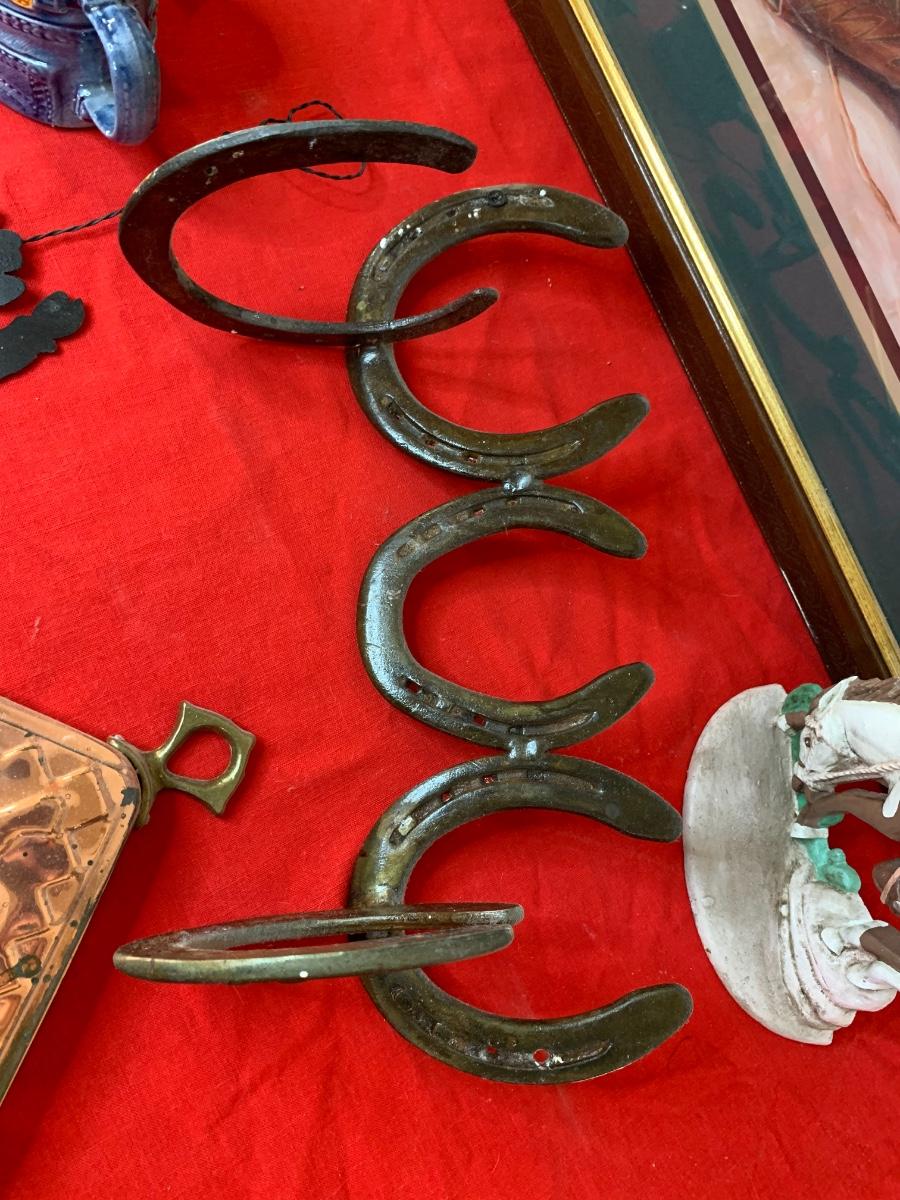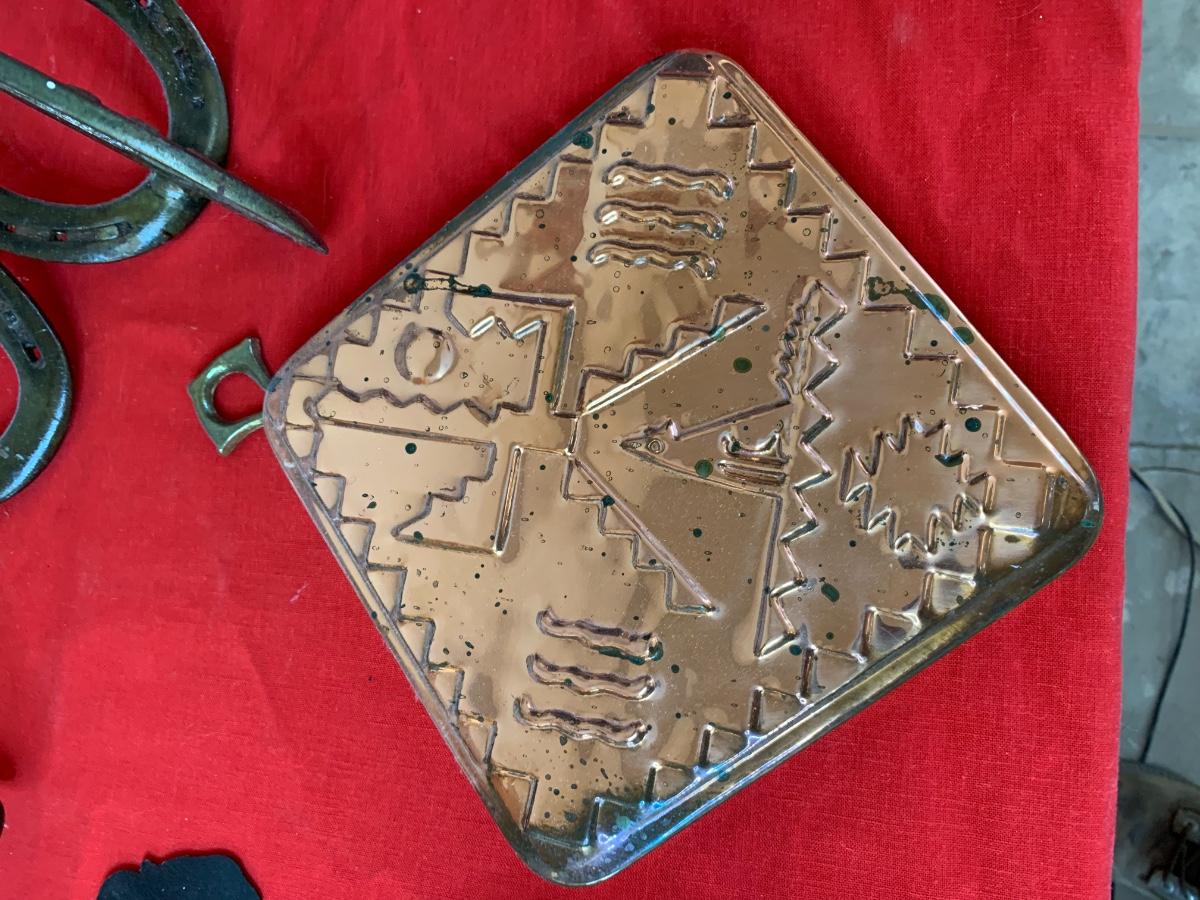 One lightweight painted metal cowboy boot table lamp with faux rawhide lamp shade with some staining, art is a Linda Wacaster cowboy art print with professional mat and frame, one welded horseshoe towel rack, one blue jean ceramic mug with “Jan”, one Midwest Importers cast iron doorstop, one black tin cowboy decor piece and two tarnished copper wall hangings.