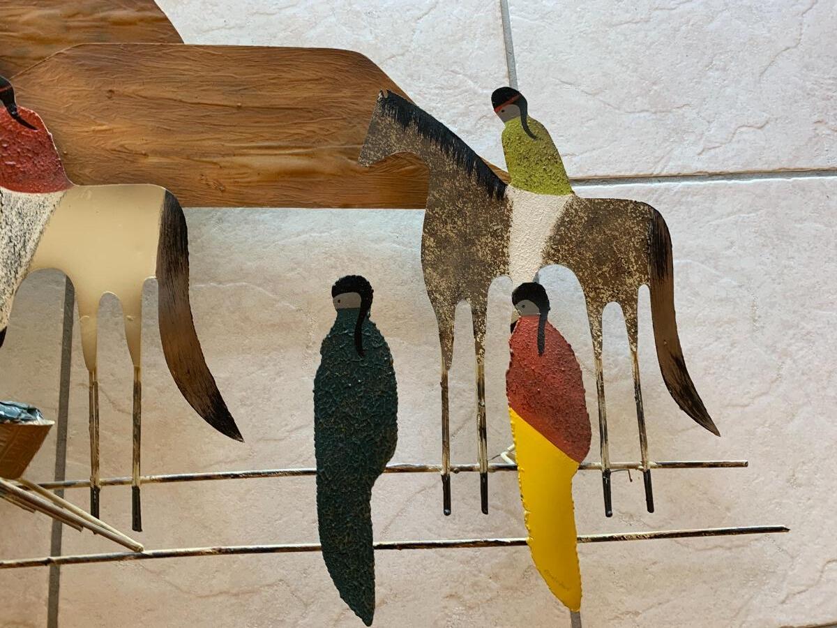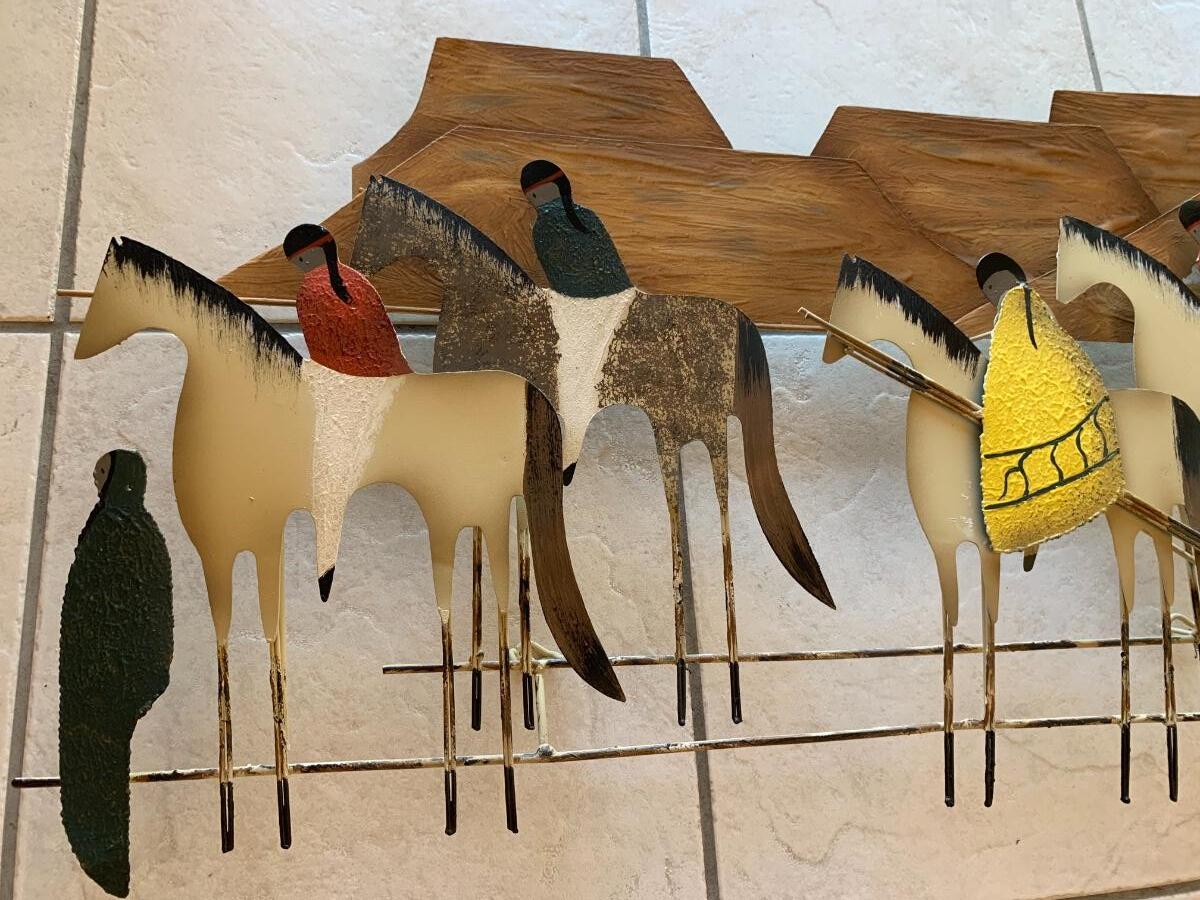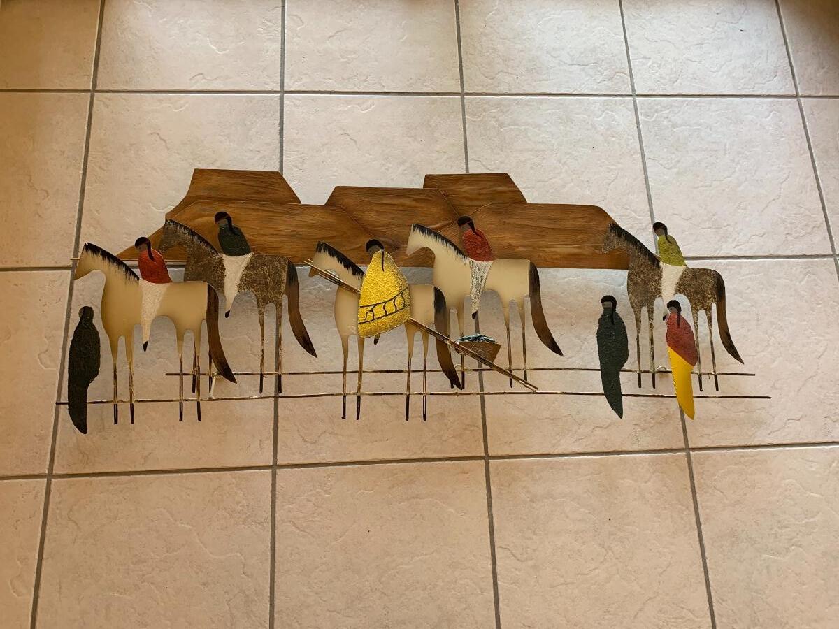 One signed 3D wall hanging metal decor piece, depicting native peoples and their animals in great condition. (53 1/2 inches in length, 21 1/2 inches in height. Both measurements measured at tallest points)