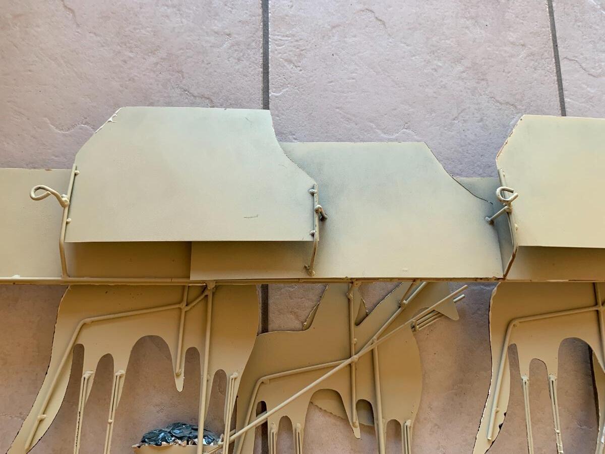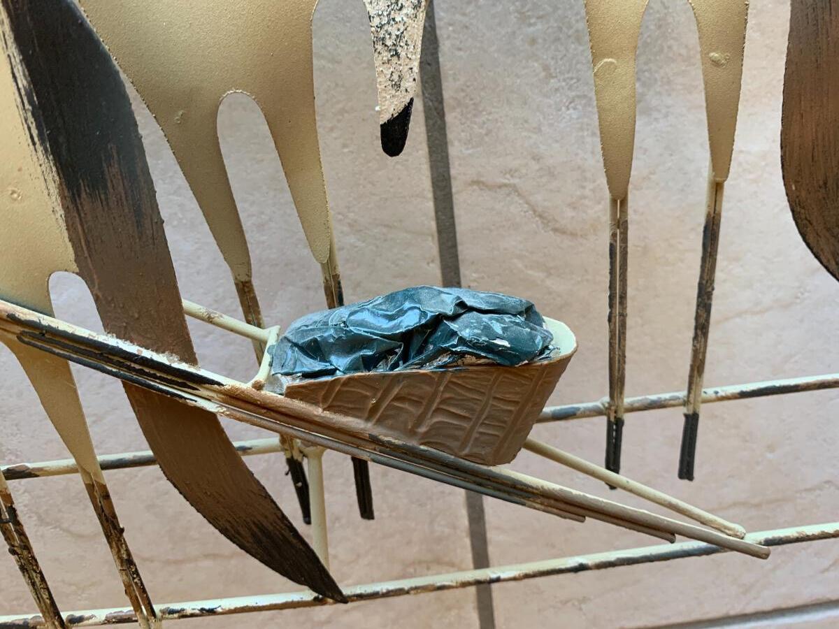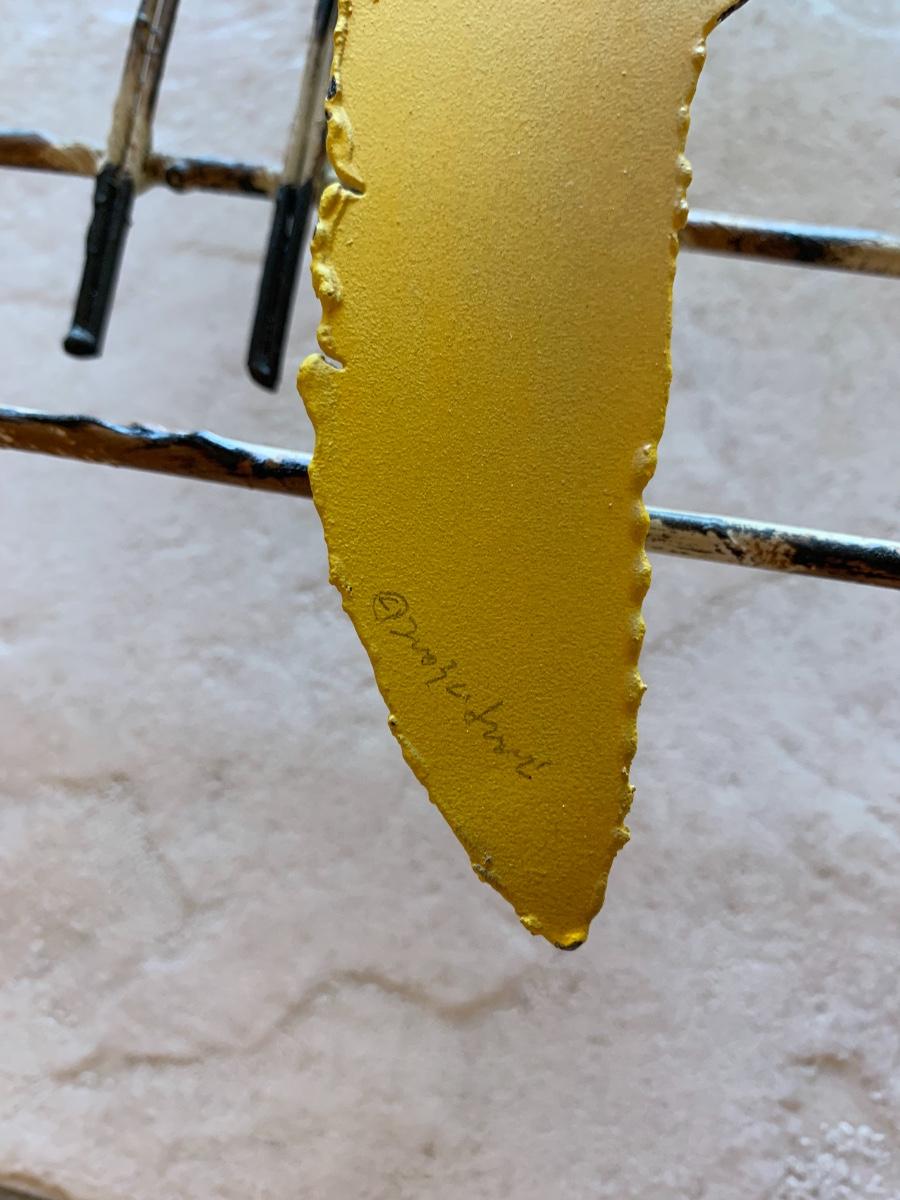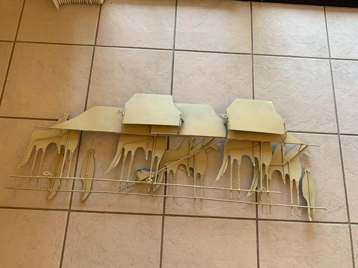 One signed 3D wall hanging metal decor piece, depicting native peoples and their animals in great condition. (53 1/2 inches in length, 21 1/2 inches in height. Both measurements measured at tallest points)