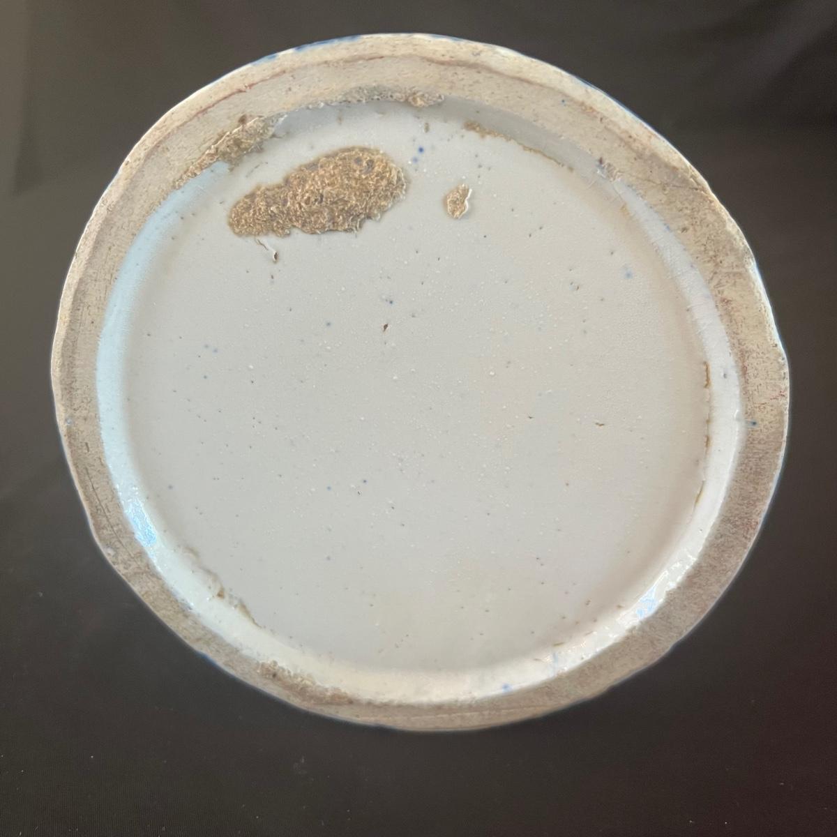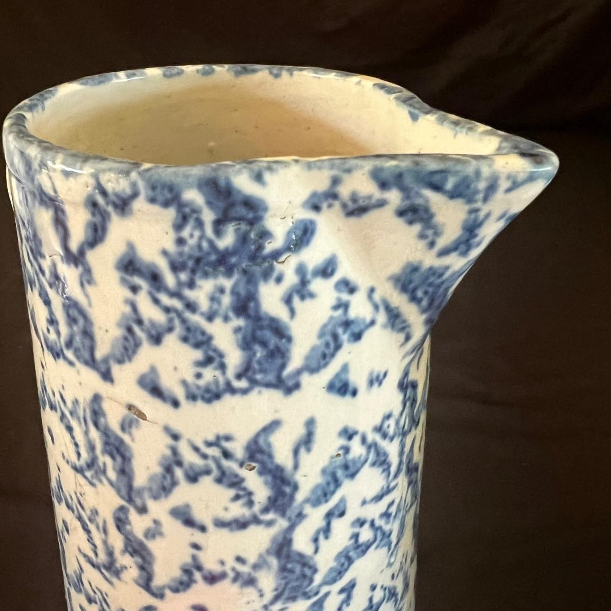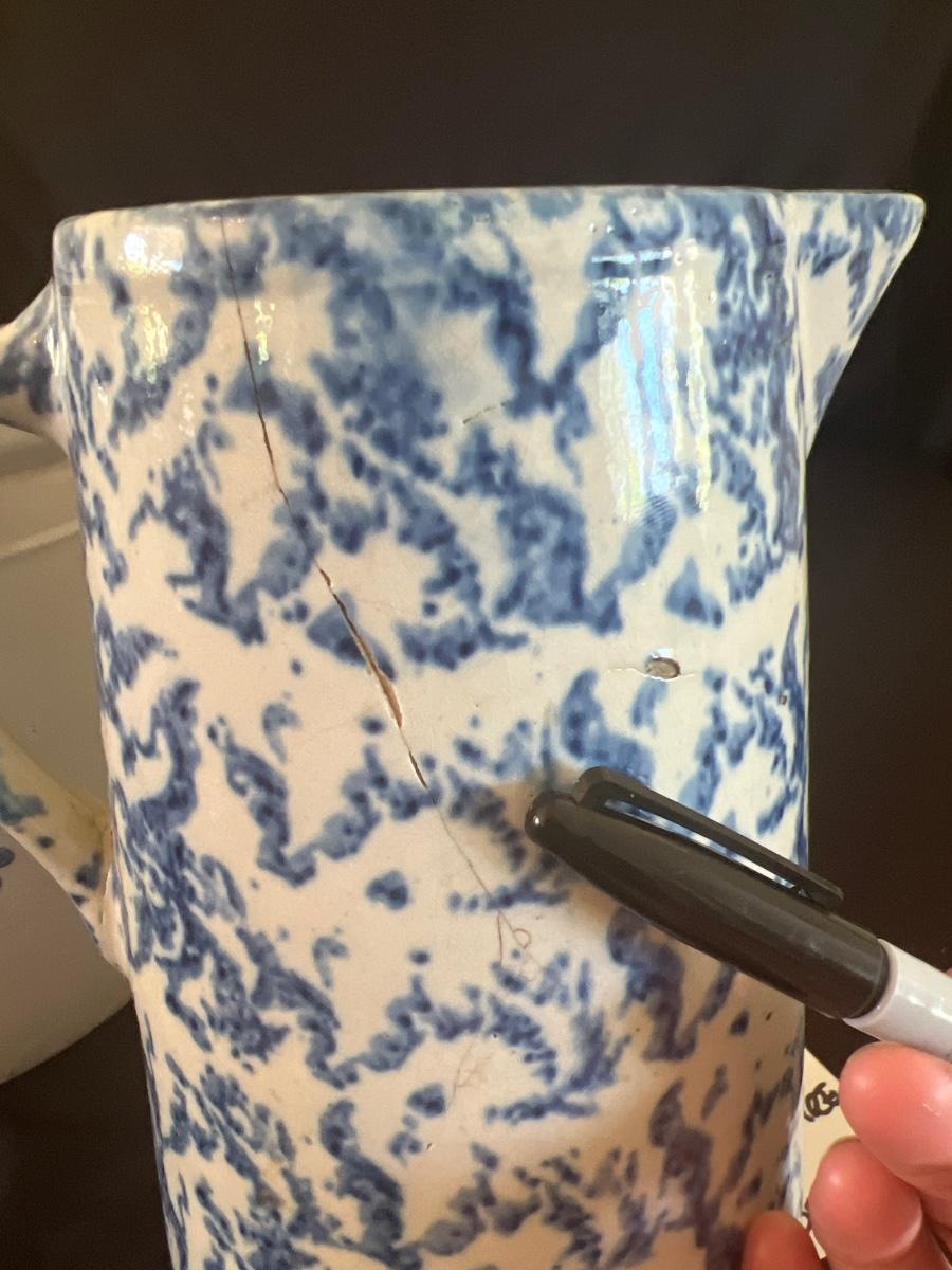 Two stoneware items includes a crock that appears to be Western Stoneware Blue Flowers but it does not have any identifying marks; it has some dark stains on the rim that may scrub clean. The blue and white spongeware pitcher has a chip and a deep crack that starts at the rim and goes about half way down the body.