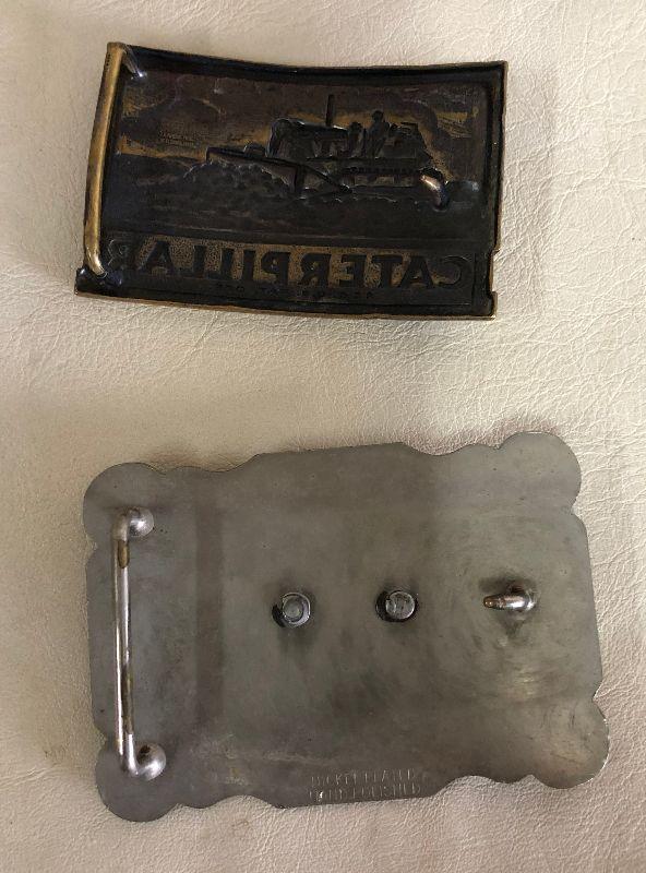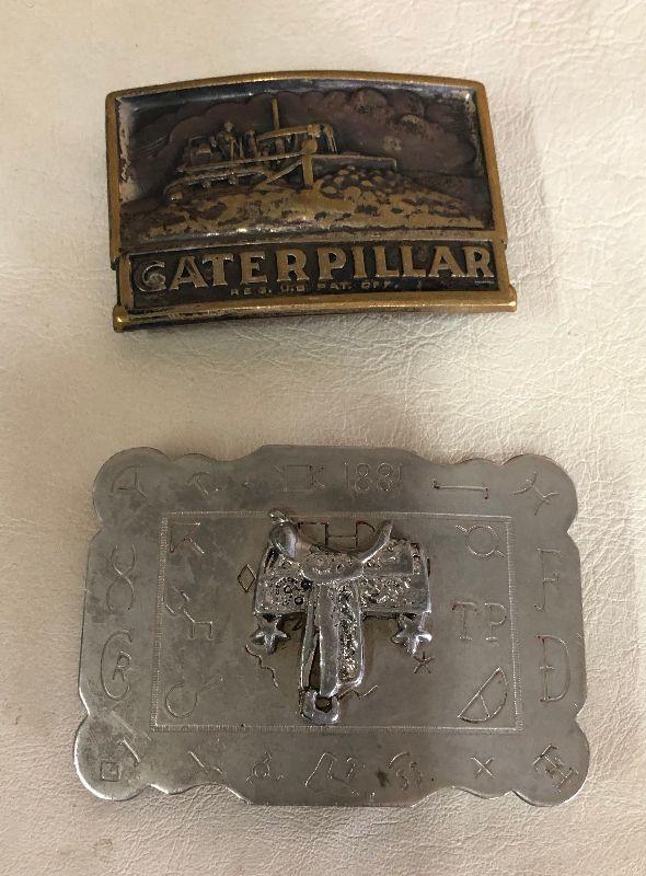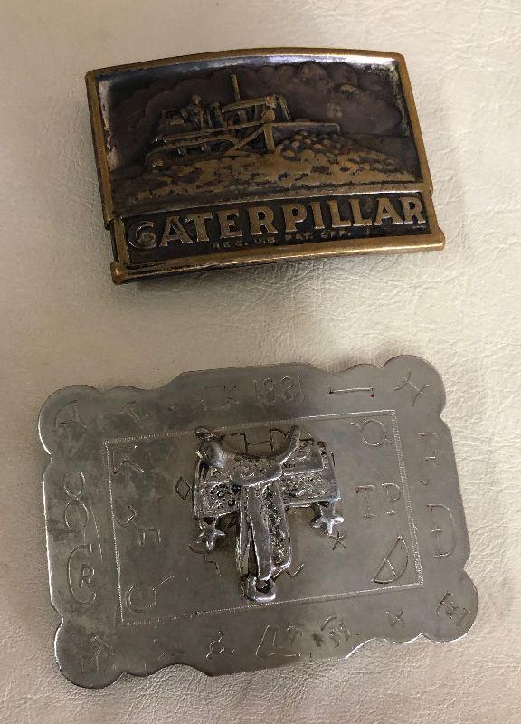 Here are a pair of vintage men's belt buckles..a brass one for Caterpillar equipment and a western saddle on polished nickel silver...as shown..normal use...