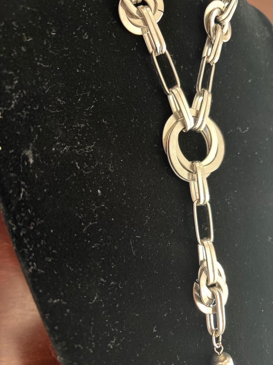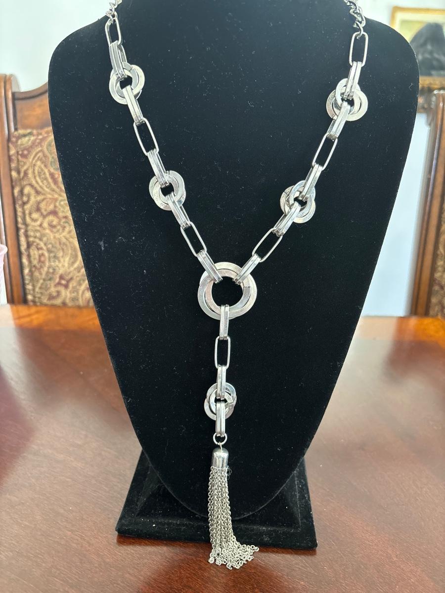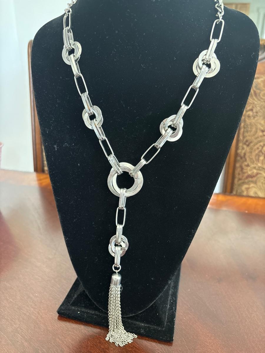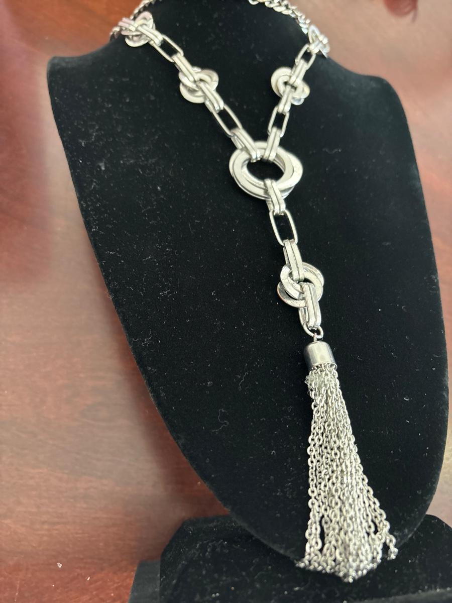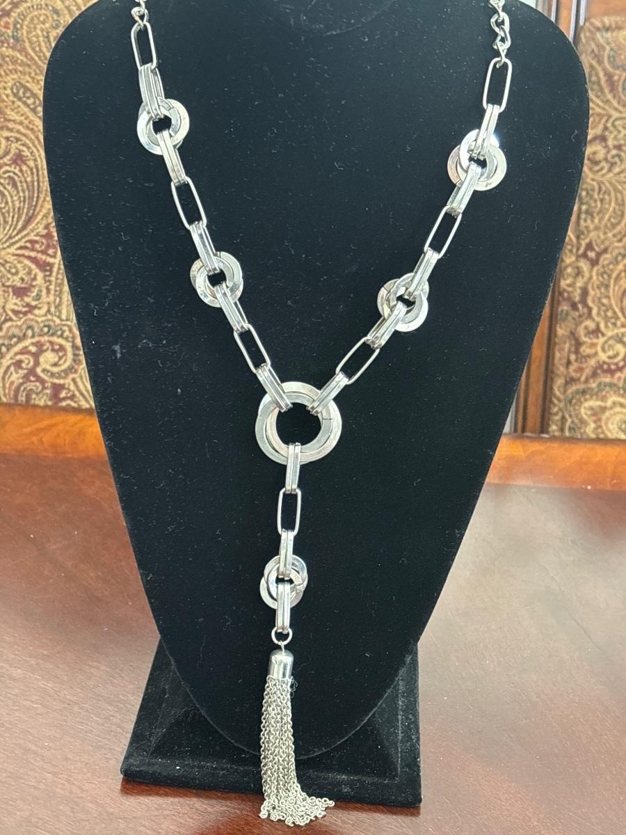 Western style long chain, silver tone, tie, tassel necklace