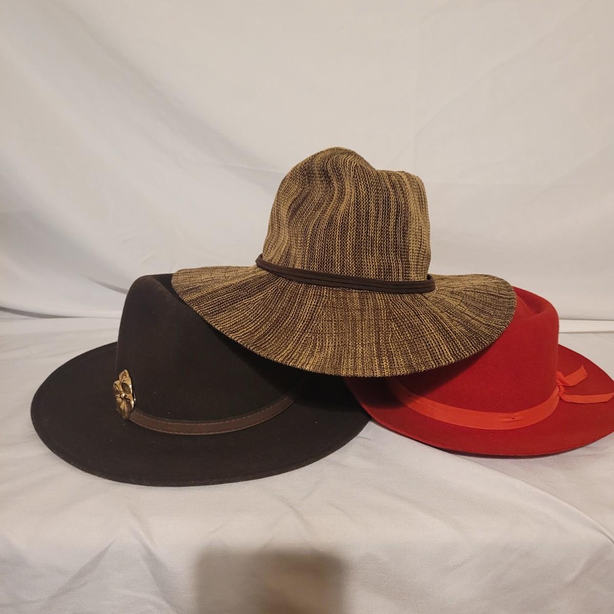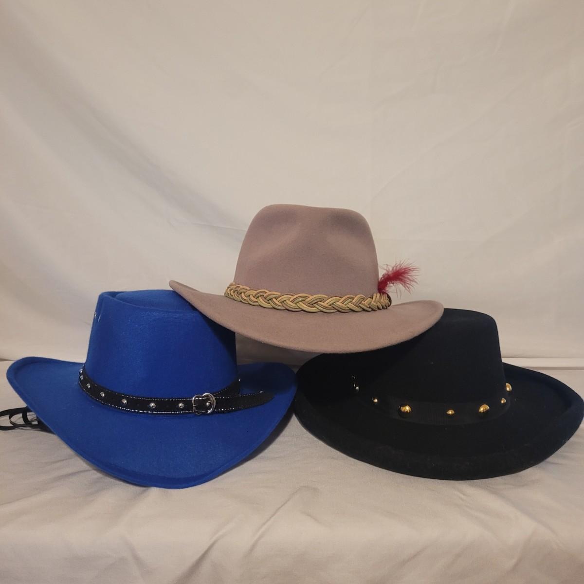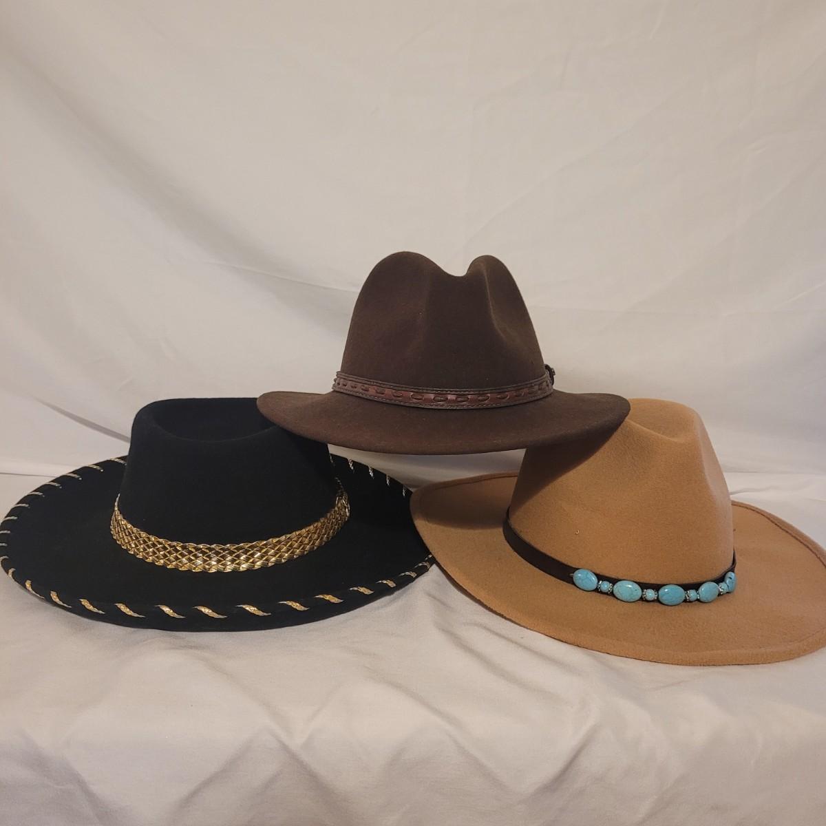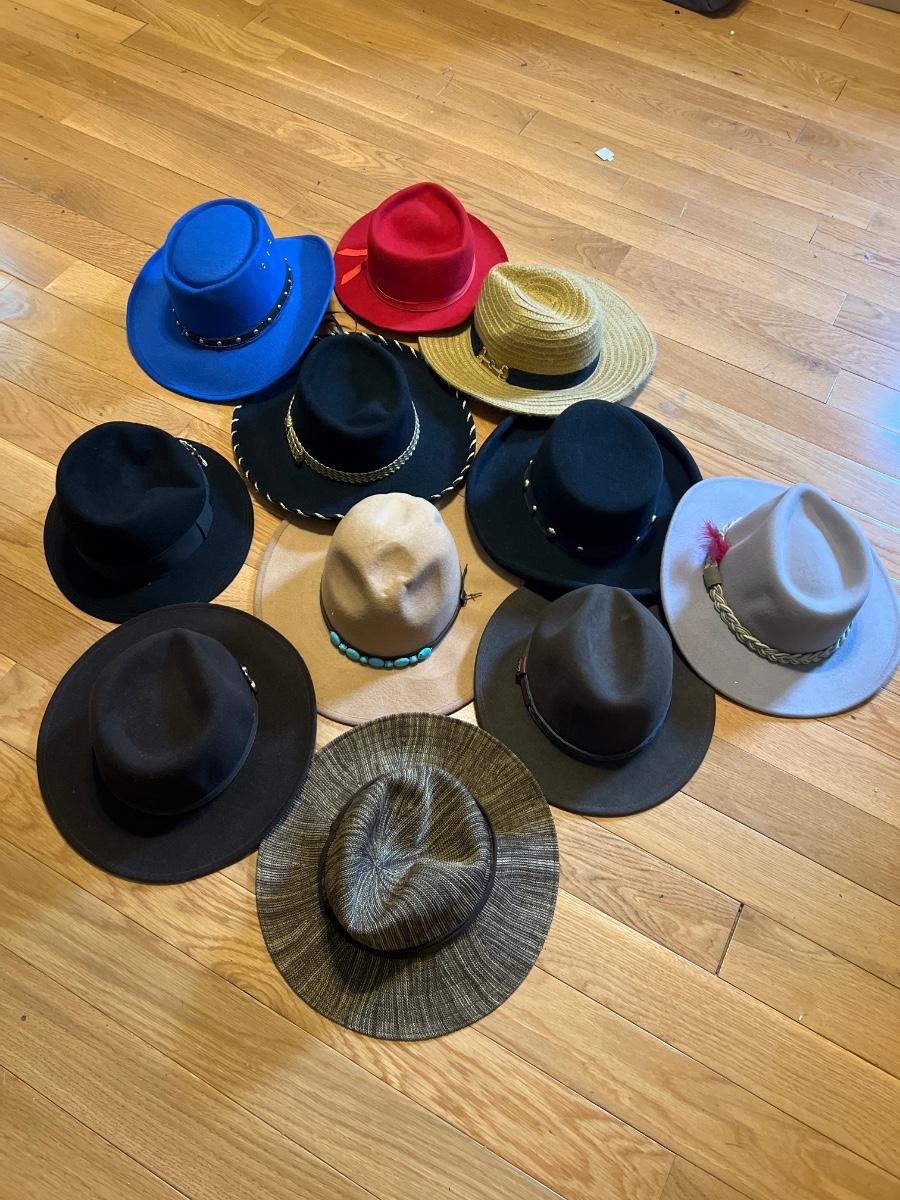 A wide variety of western hats in this lot includes fedoras, cowboy hats and more. 11 hats total. Shipping available.