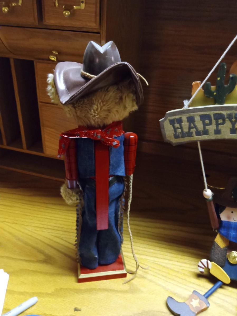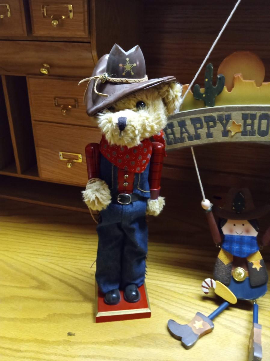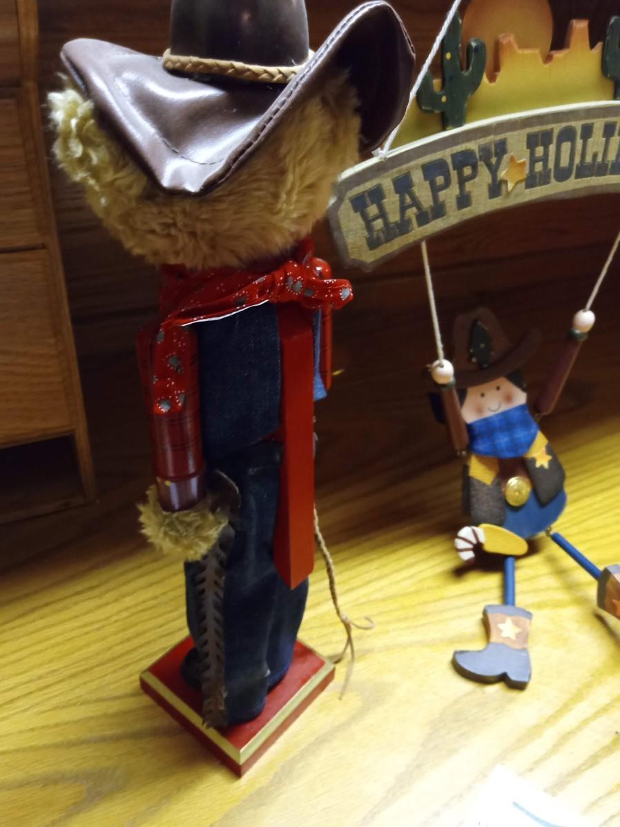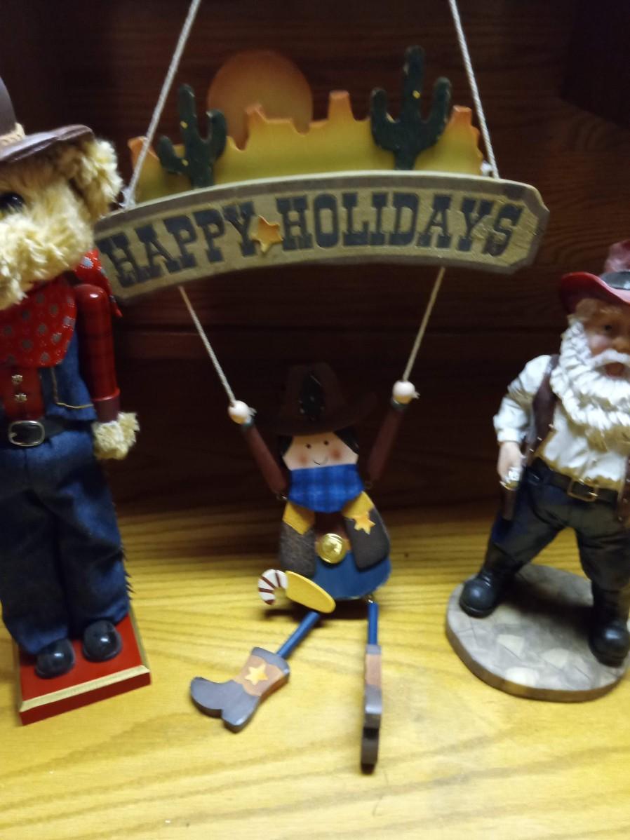 COWBOY BEAR NUT CRACKER, COWBOY SANTA AND A HANGING COWBOY