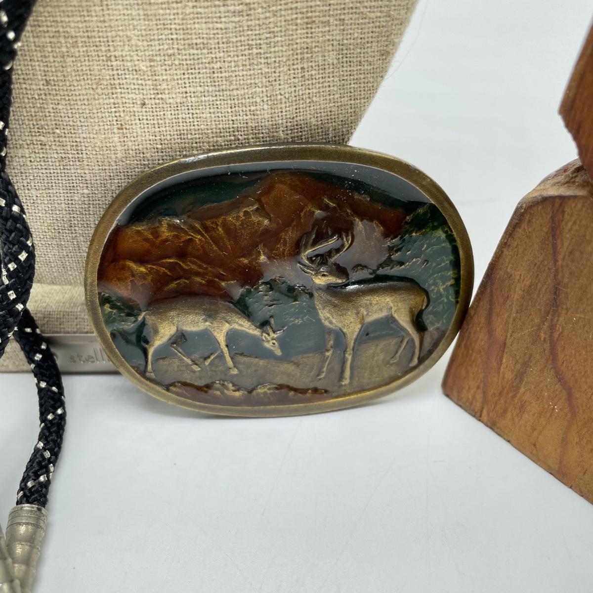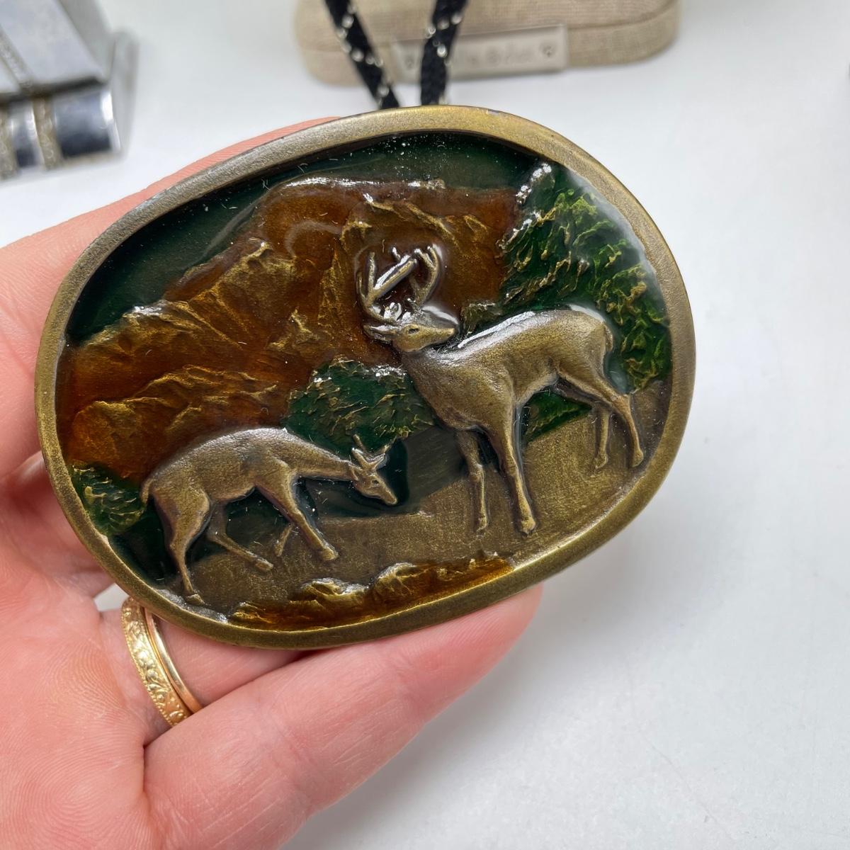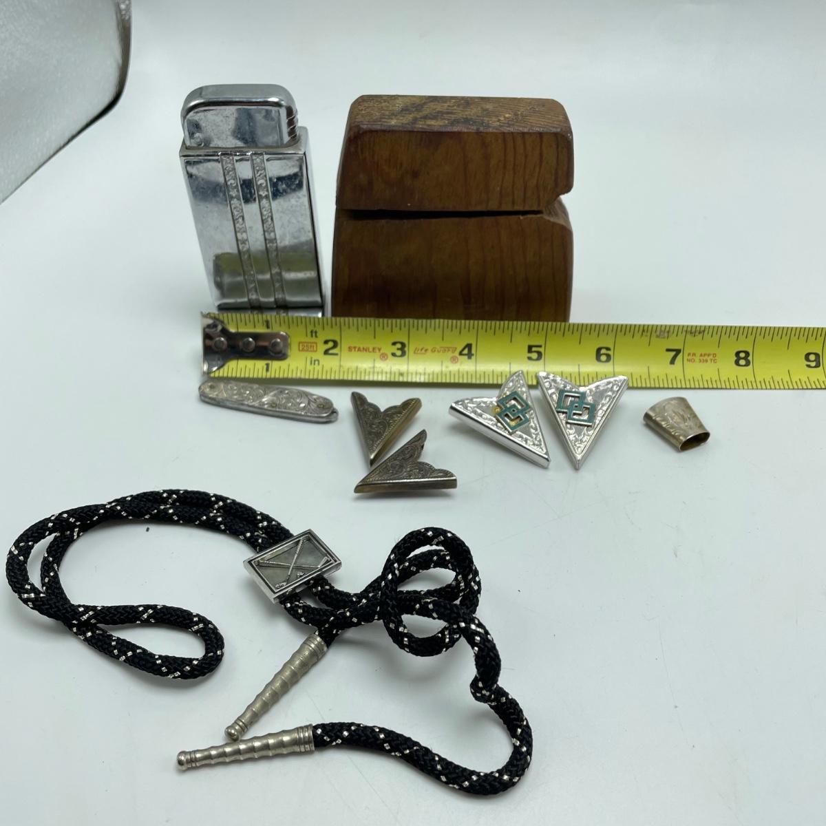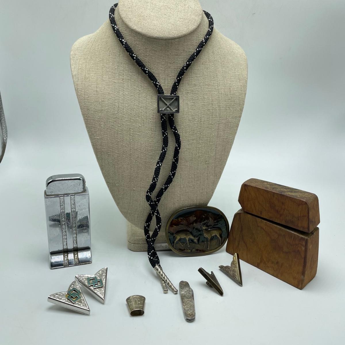 A heavy brass belt buckle appears to be hand painted with a clear coat of resin to protect it. Lot includes a Swank bolo, two sets of collar tips and two vintage lighters. Lot also features two sterling pieces- a pocket knife and another western tie accessory. The pocket knife appears somewhat swollen and will not currently open. See images. Shipping available.