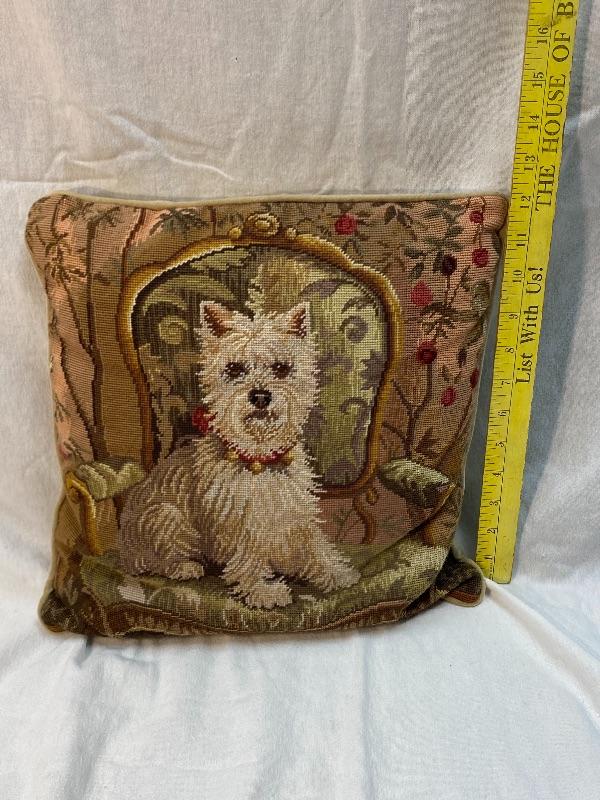 White Westie dog sitting upon a chair needlepoint throw pillow. About 12" size, no fringe. Beige velour back. Good condition.
