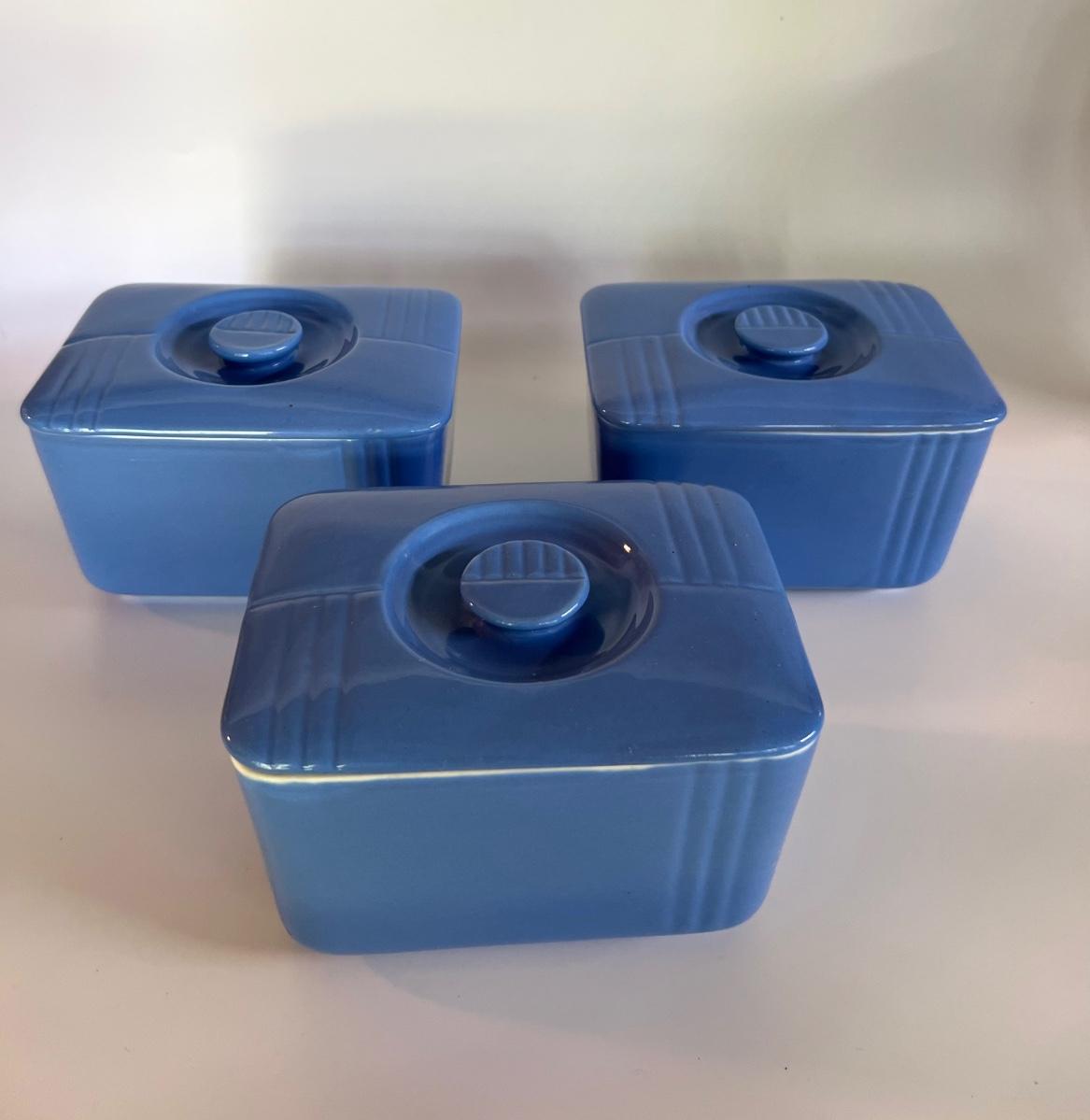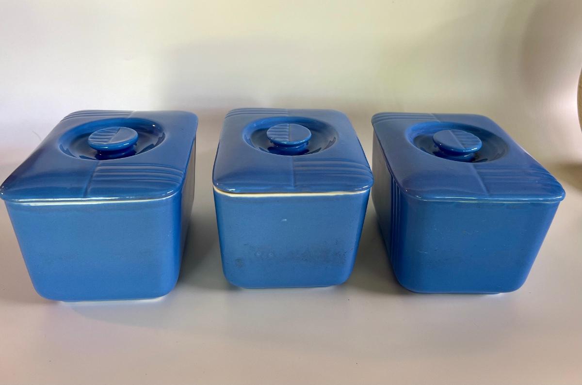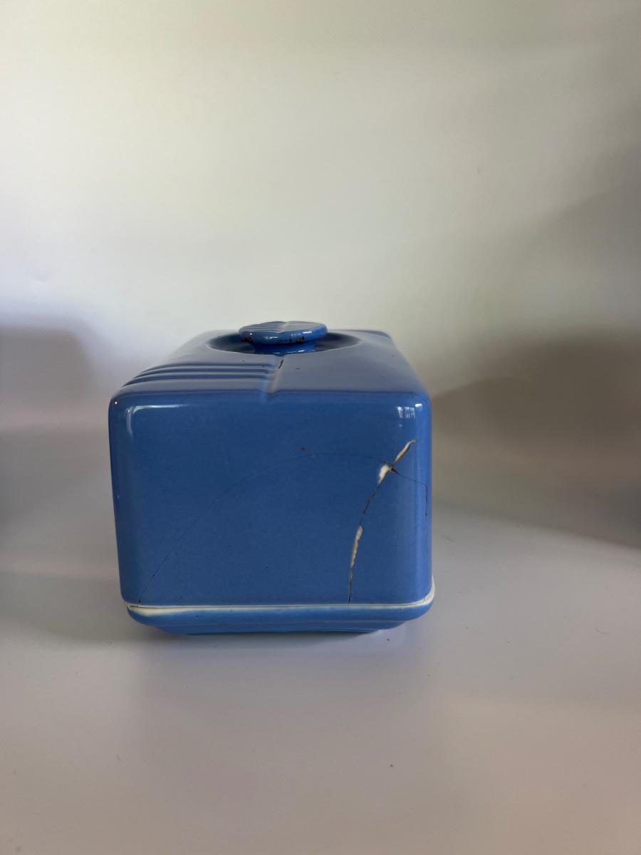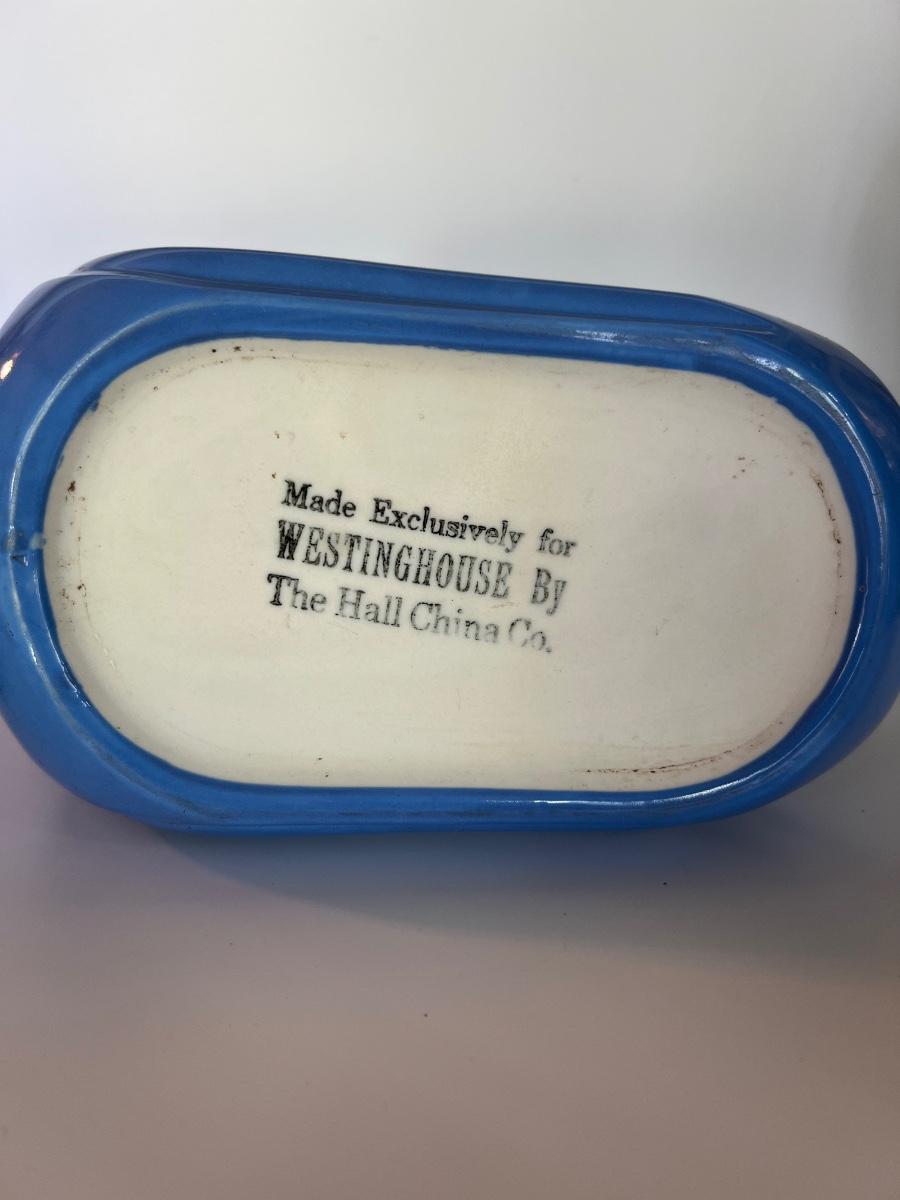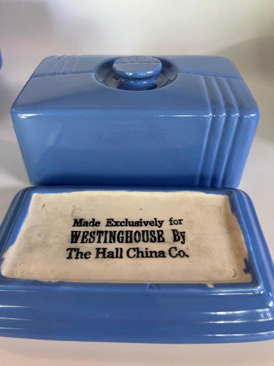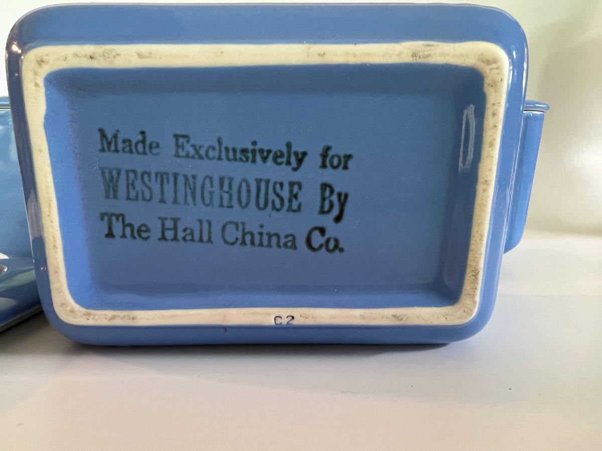 WESTINGHOUSE Blue Refrigerator Water Server measures 10 1/2 inches long and 5 inches tall, Three refrigerator covered dishes measure 6 inches long and 4 inches tall & Butter dish measures 7 inches long and 4 inches tall. Butter dish has a crack as pictured and a small chip on the inside of the dish.