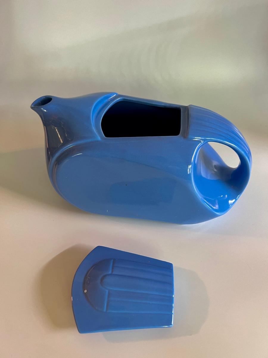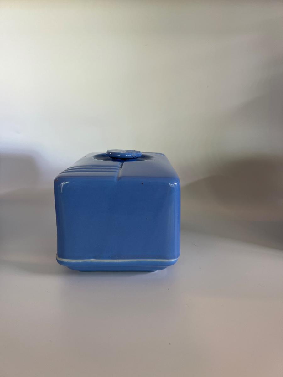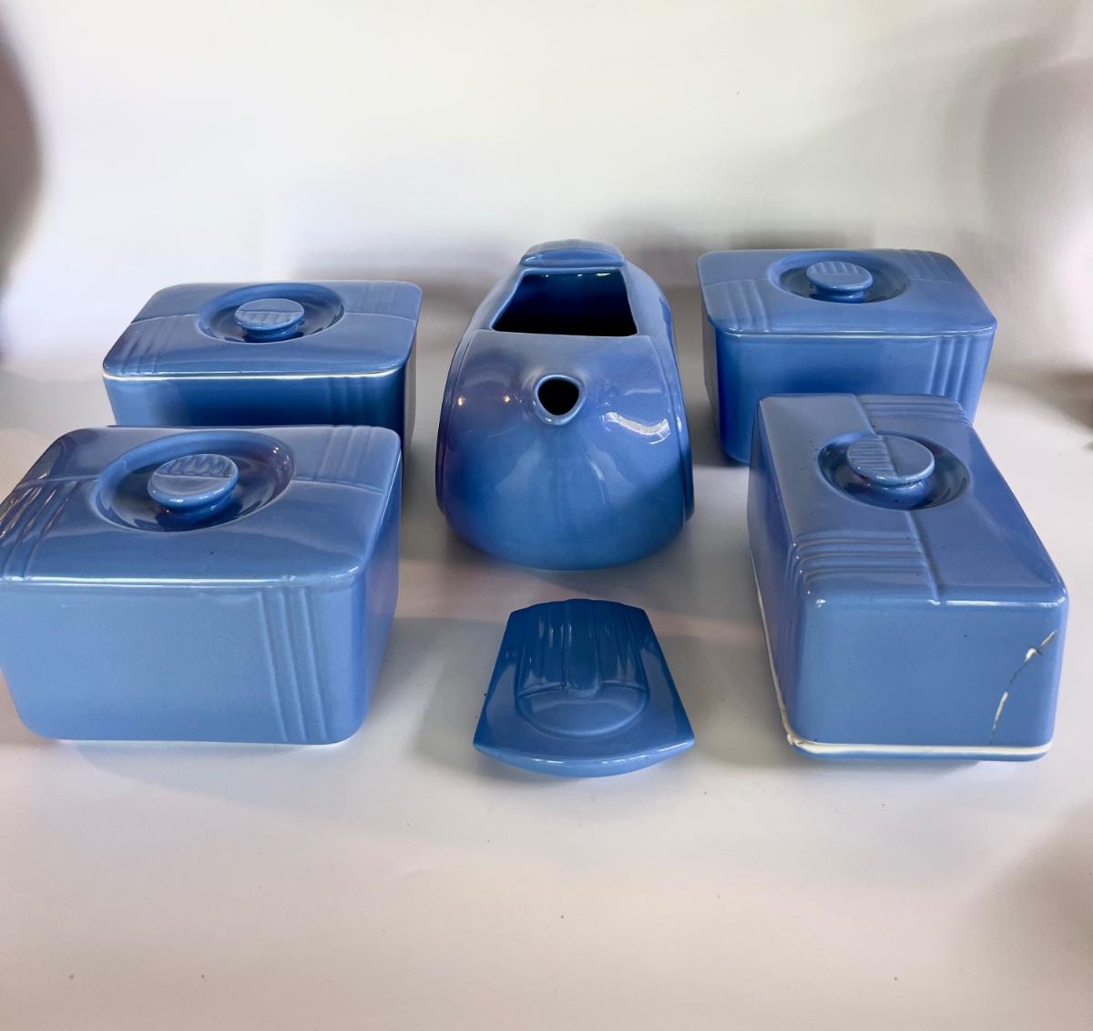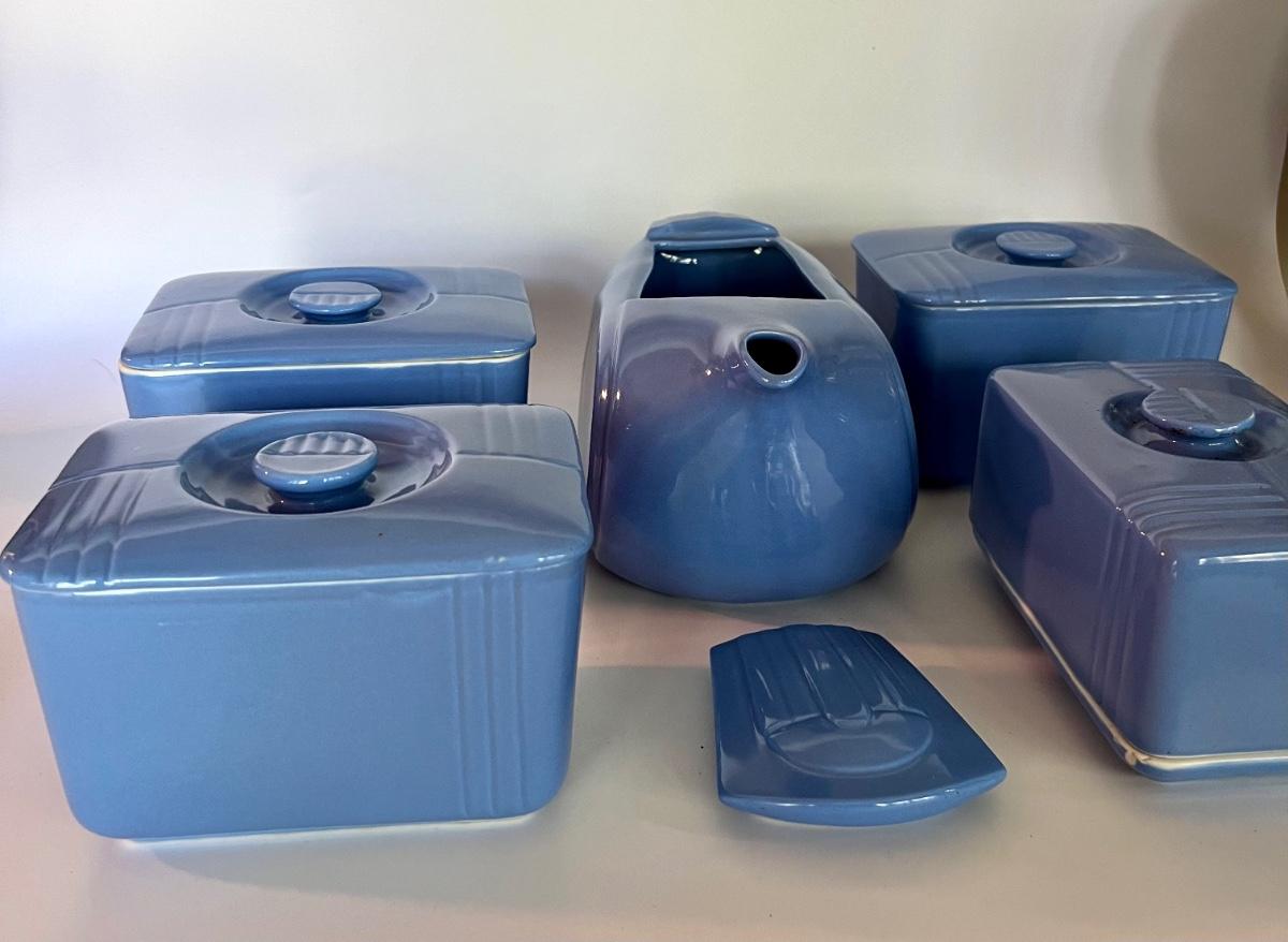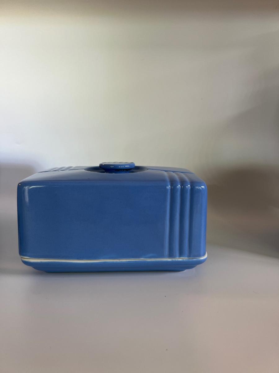 WESTINGHOUSE Blue Refrigerator Water Server measures 10 1/2 inches long and 5 inches tall, Three refrigerator covered dishes measure 6 inches long and 4 inches tall & Butter dish measures 7 inches long and 4 inches tall. Butter dish has a crack as pictured and a small chip on the inside of the dish.
