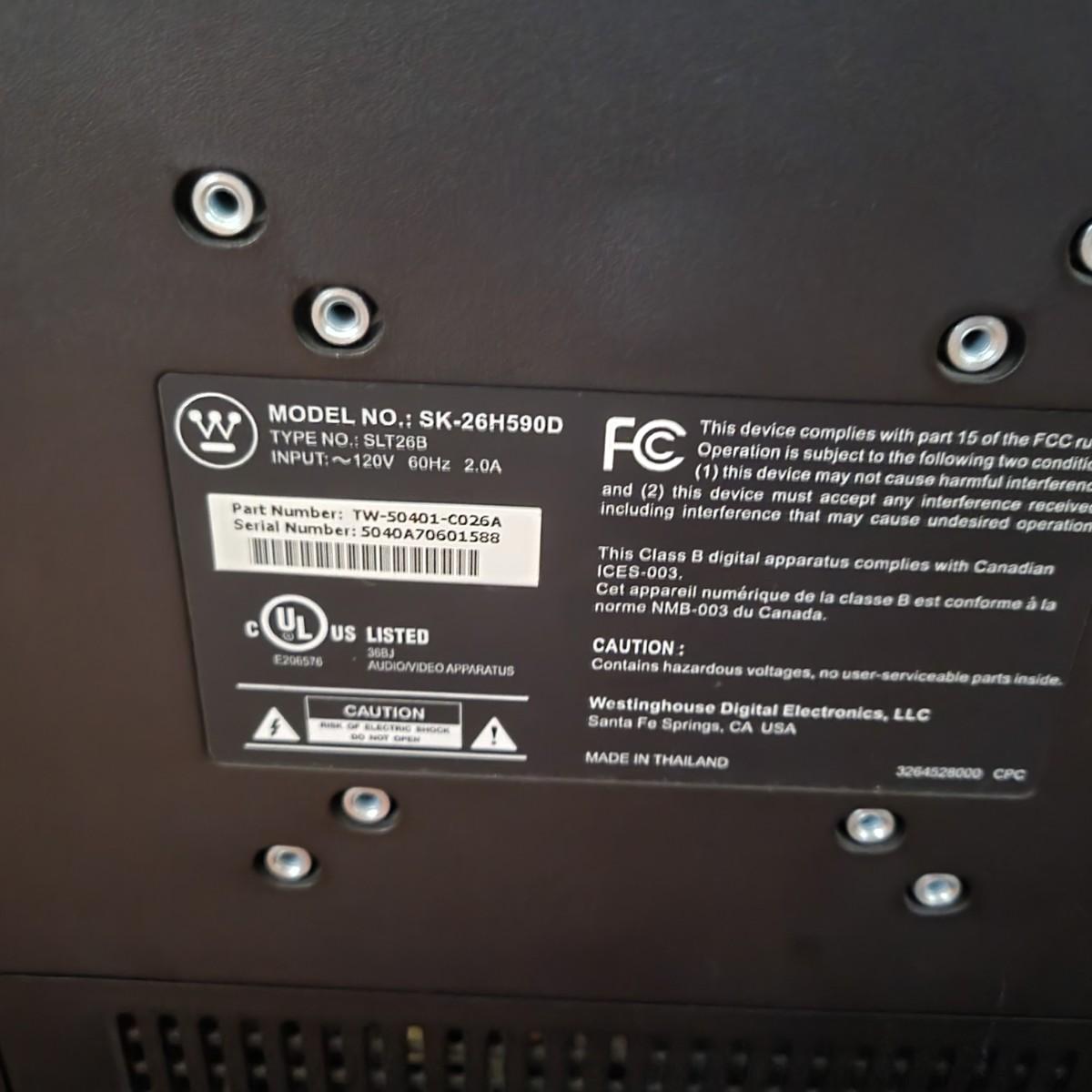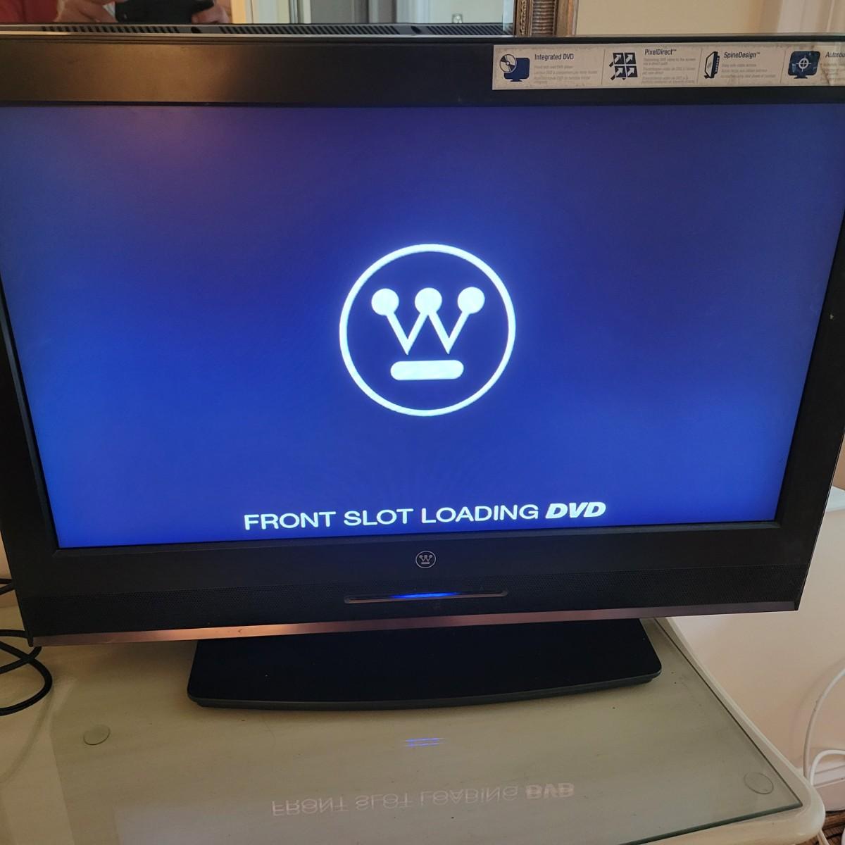 26" Westinghouse TV with integrated DVD player. TV was tested and did turn on. Approximately 26" x 5" x 20" OD. 19". Remote included. Local pickup only