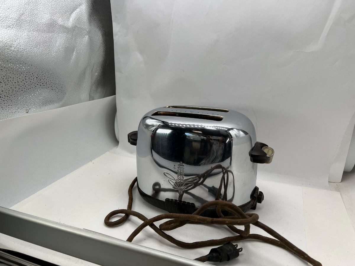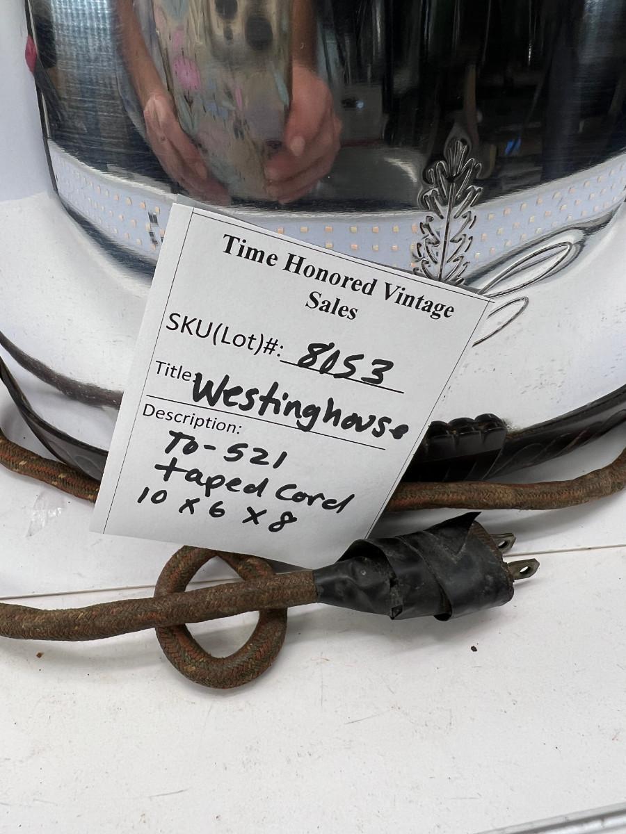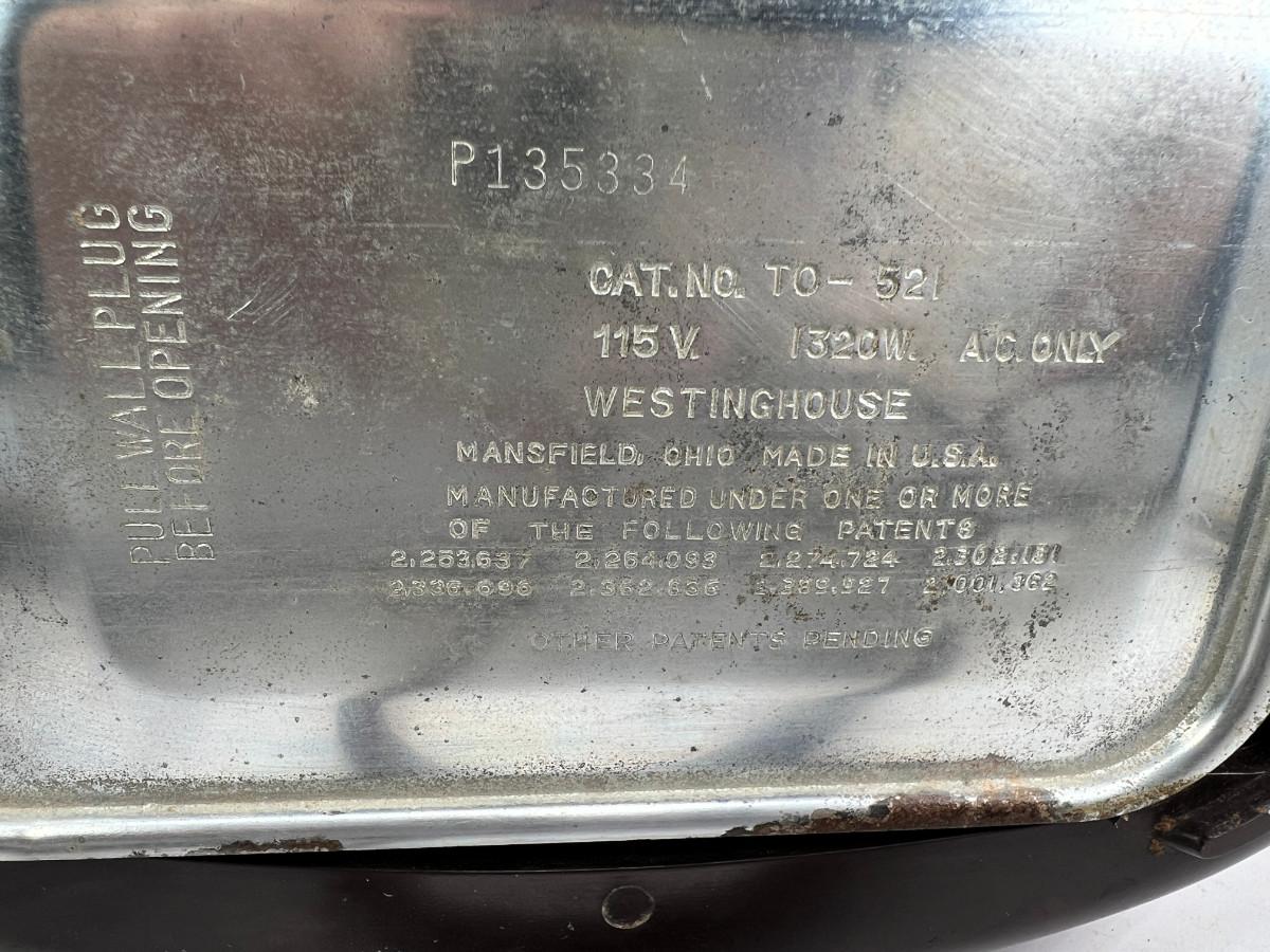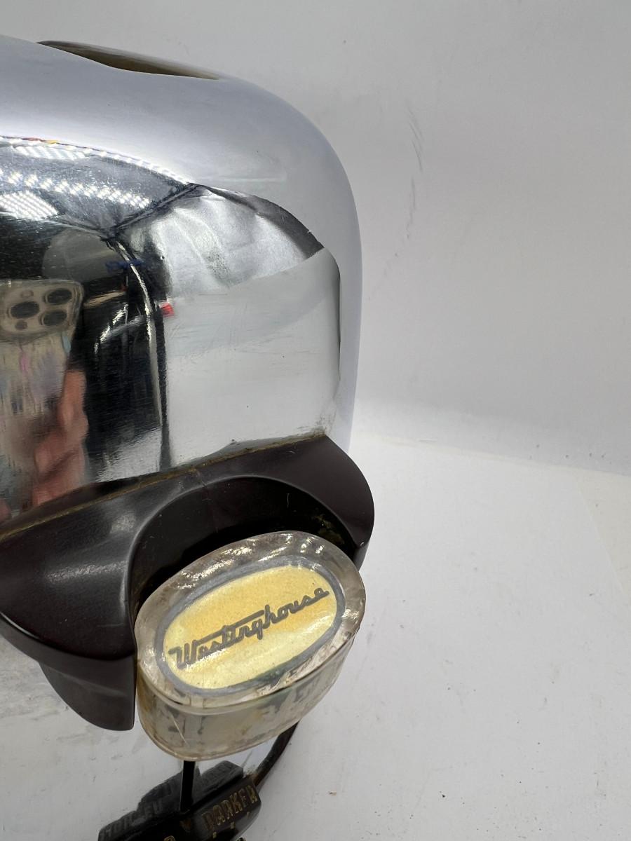 Vintage MCM Westinghouse Etched Chrome Bakelite Toaster mode 10 X 6X 8, cord is taped. Unit is being sold as a "non-working" vintage electronic device that should be gone over by a qualified technician prior to use. May have rust, corrosion or other flaws see pictures.