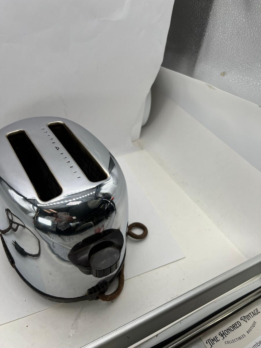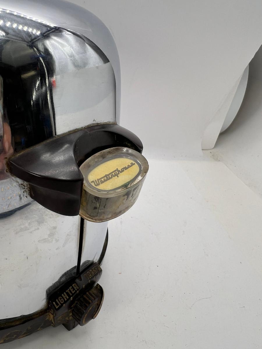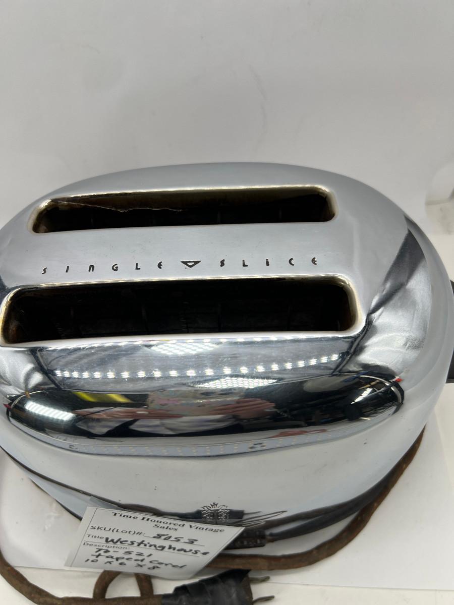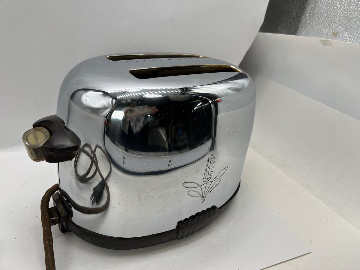 Vintage MCM Westinghouse Etched Chrome Bakelite Toaster mode 10 X 6X 8, cord is taped. Unit is being sold as a "non-working" vintage electronic device that should be gone over by a qualified technician prior to use. May have rust, corrosion or other flaws see pictures.