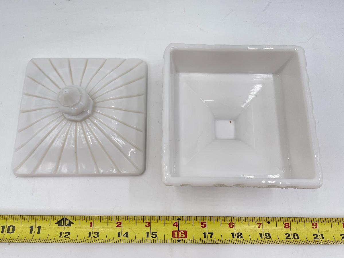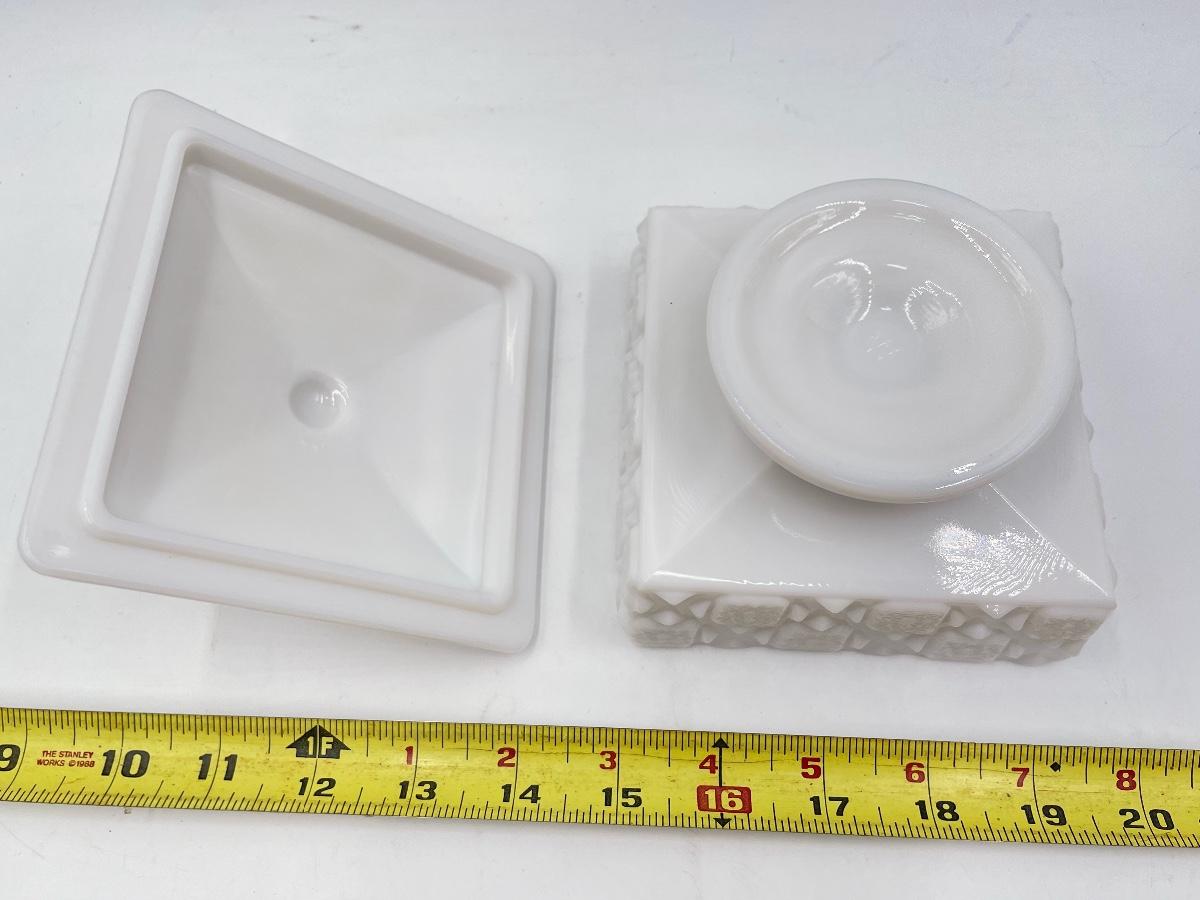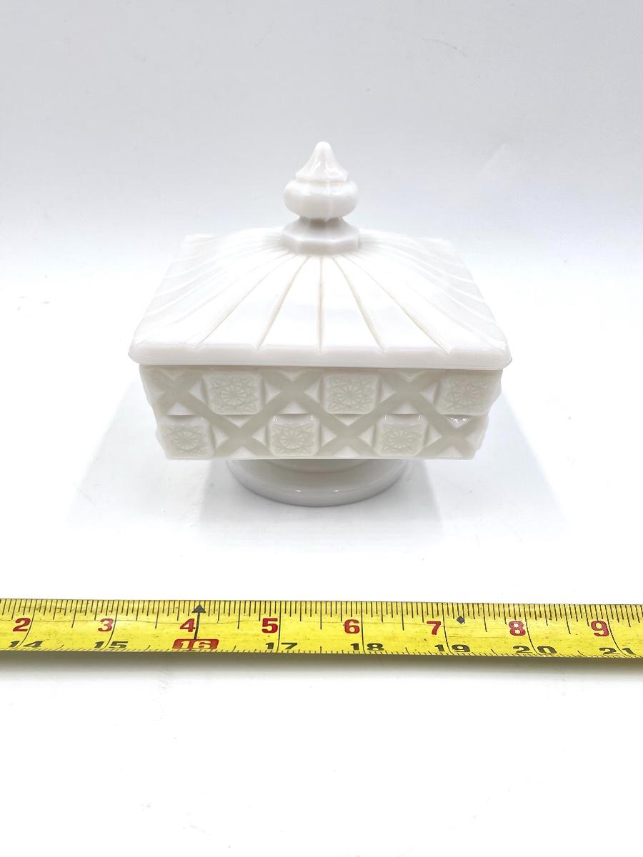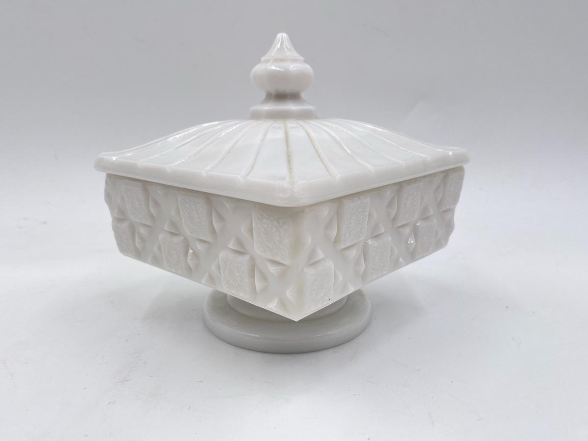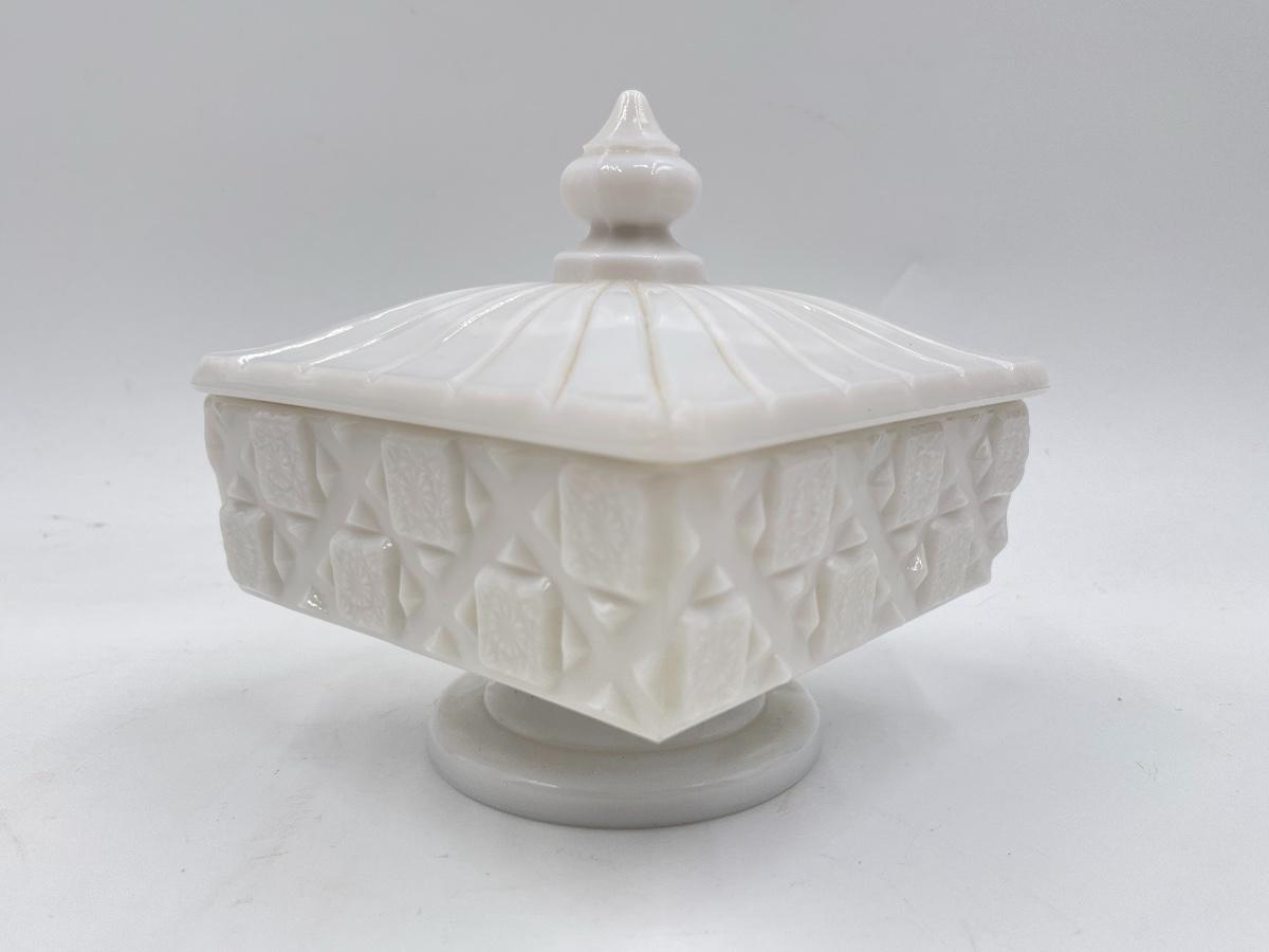 WESTMORELAND “OLD QUILT” MILK GLASS FOOTED SQUARE CANDY DISH