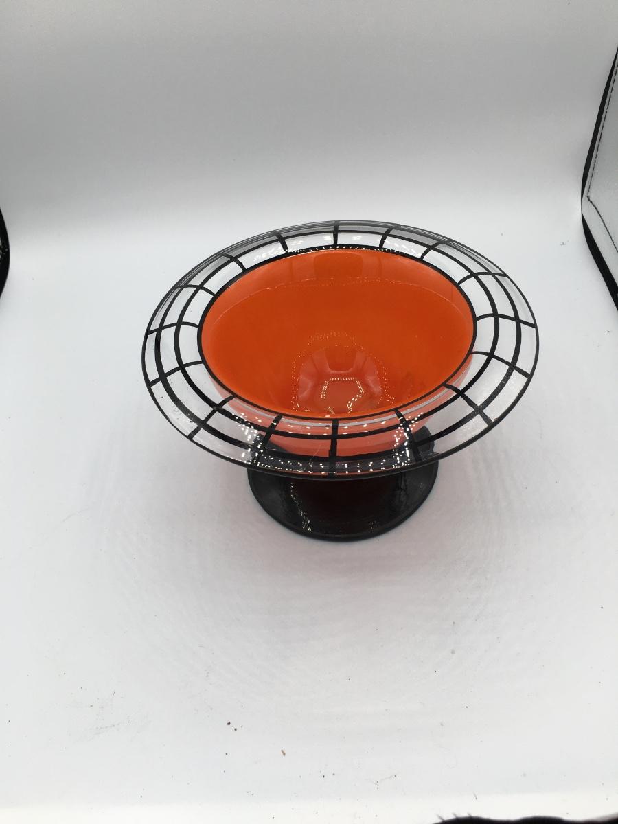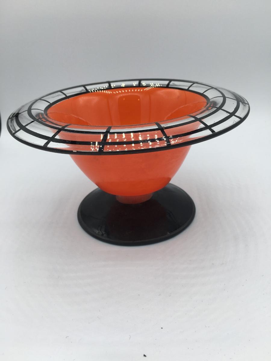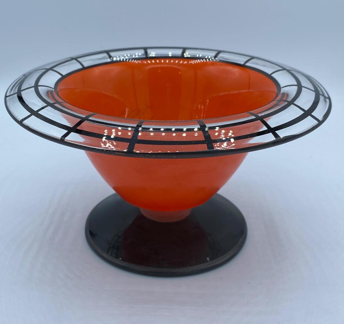 Westmoreland orange ware Art Deco vase by Charles West of Westmoreland Glass. Black painted lattice on top. 4”tall 6 3/4 in diameter. Minor rub wear on side. No chips, flakes or cracks. Great for Halloween.
