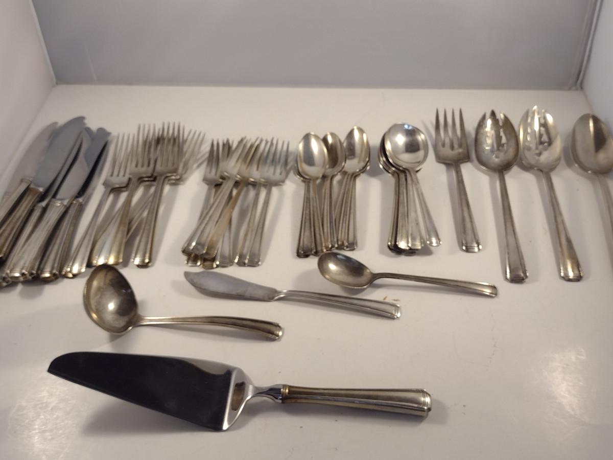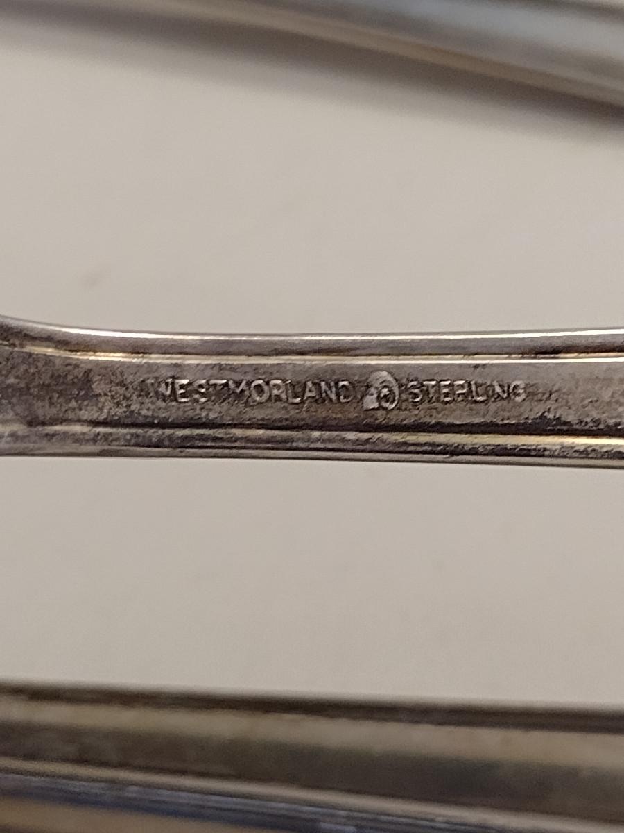 Westmoreland Sterling Silver Flatware- 48 Pieces- Approximate Total Weight 1,513 Grams. Includes eight of each: knife, dinner fork, salad/dessert fork, regular spoon, soup spoon. Also included: ladle- 1, slotted serving spoon- 2, solid serving spoon- 1, meat fork- 1, butter knife- 1, sugar spoon- 1, cake server- 1. Weight does not include knives or cake server.