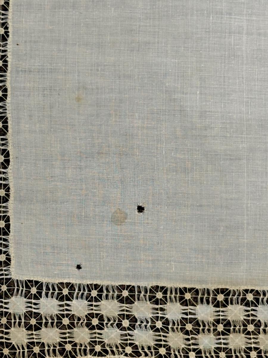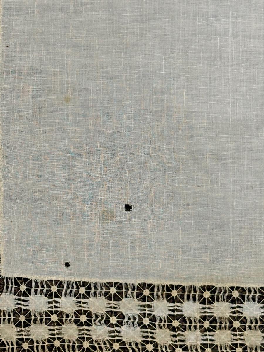Very nice condition considering the age of these pieces. There are a few light stains and one piece has a couple of small holes.