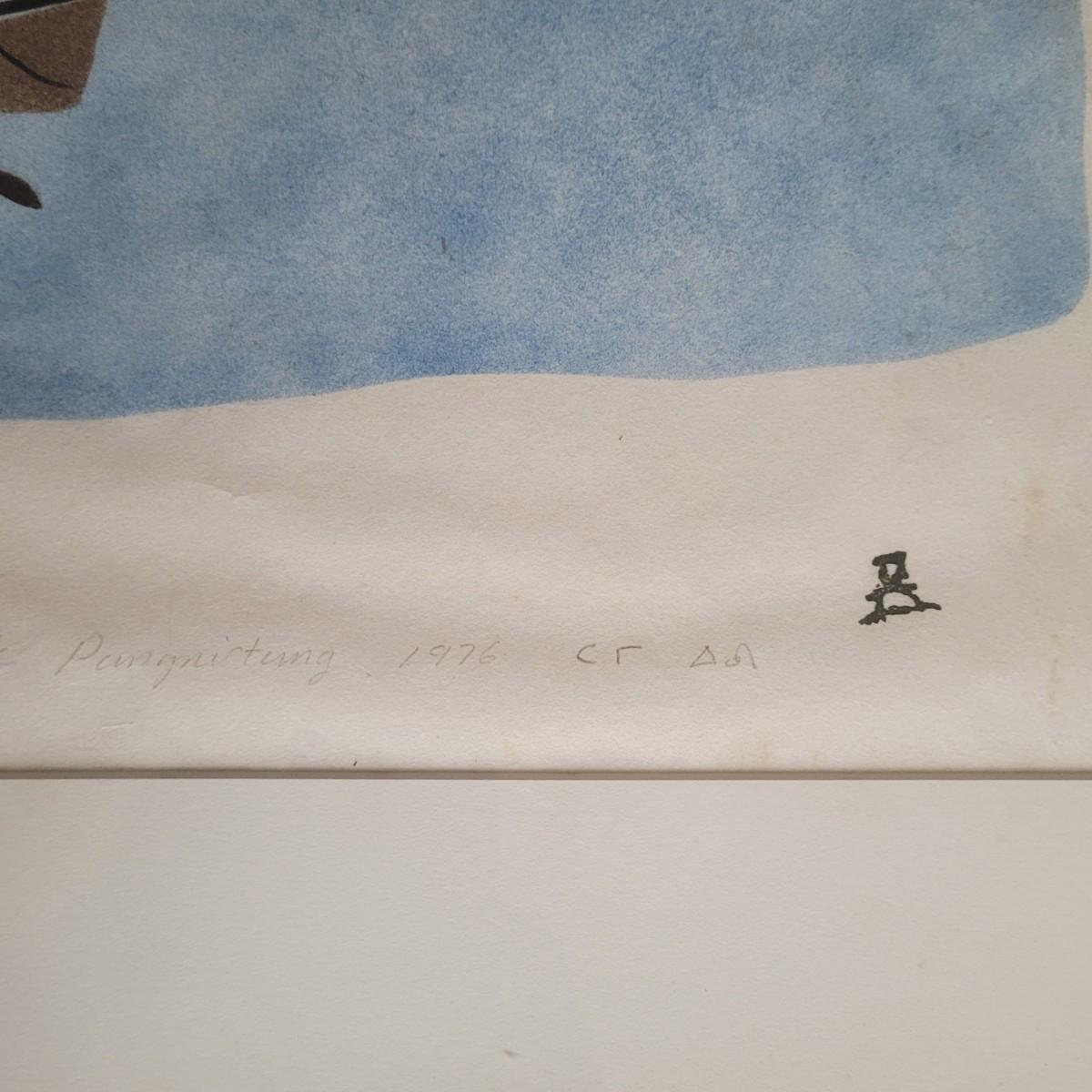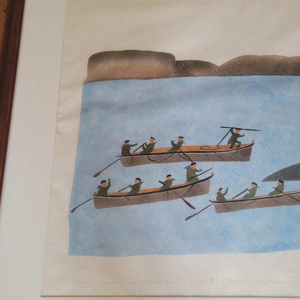 Original art titled "Whale Hunting Near Nassaujak" by Tommy Eevik and J. Akulukjuk. It depicts Inuit people whaling in open water with mountains in the background. This piece is under glass and in a wooden frame. It is signed, titled, and dated in pencil. Includes a short book about the artists, people, and locations featured in the works. The frame measures 34" x 1" 28"H.