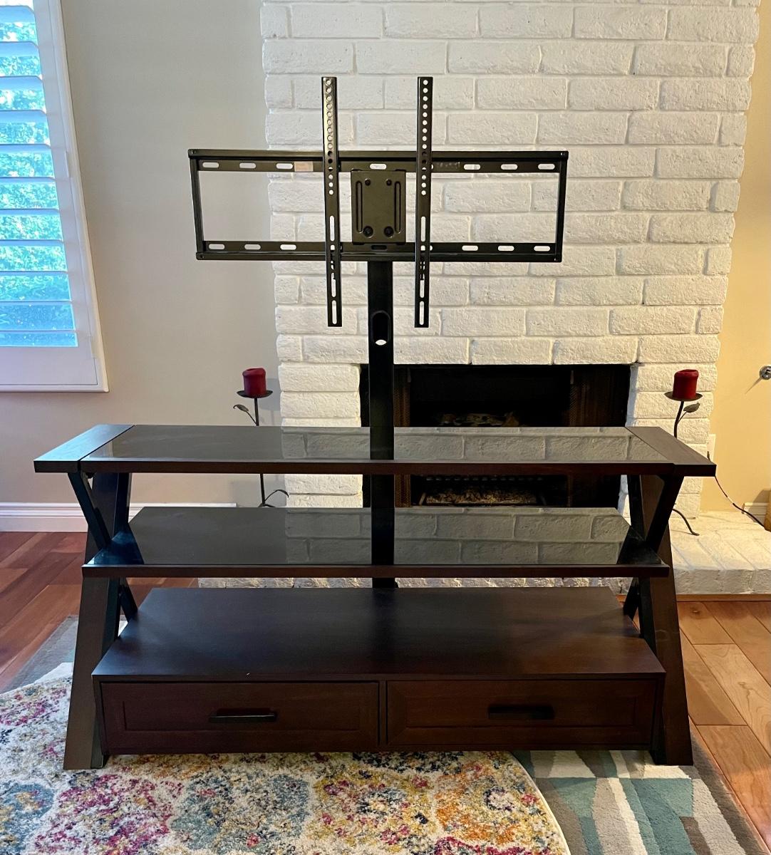 This Whalen Furniture XLDEC54-NV TV stand features fixed-arm swivel, tabletop and wall-mount display options for flexible positioning of your compatible TV. The 2 pull-out drawers let you keep remotes, CDs, DVDs and other accessories neatly stashed away. Holds TVs up to 60”. Brown Cherry color with tempered glass shelves. Table is 26” tall x 54” wide x 21” deep.