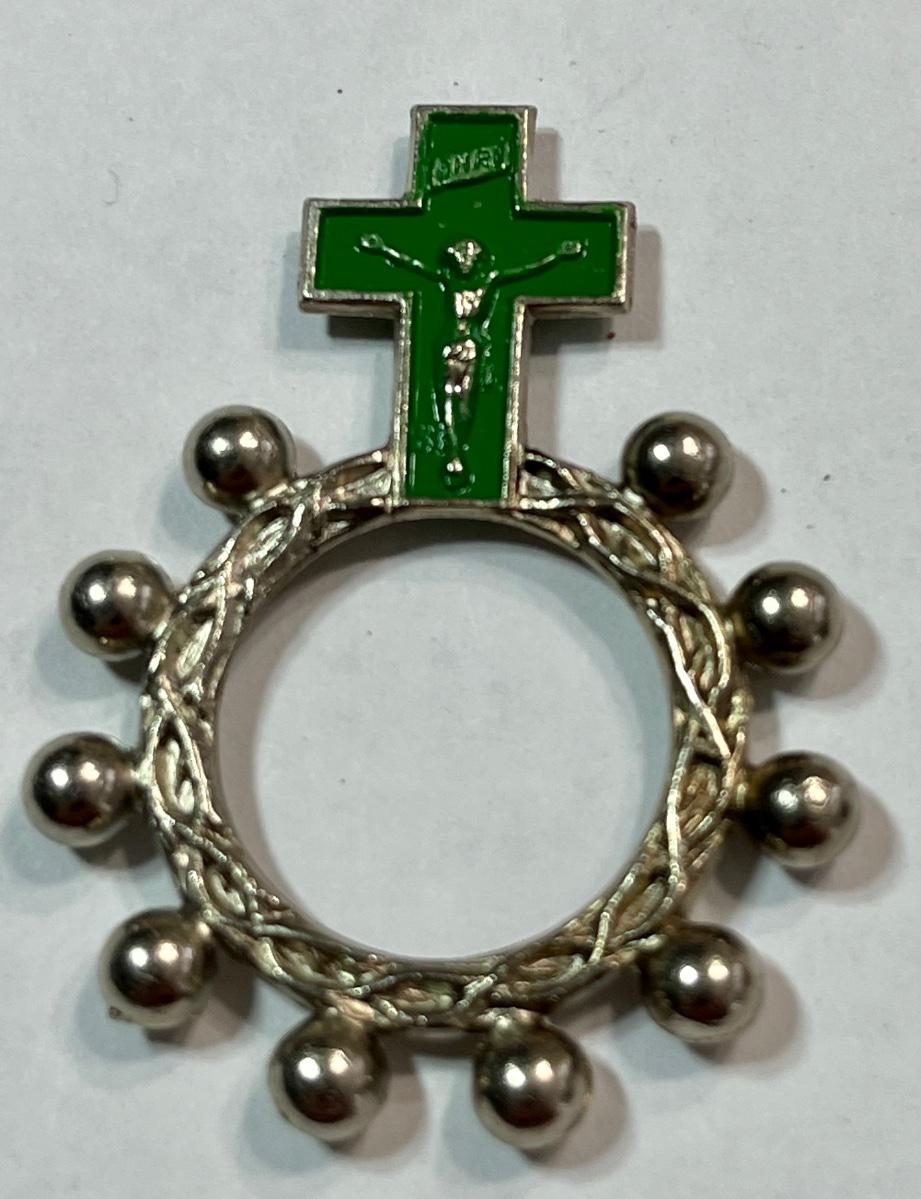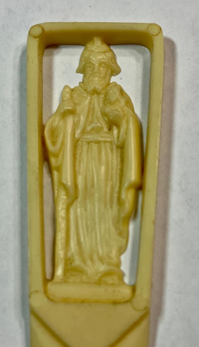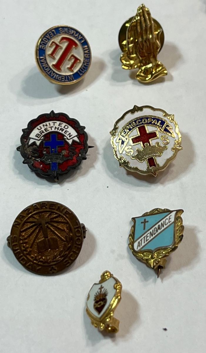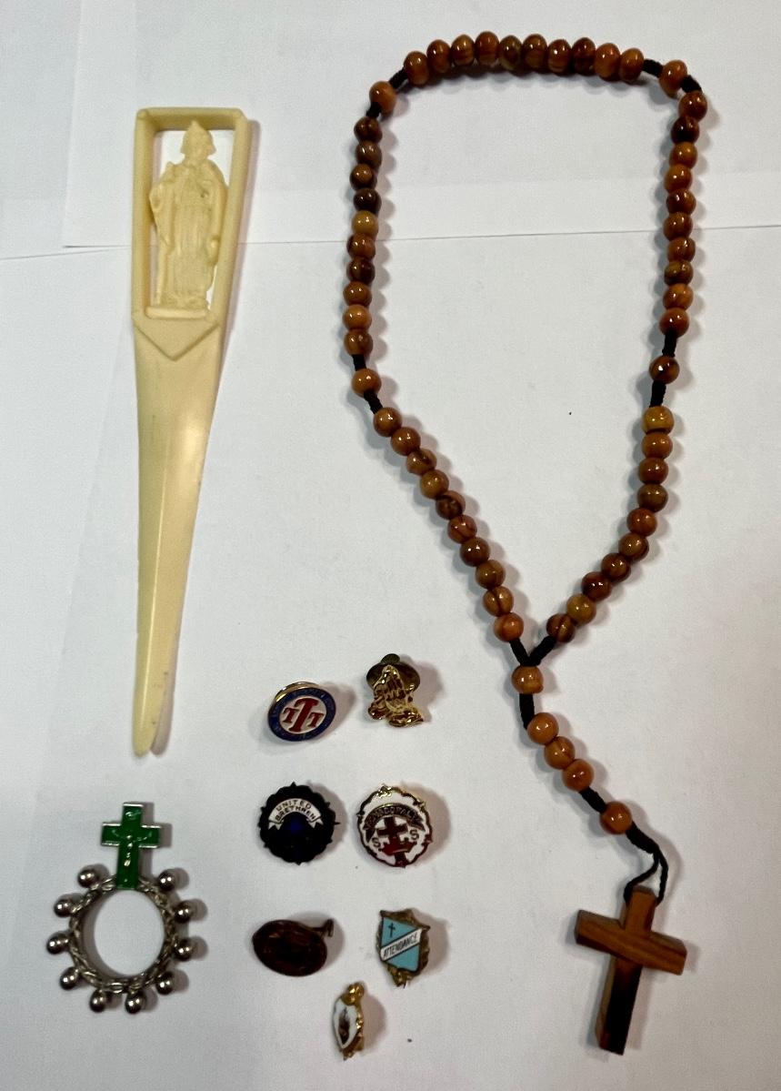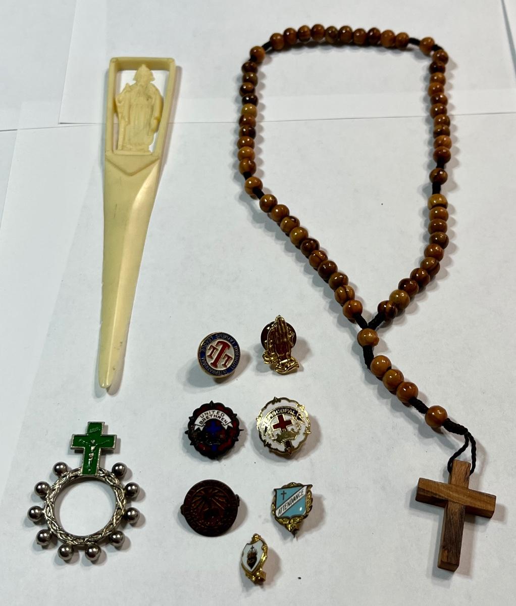Lot includes 10 vintage religious-themed items from hat pins, to a rosary and bakelite bookmark.