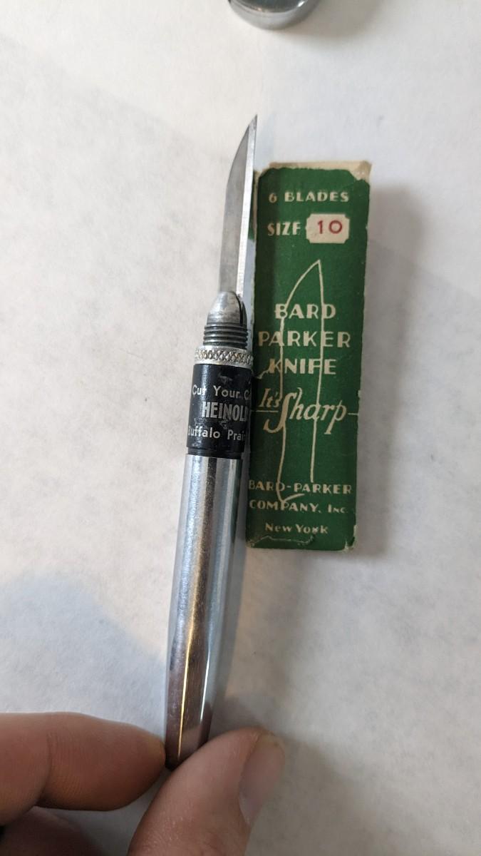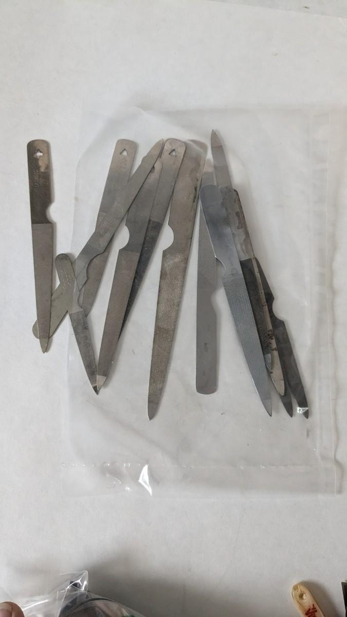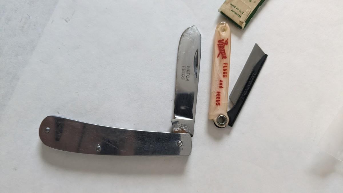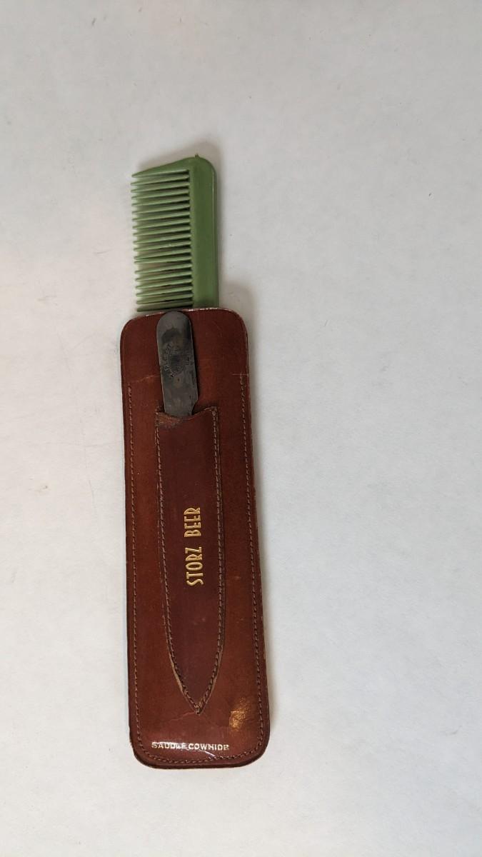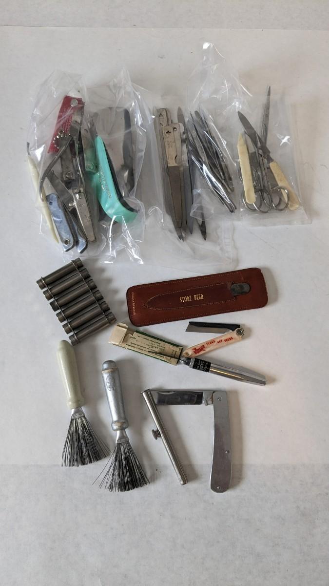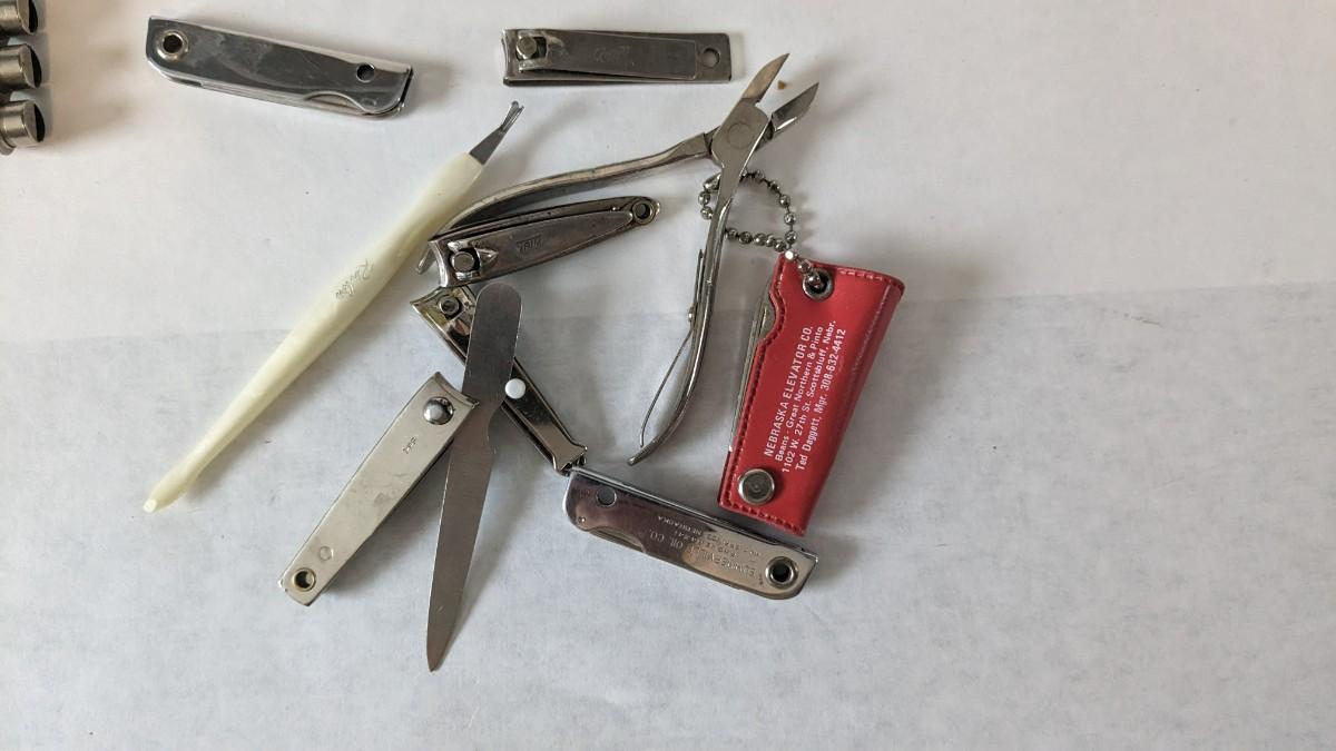 Fun little assortment of everything you find on the top of a man's dresser or in his pocket. Includes tweezers, metal nail files, pocket shoe horns and various nail clippers. As well as great Storz beer comb and file holder, two Victor Feeds knives, a strange promotional exacto knife with replacement blades, a very early harmonica, two mustache brushes, and a neat retractable multi tool. Some real goodies in this one