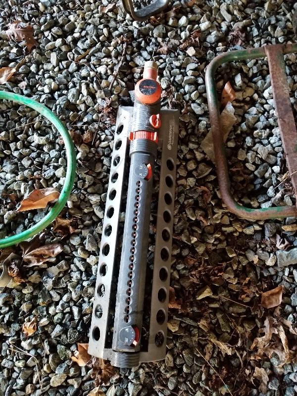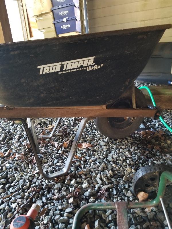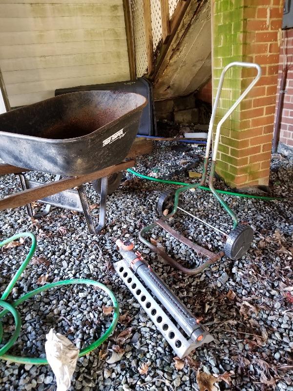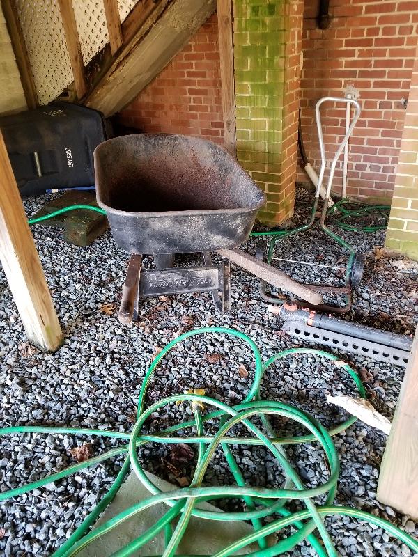 Wheel barrel, hose, oversized sprinkler and hand cart