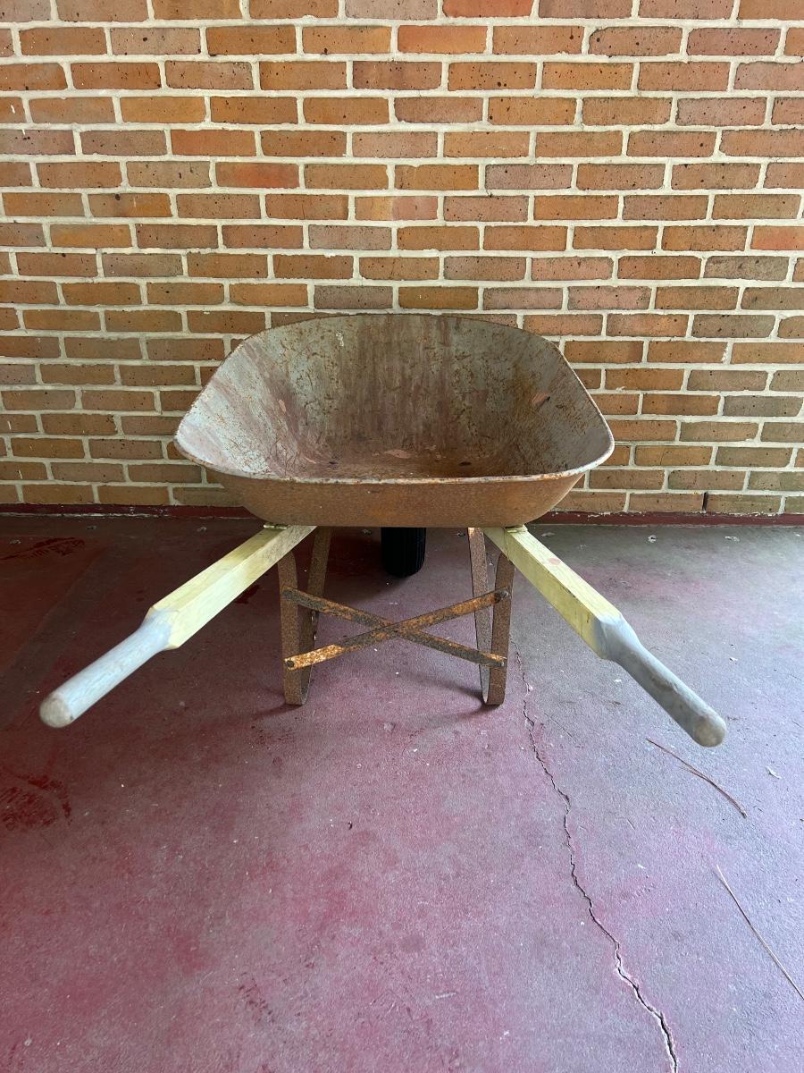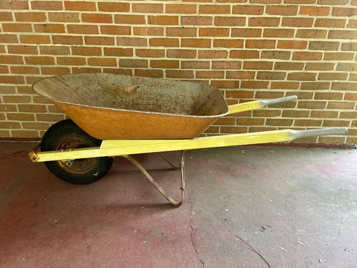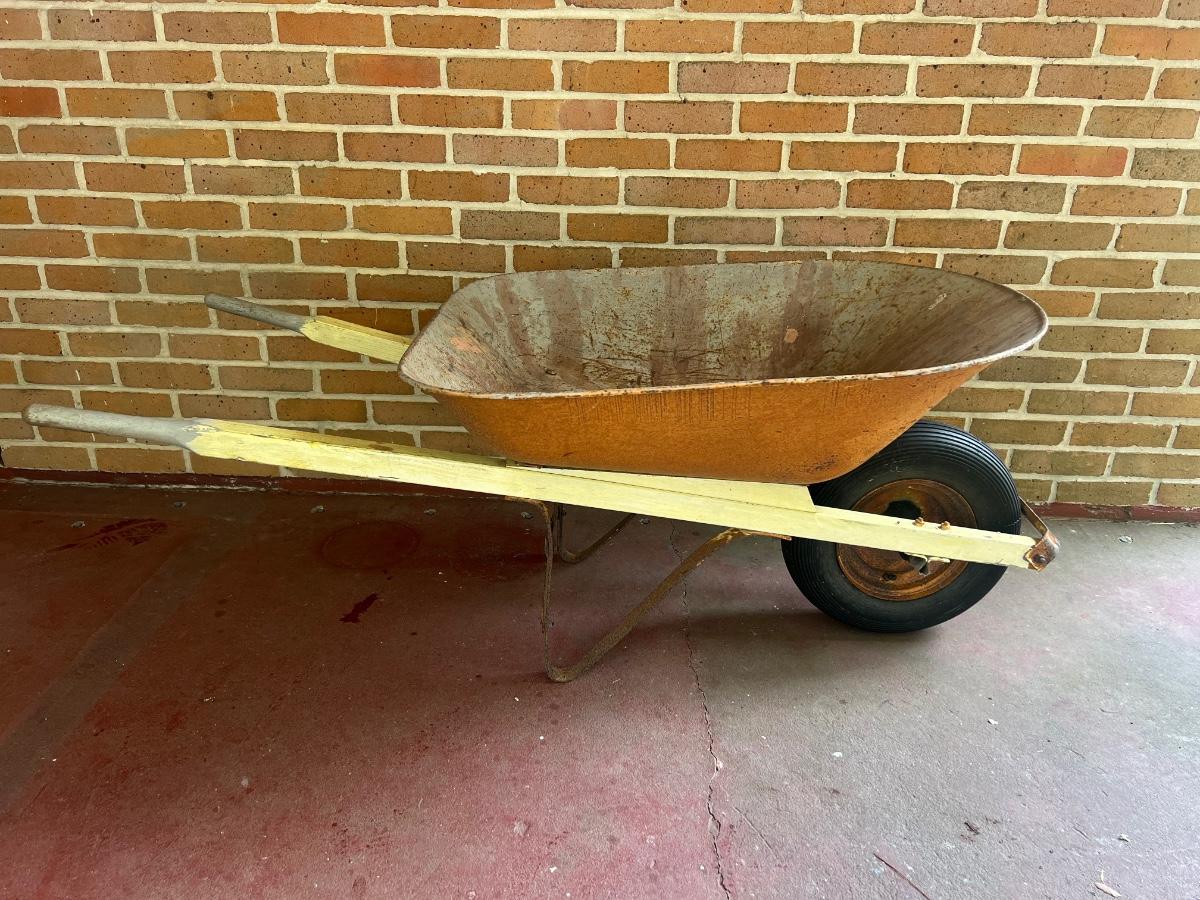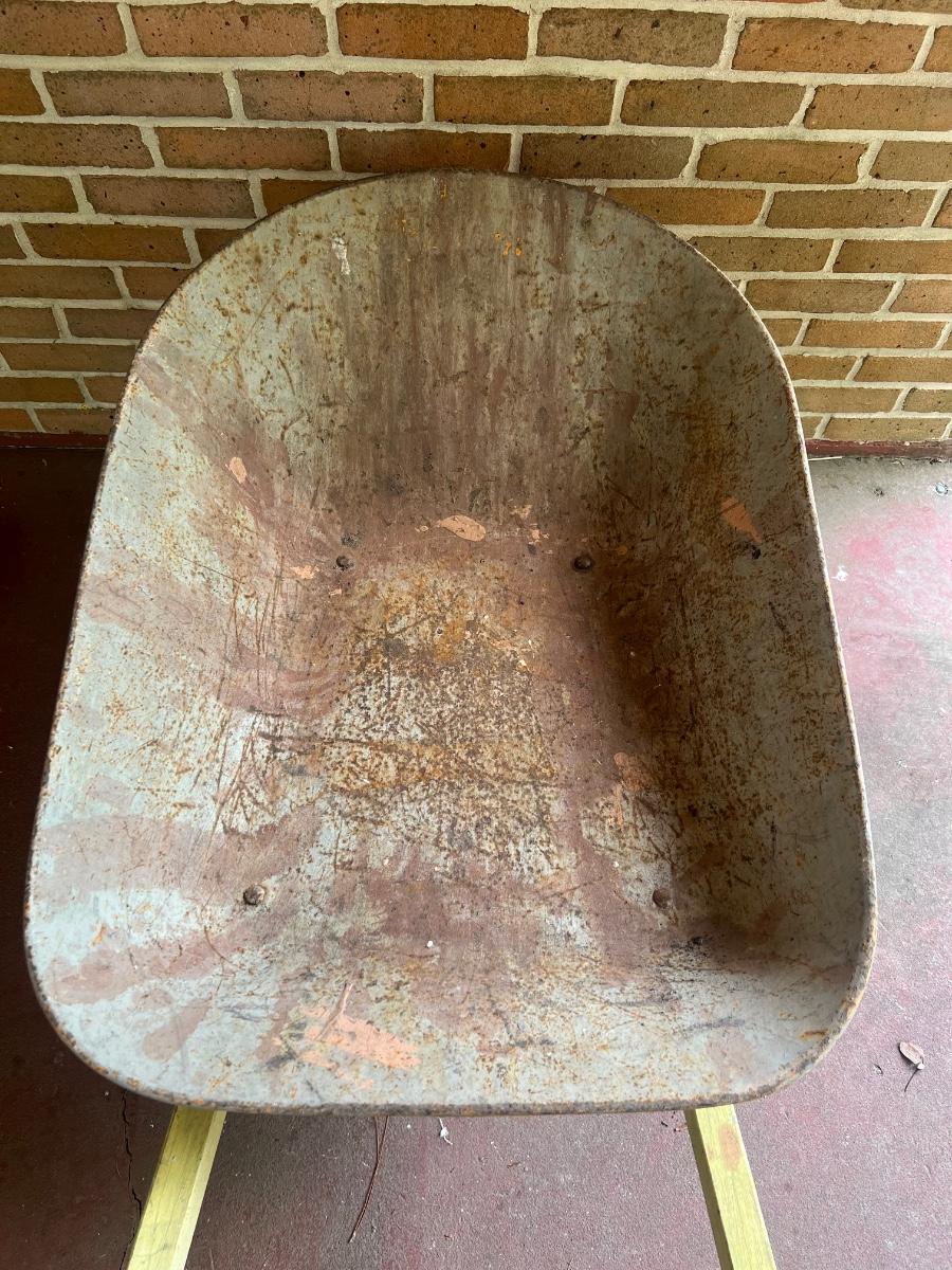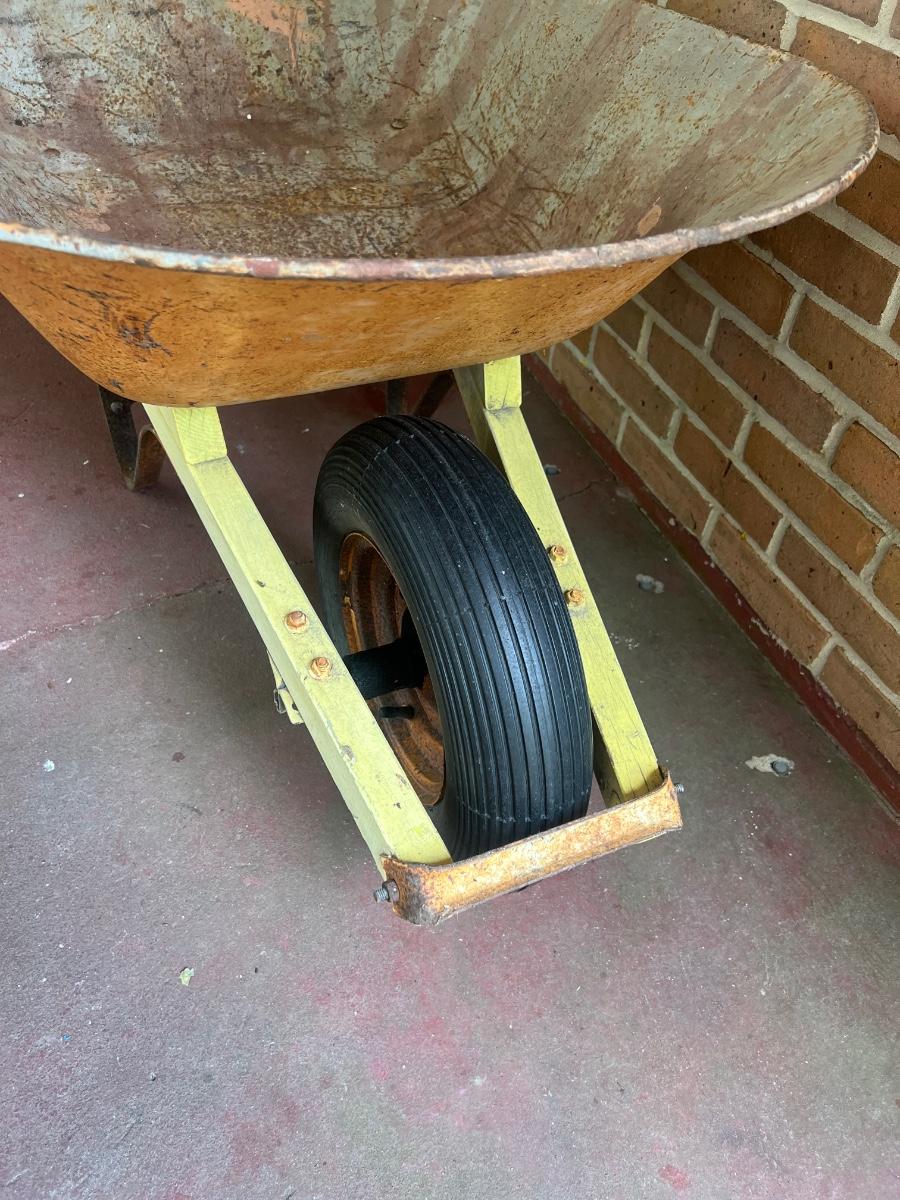 Rusty and well used but the wood is still solid, bucket is still solid and the wheel is holding air.