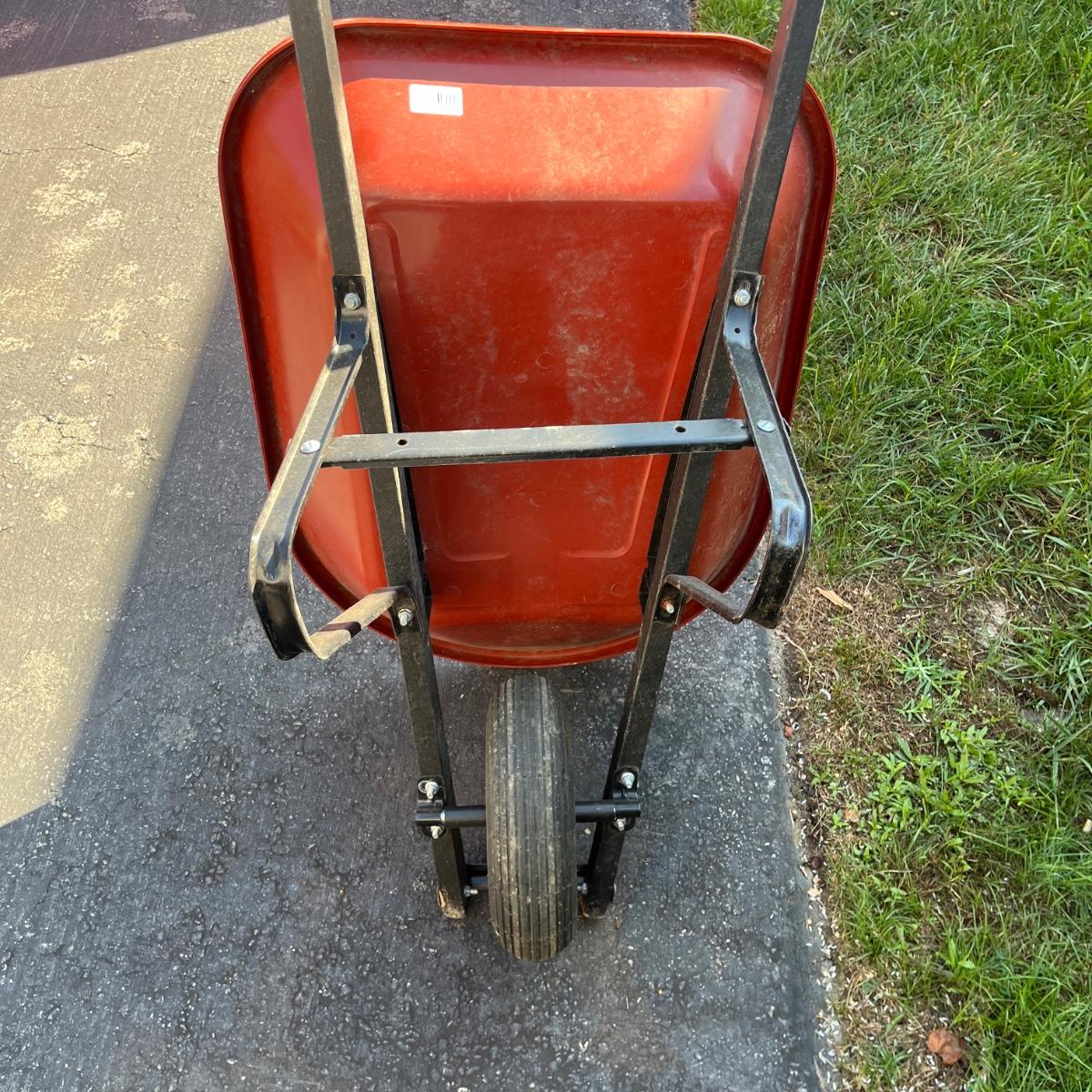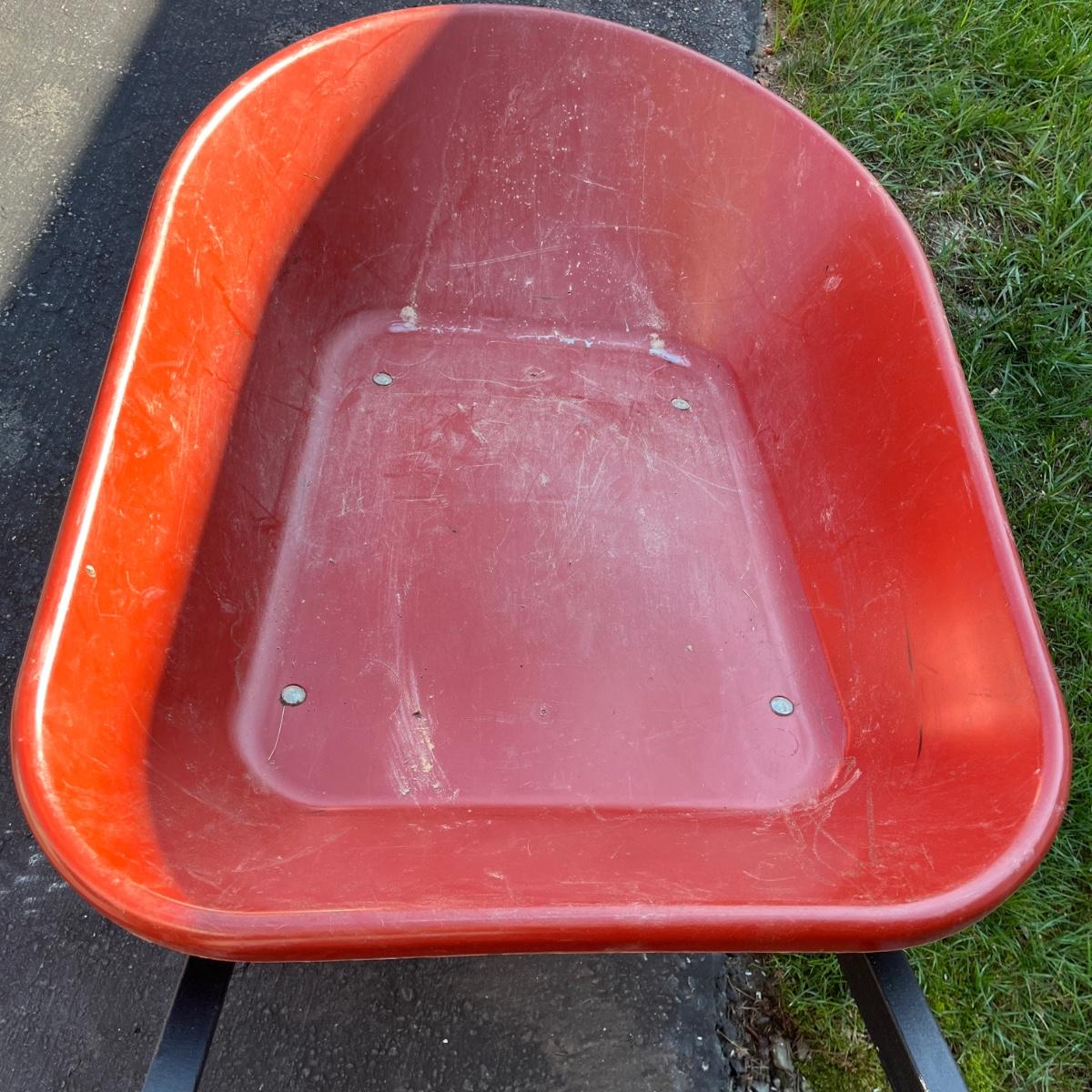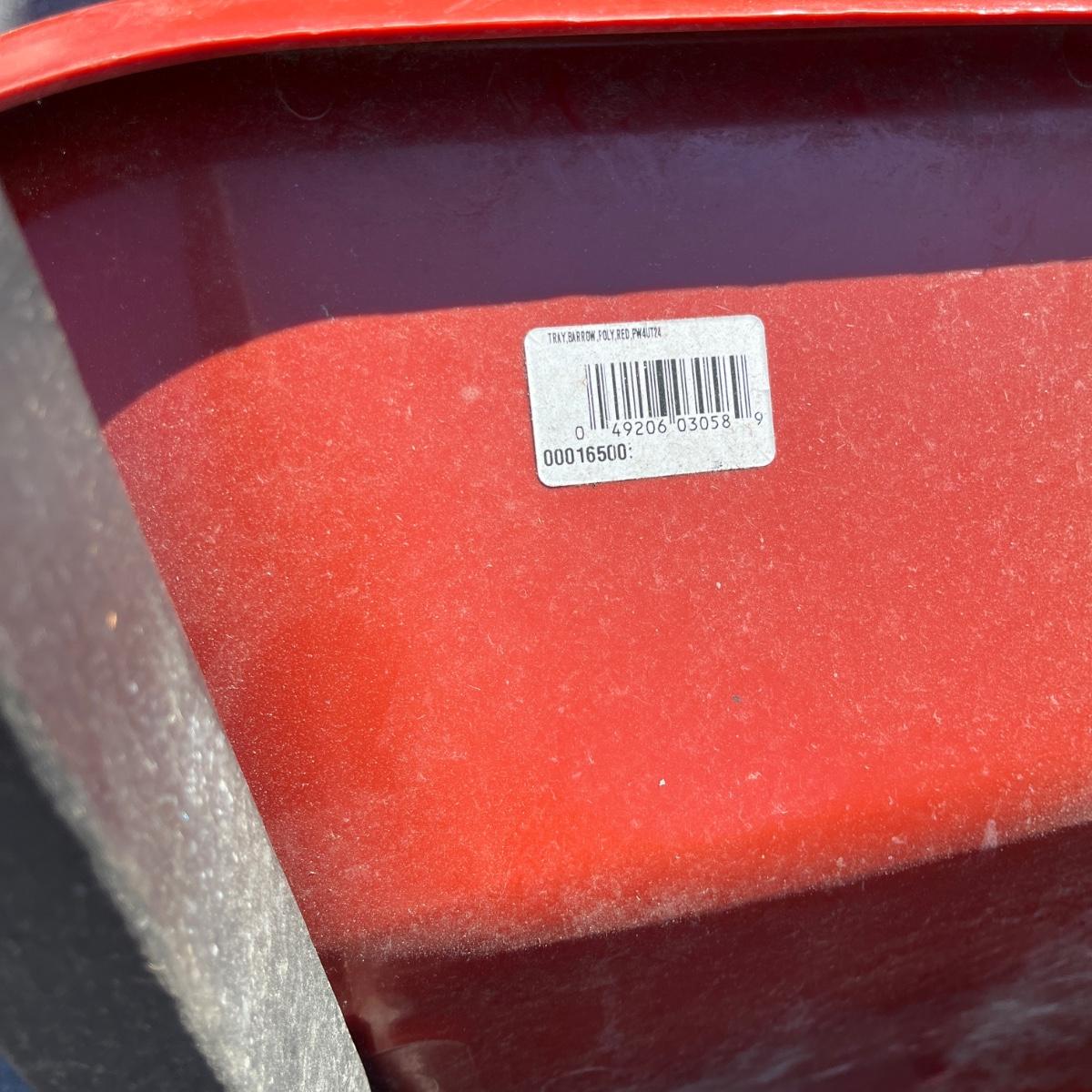 Lot includes a wheelbarrow with pneumatic tire and a plastic tray. Tray measures 27” x 36” x 10”H.