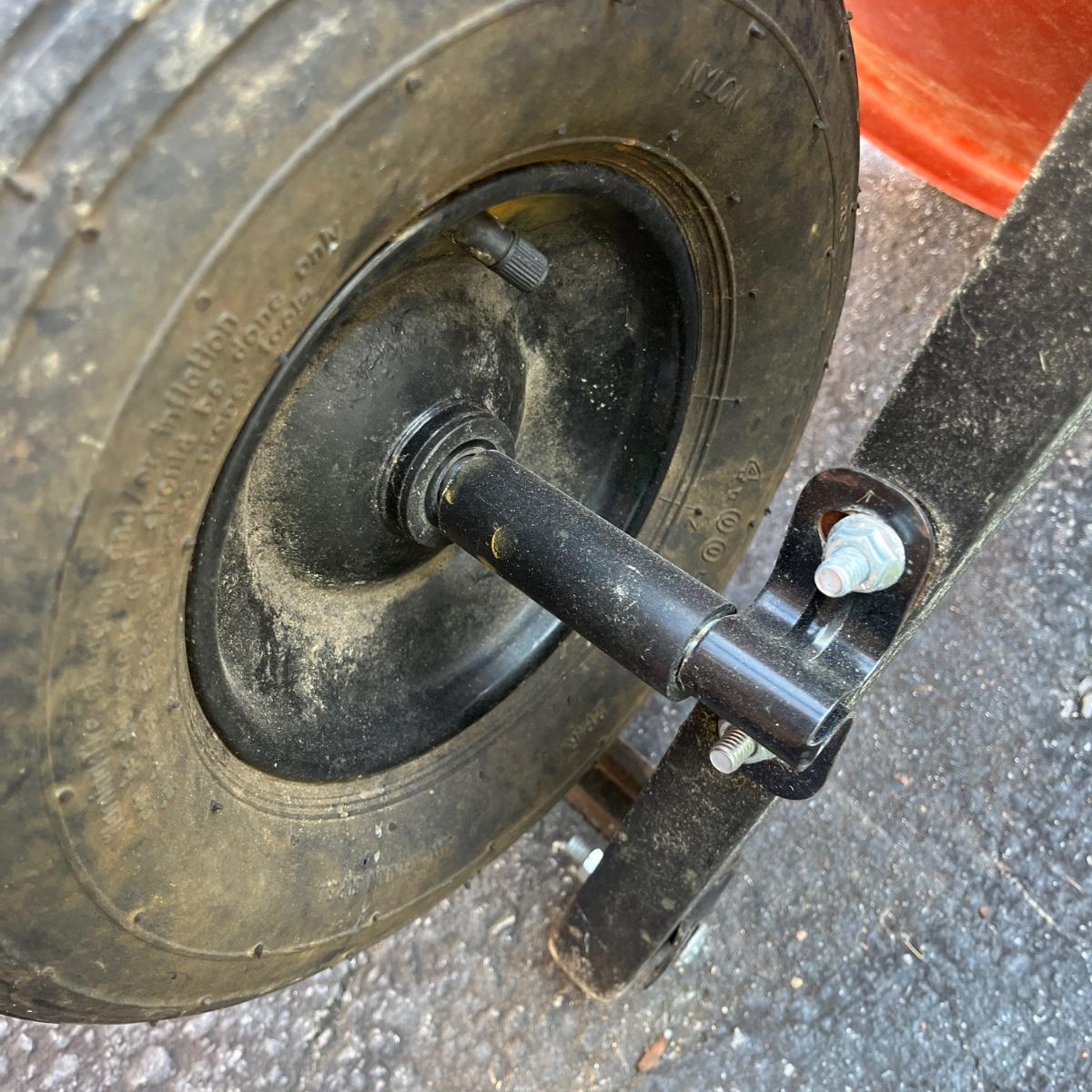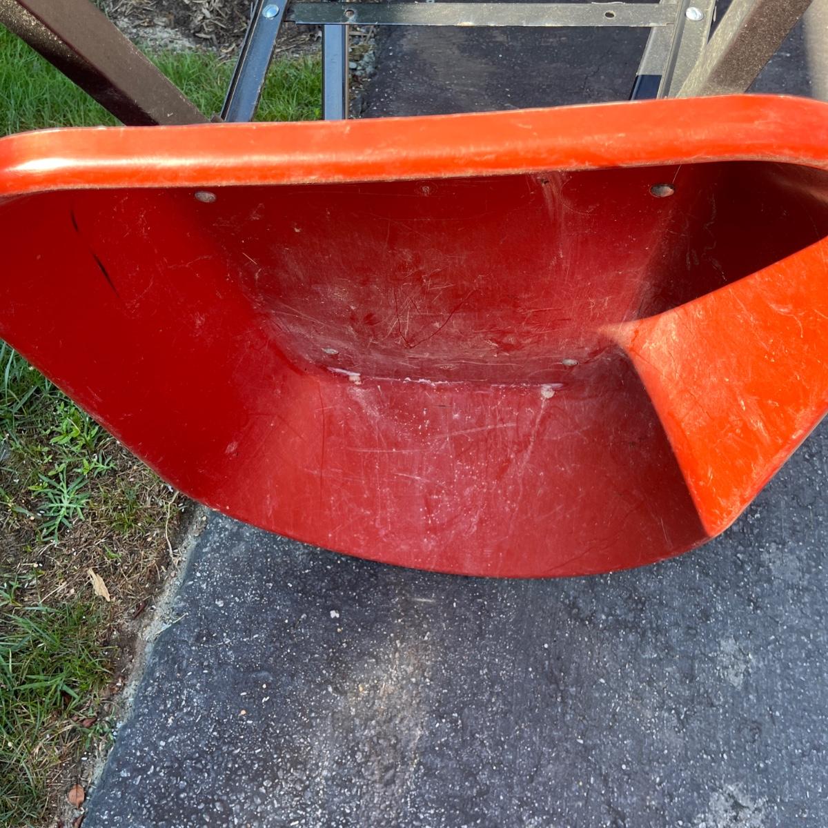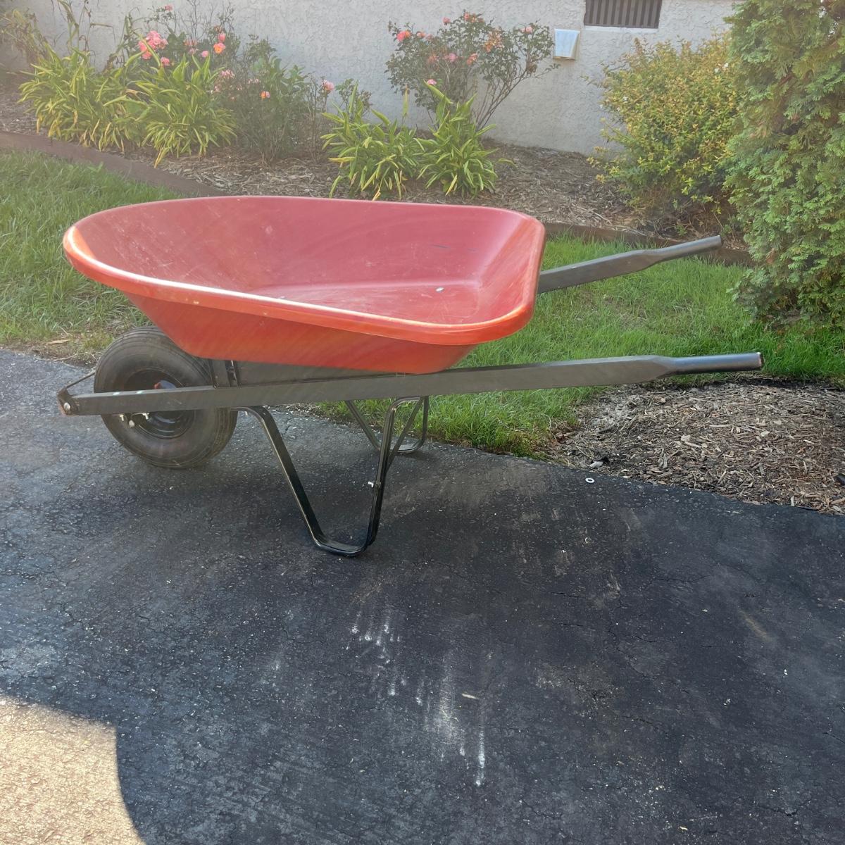 Lot includes a wheelbarrow with pneumatic tire and a plastic tray. Tray measures 27” x 36” x 10”H.