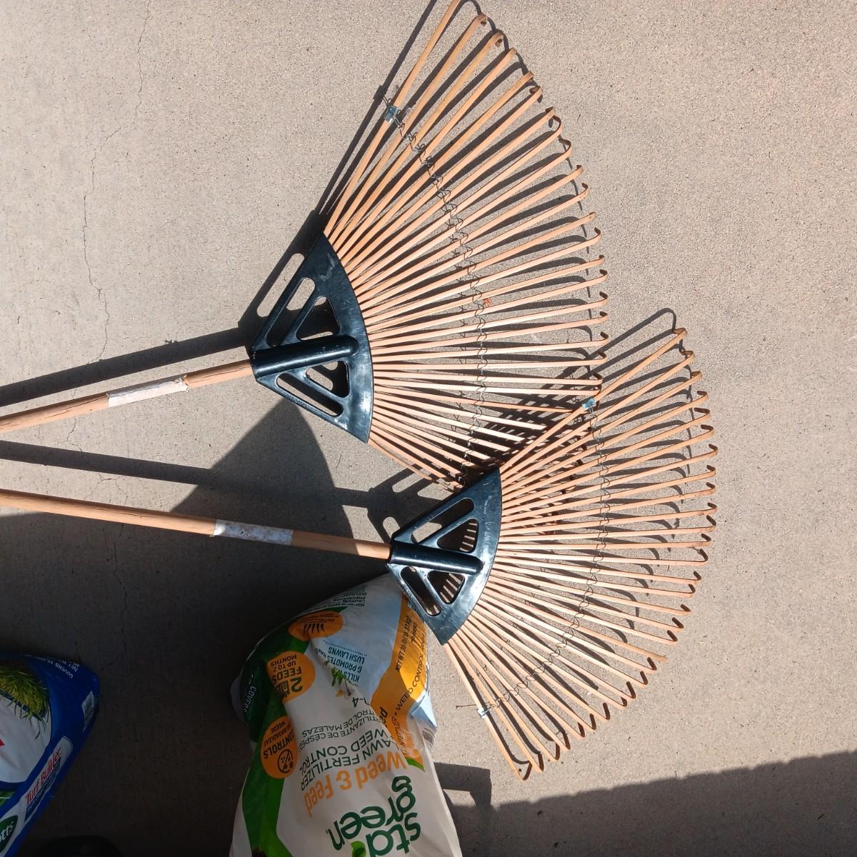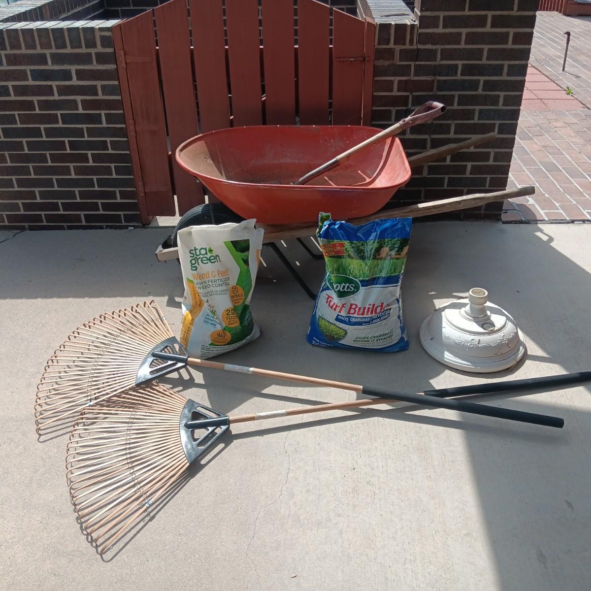 WHEELBARROW, HIS AND HERS LEAF RAKES, TURF BUILDER & SHOVEL