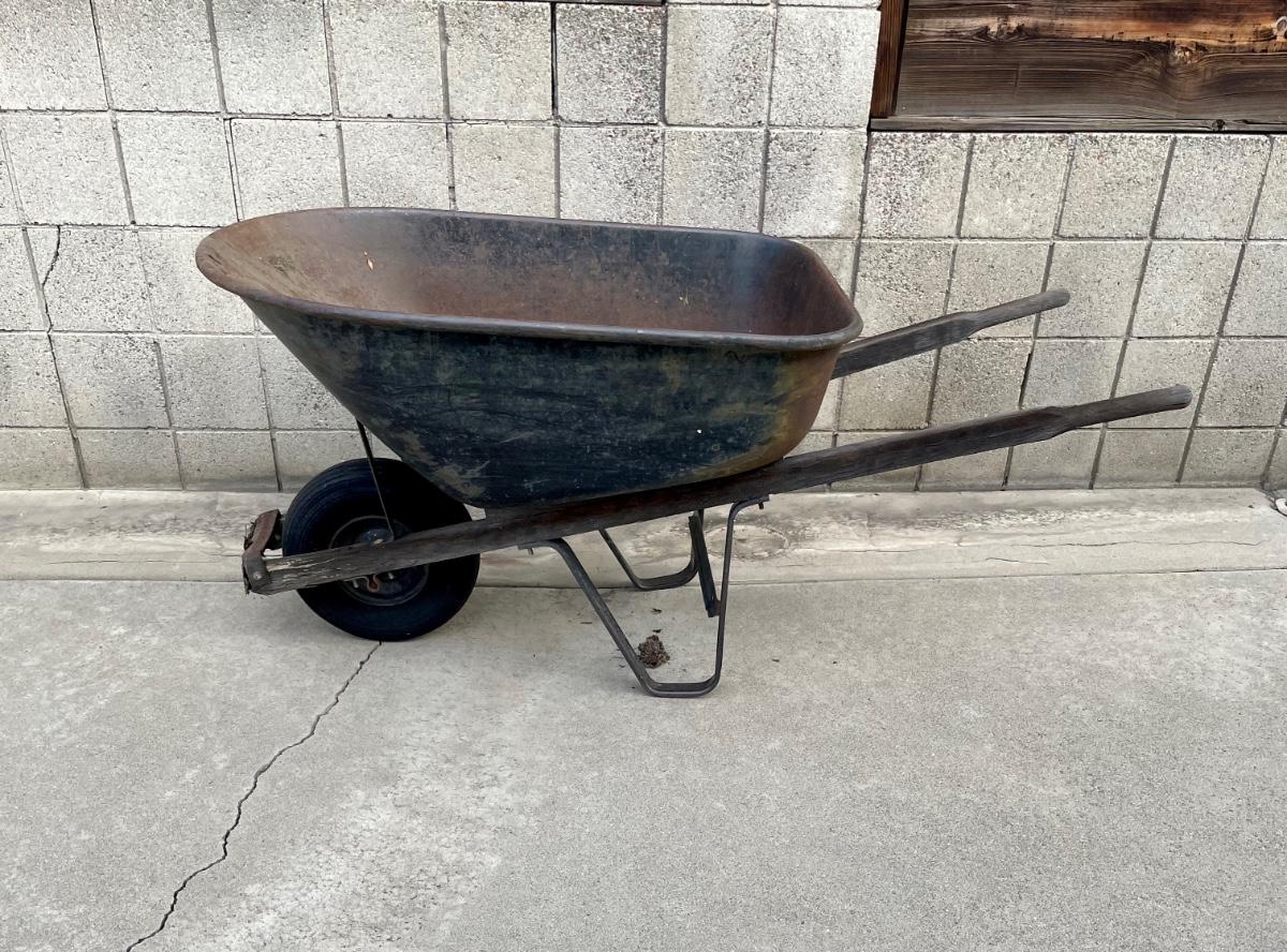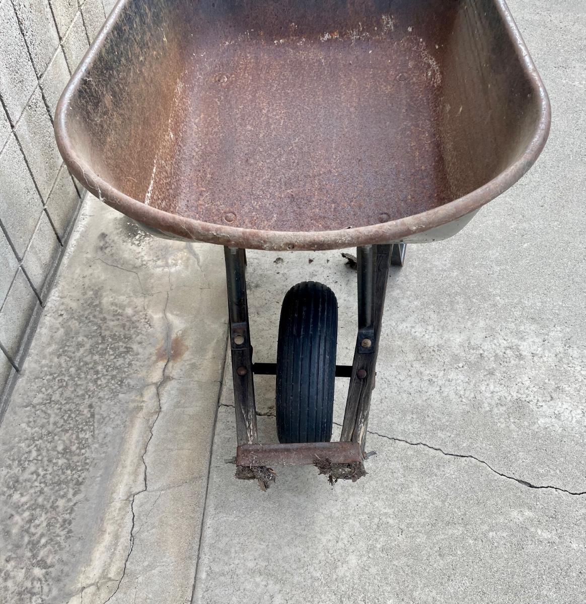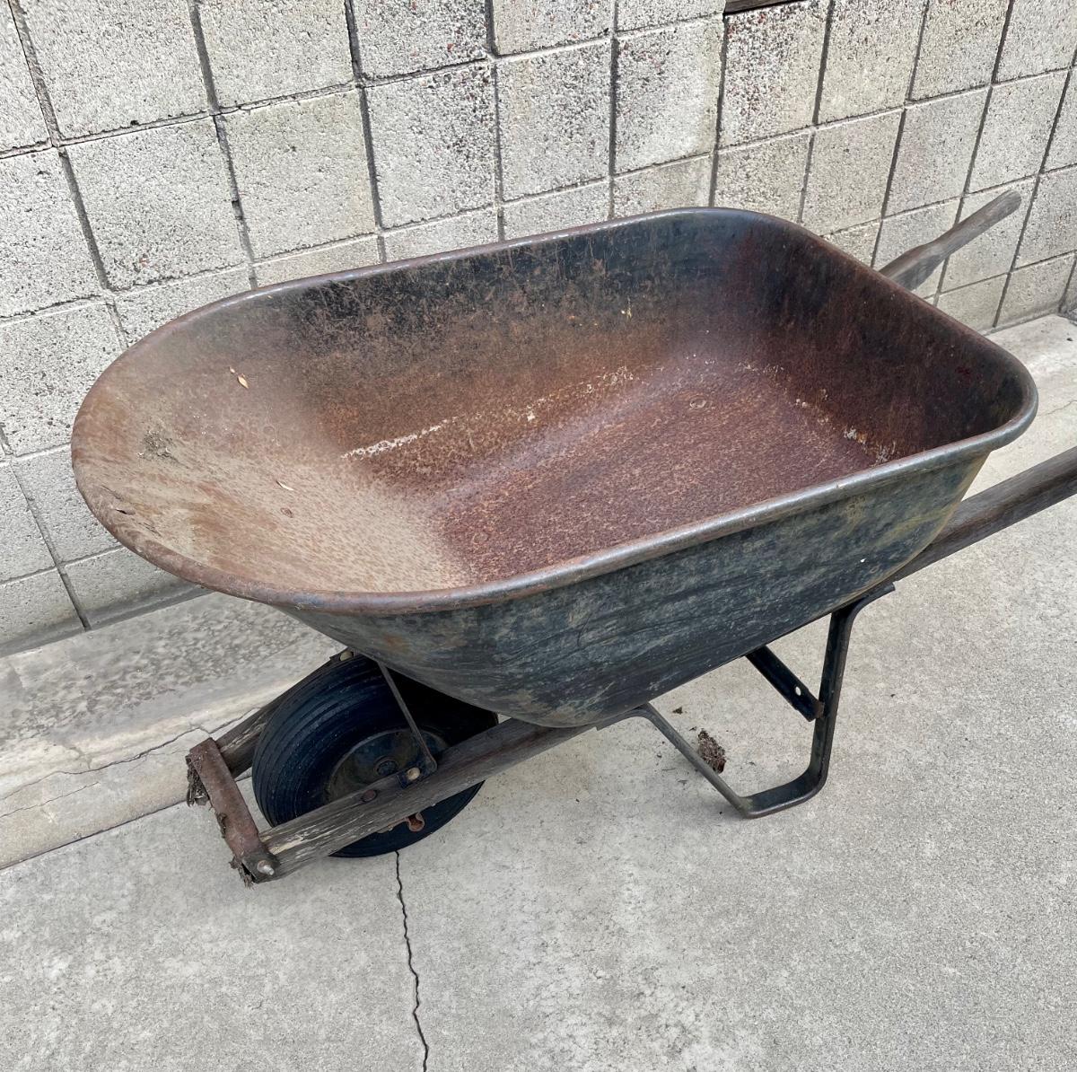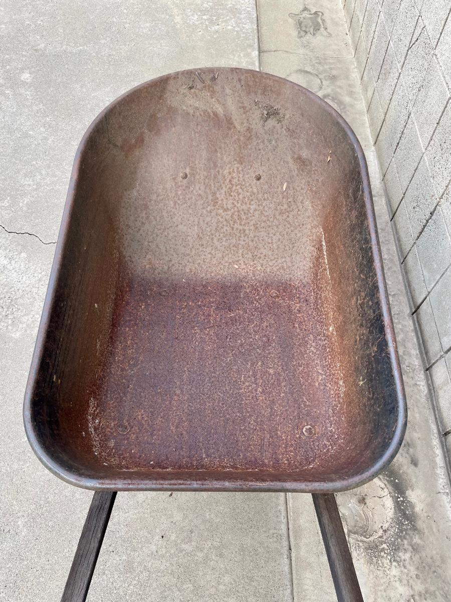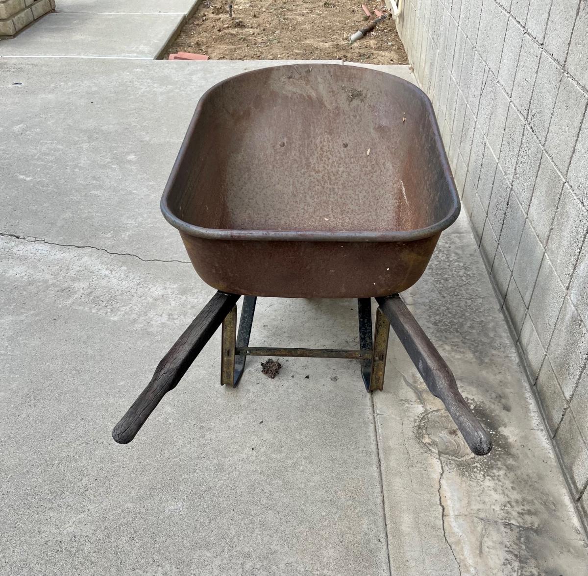 Wheelbarrow with Metal Tub, wood handles and pneumatic single tire. Tub has surface rust but no holes.