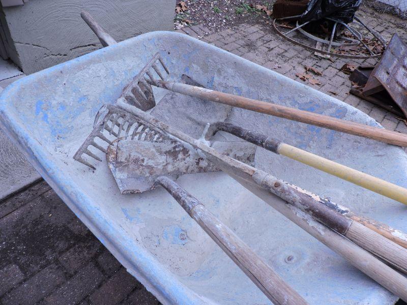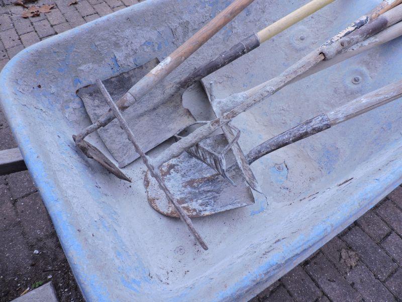 Wheelbarrow with Steel Mortar Pans and Mixing Tools