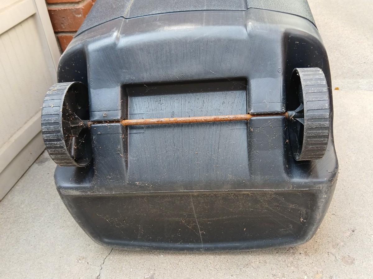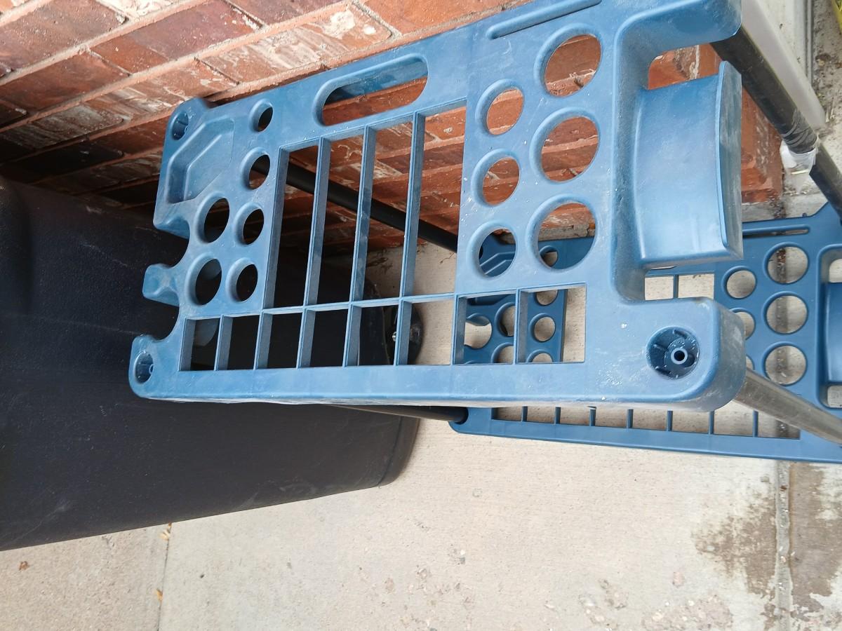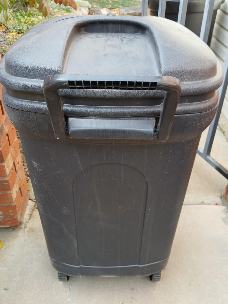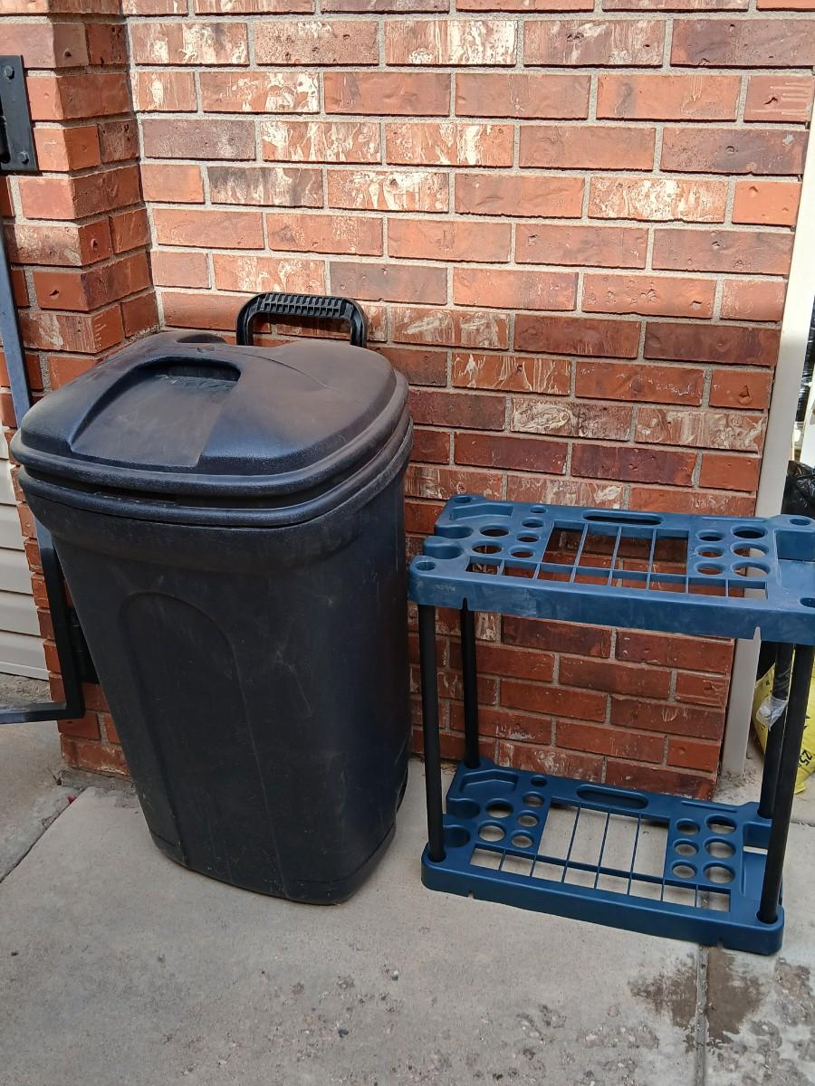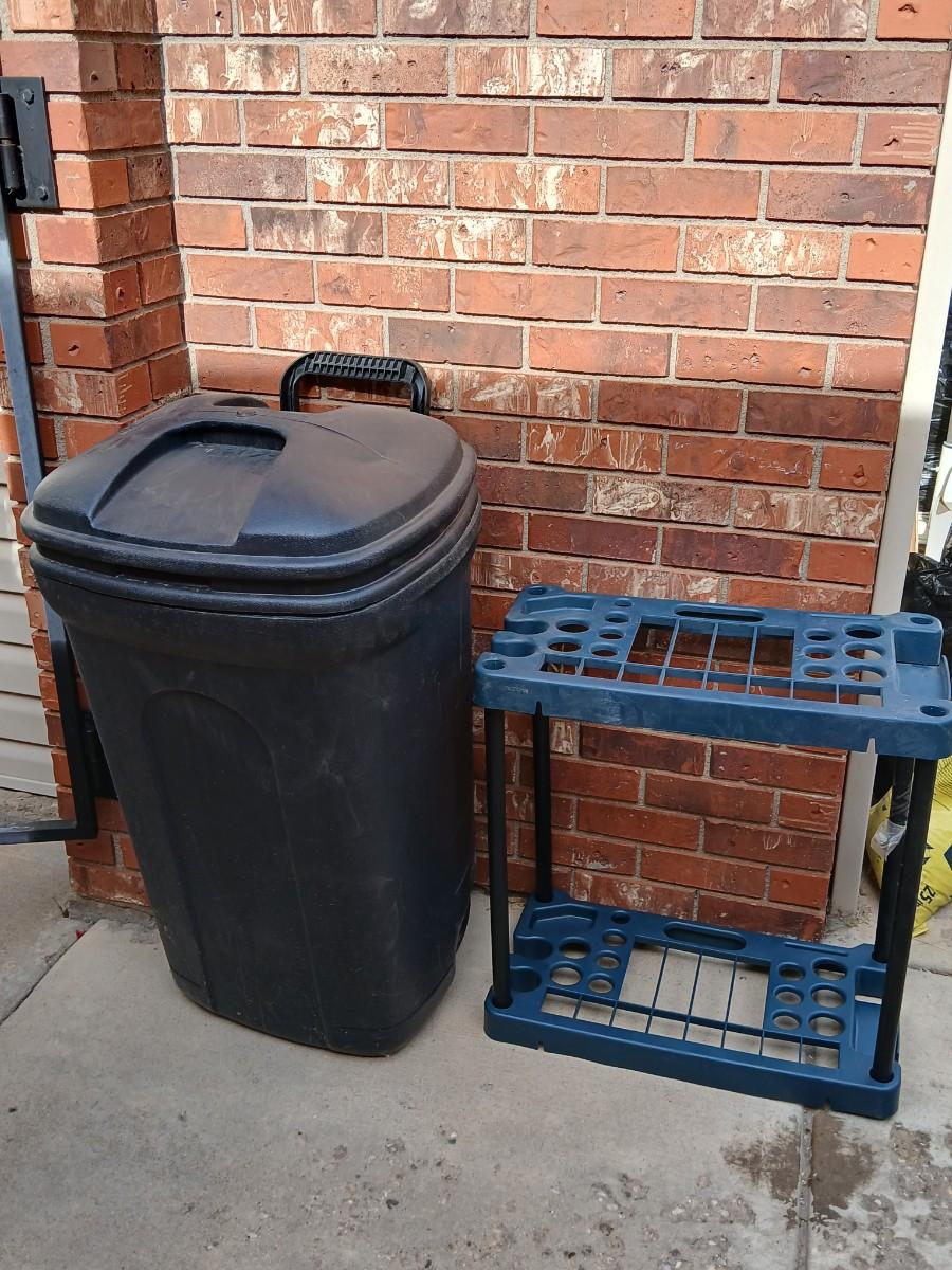 Wheeled trashcan with lid and a yard tool organizer