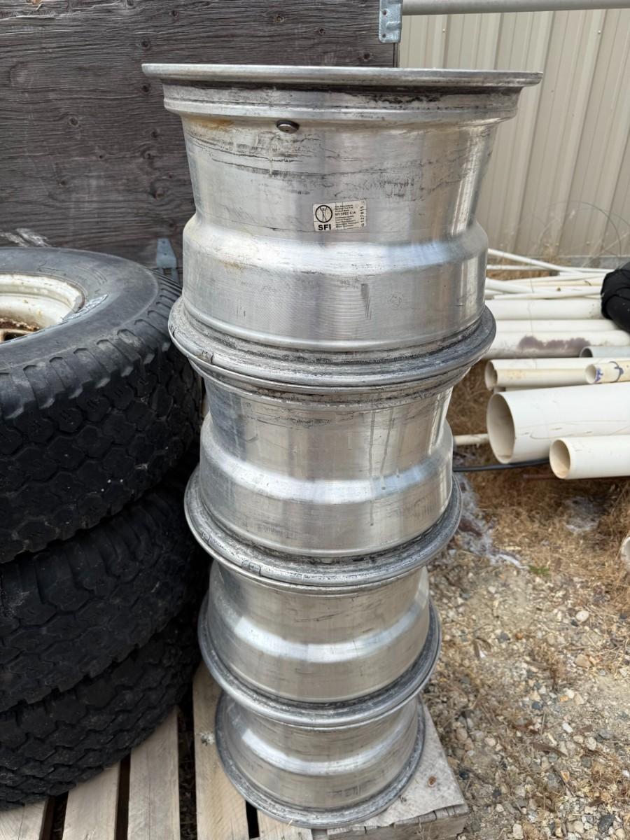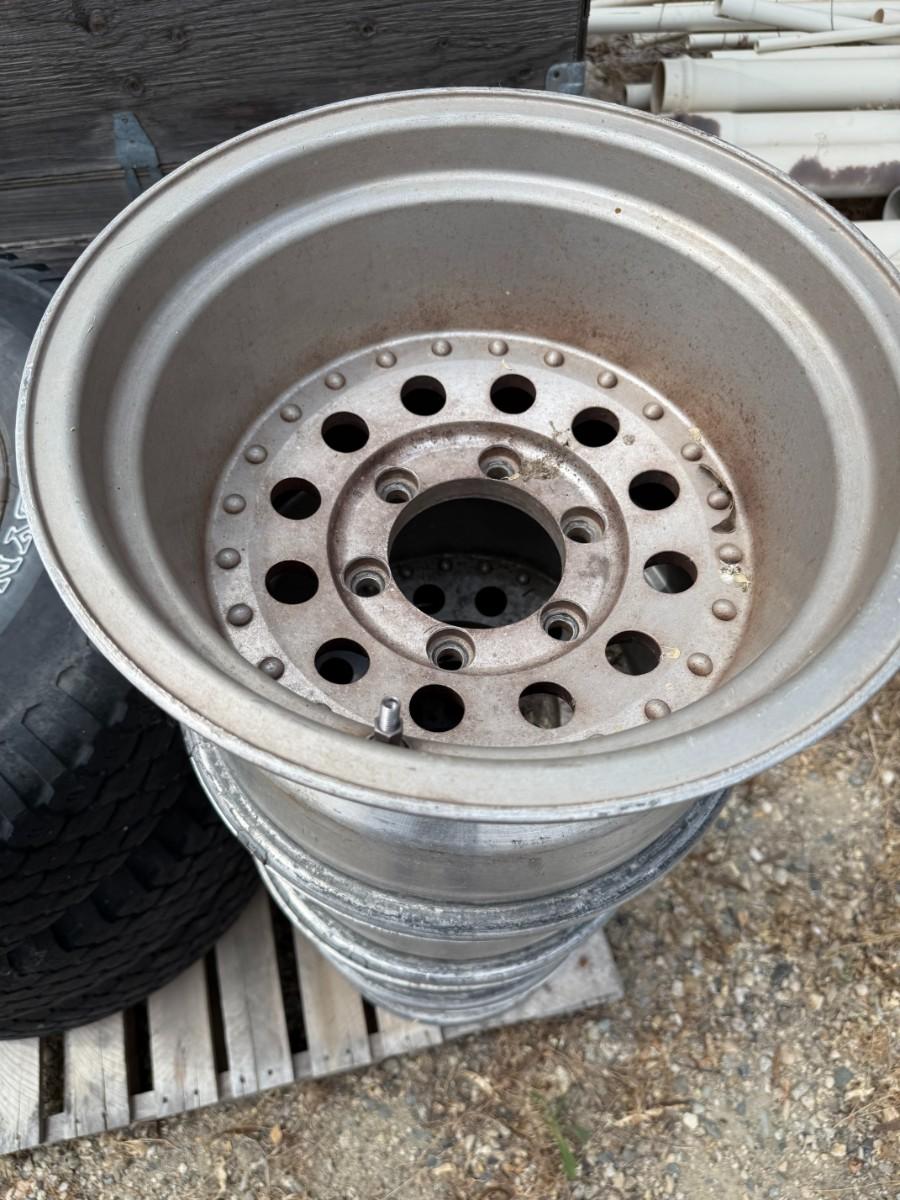 Four rugged aluminum rims for heavy-duty trucks or off-road vehicles. Some oxidation, but structurally sound.