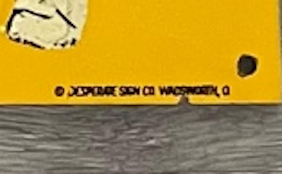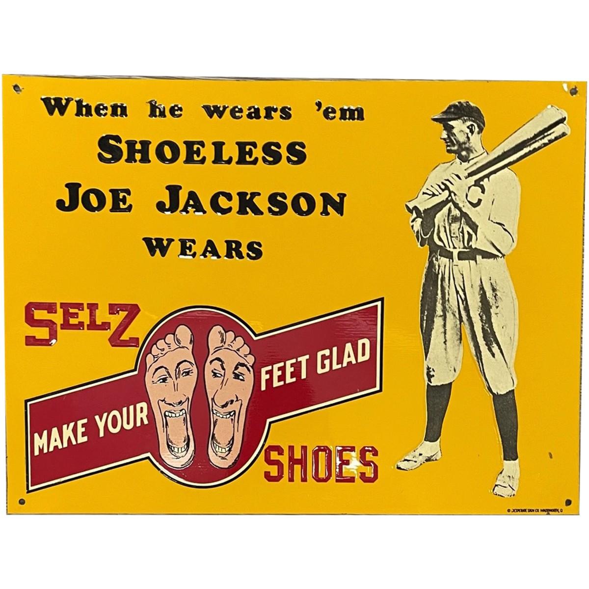 Description: When he Wears 'em Shoesless shoes Joe Jackson wears Advertising Sign. Measures approximately: 12 X 9 Inches. Material : Metal.