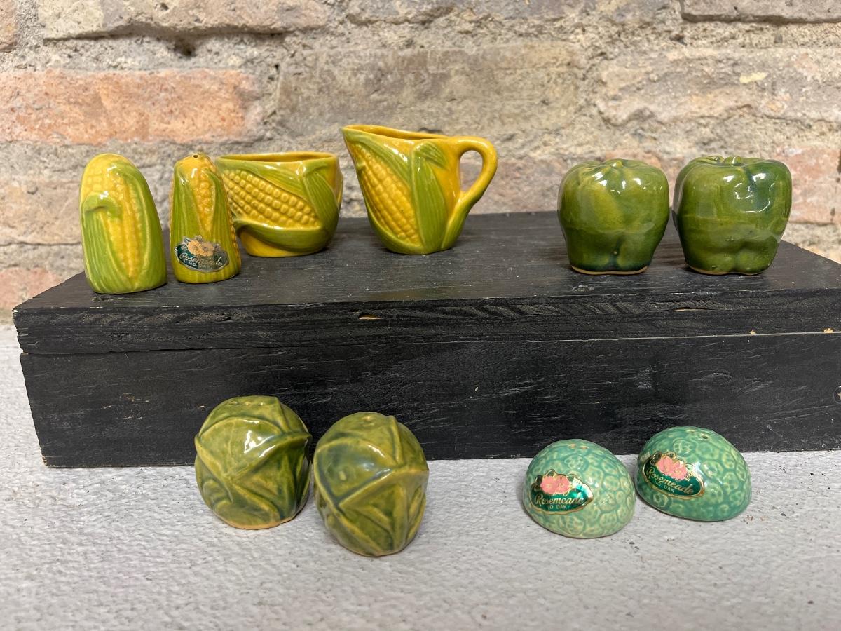 Where my Cobber fans at? Absolutely the most fun Rosemeade lot! Adorable little corn cream & sugar with S&P set, the cutest set of Brussels sprouts, green peppers and little pincushion cactus set - Original tags