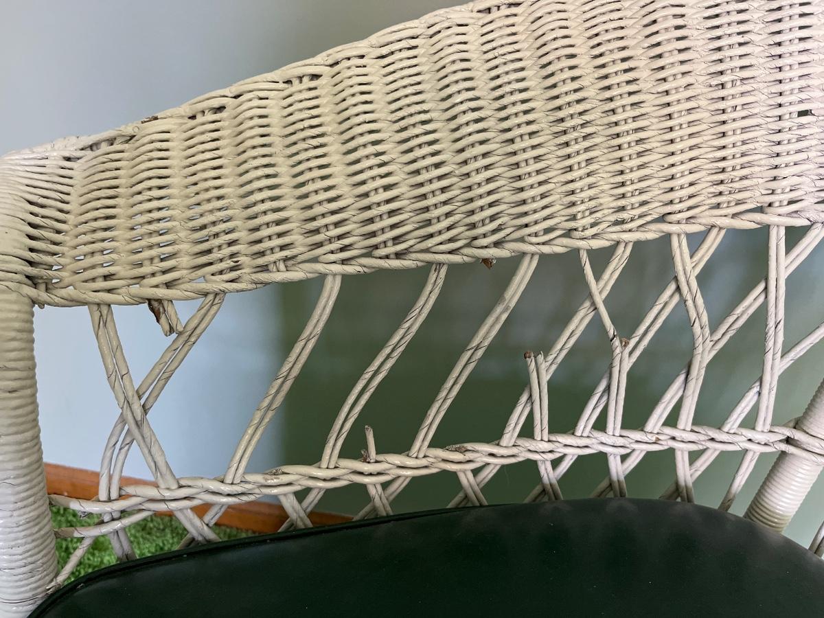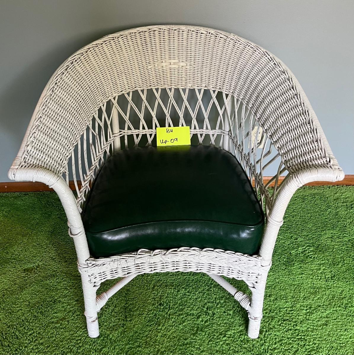 Whicker chair with green leather cushion. Has some damage on right side (pictured)