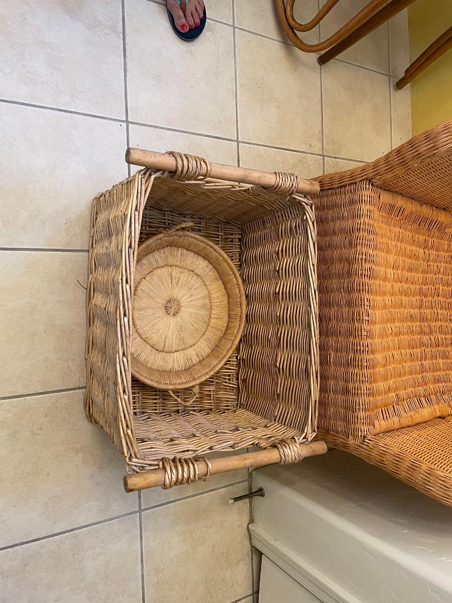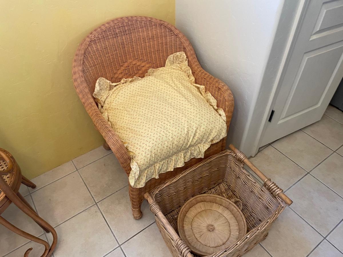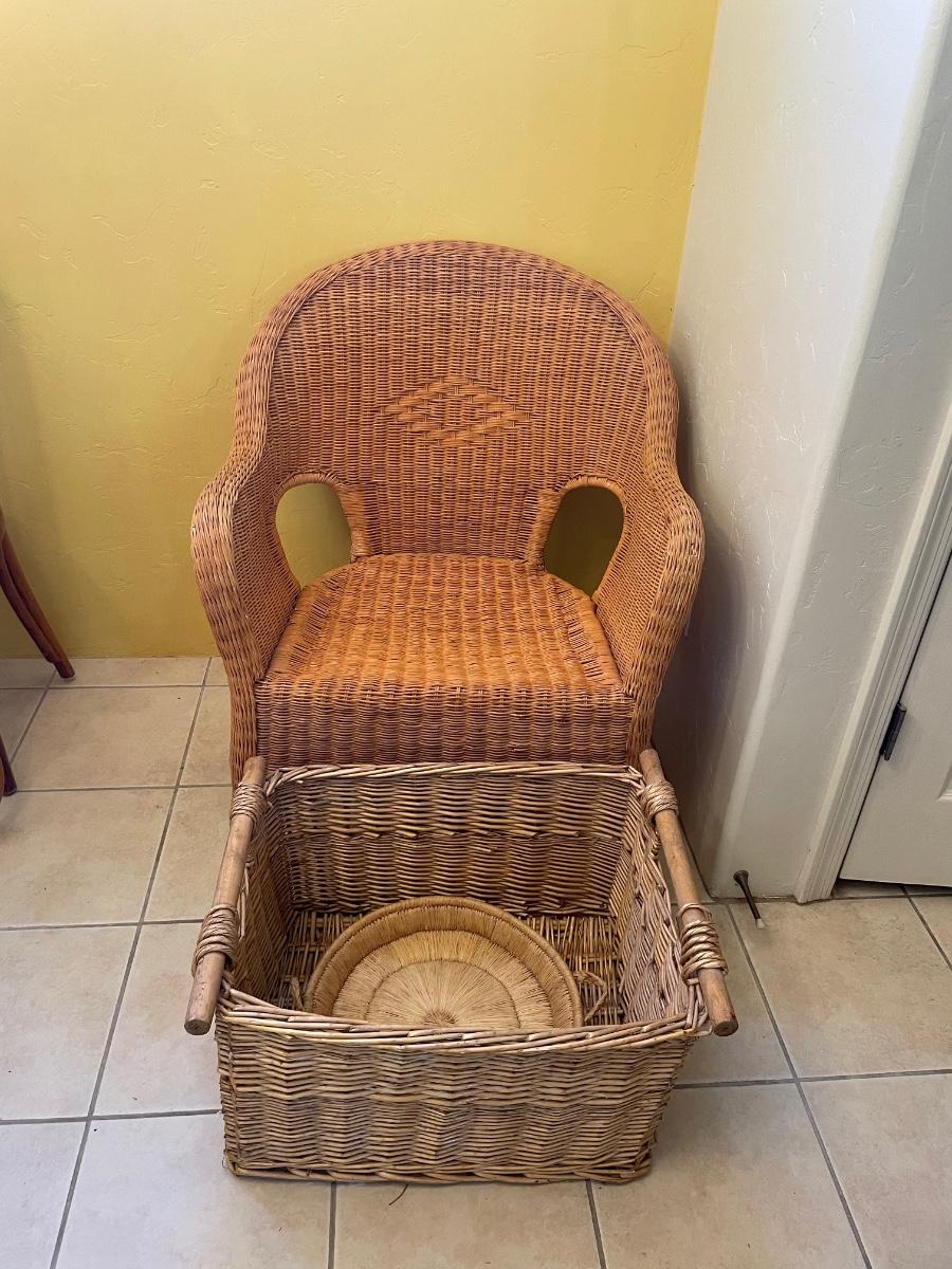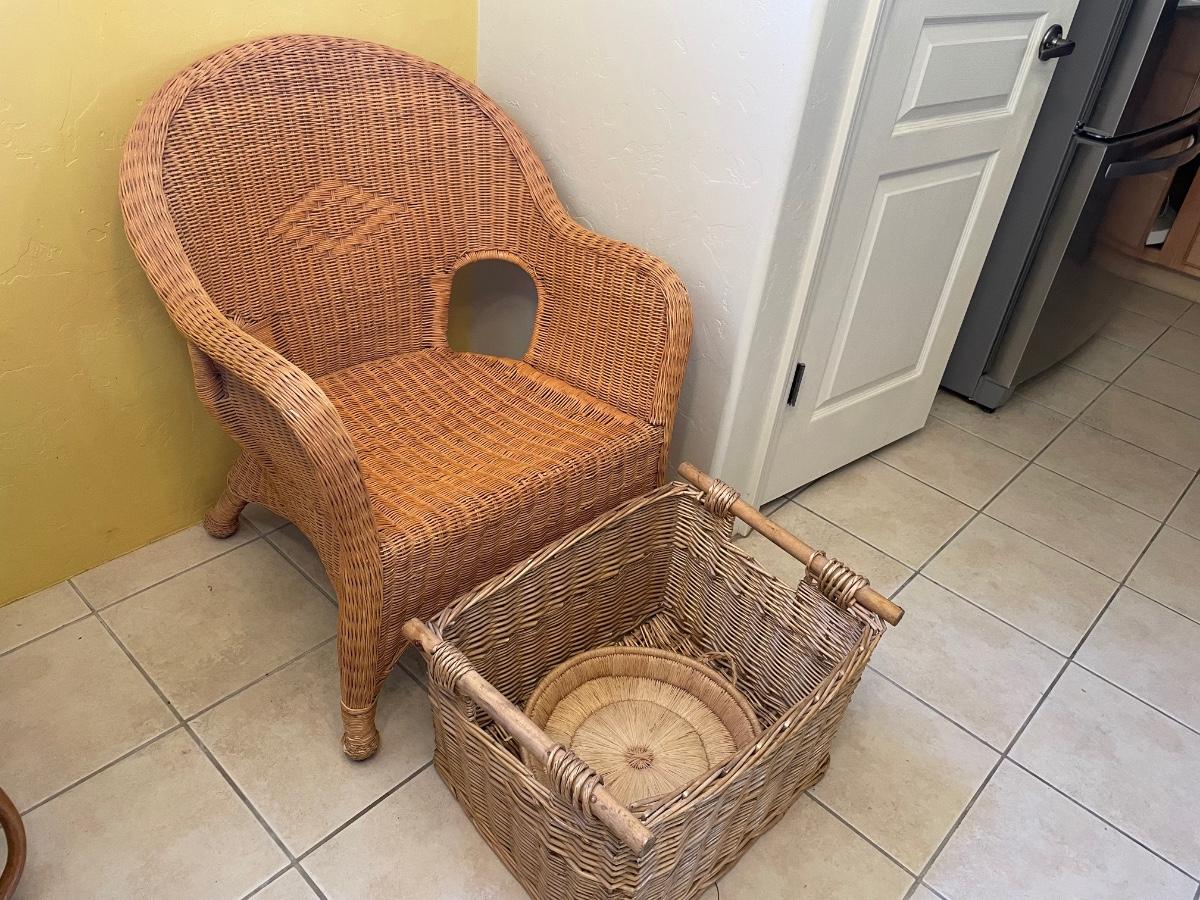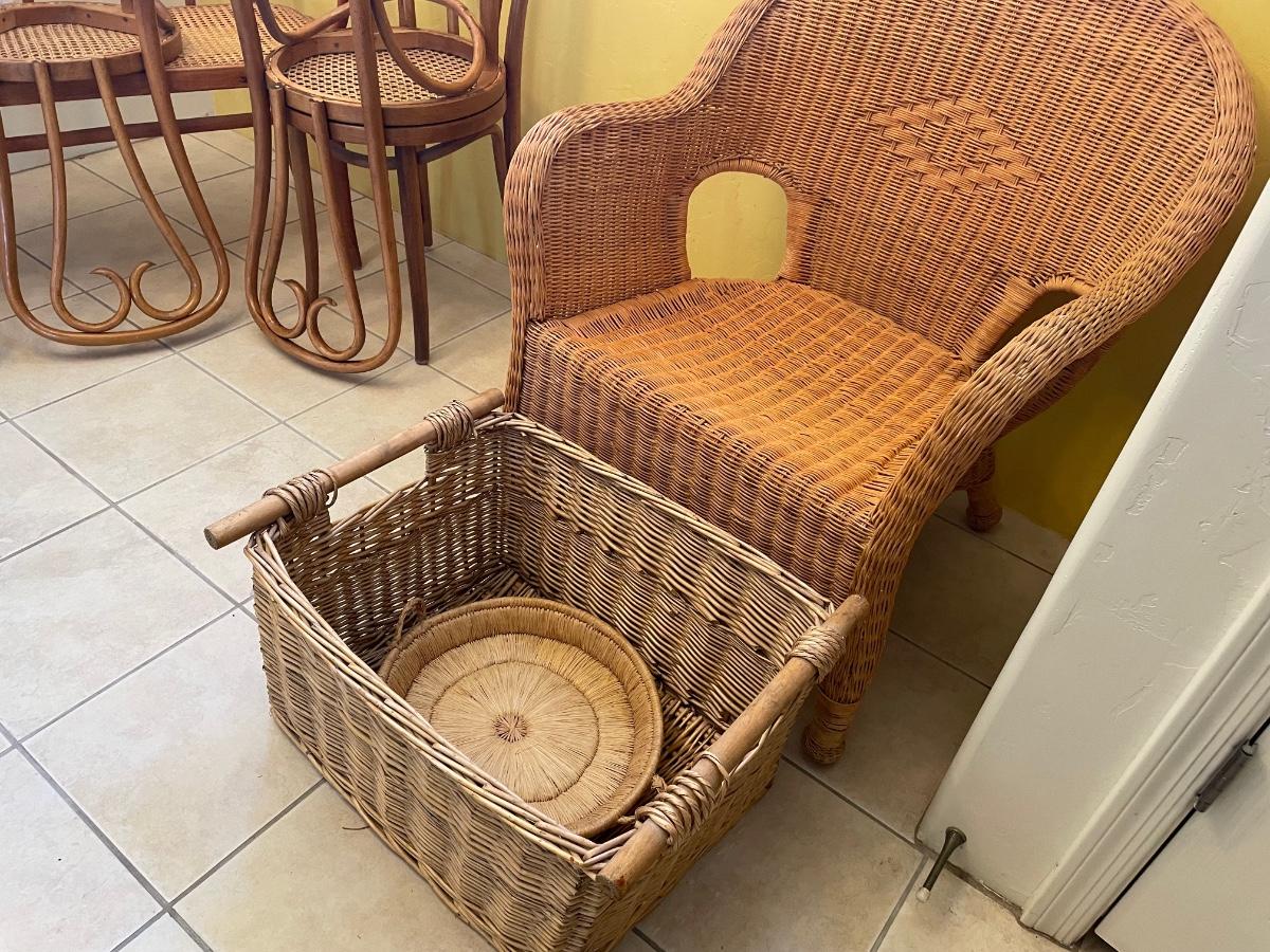 Whicker chair with yellow cushion in good condition, a large whicker basket and a woven plate in fair condition.