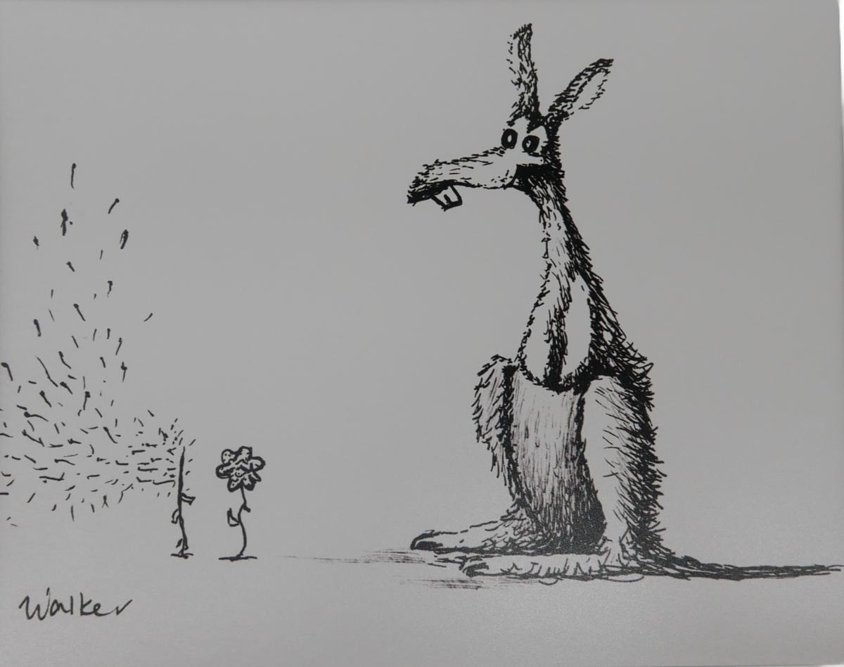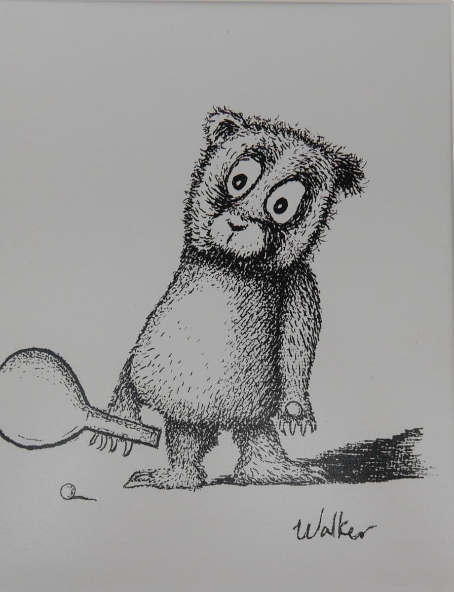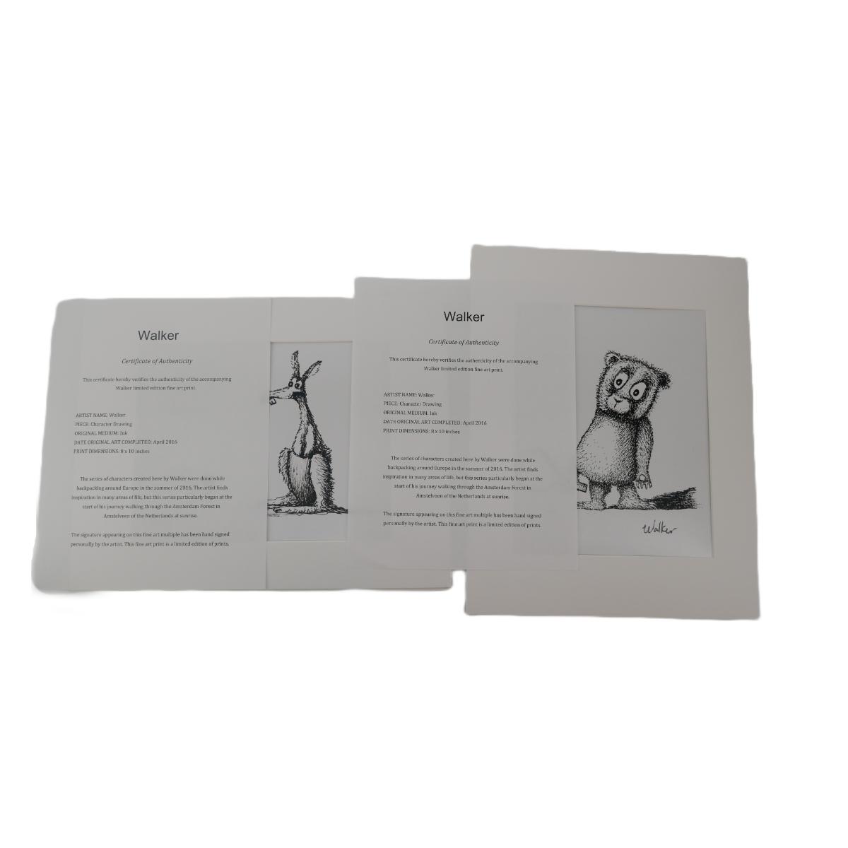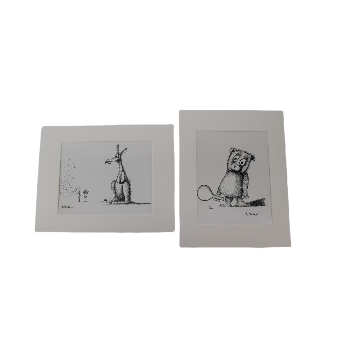 Two black and white whimiscial prints of a bear and kangaroo, print signed by artist Walker, c. 2016. Each comes with a Certificate of Authenticity. Artwork measures 9.5" x 7.5", total matte measures 14" x 11". Matted and unframed prints. Excellent condition! Lot weighs 10 oz. (A7)