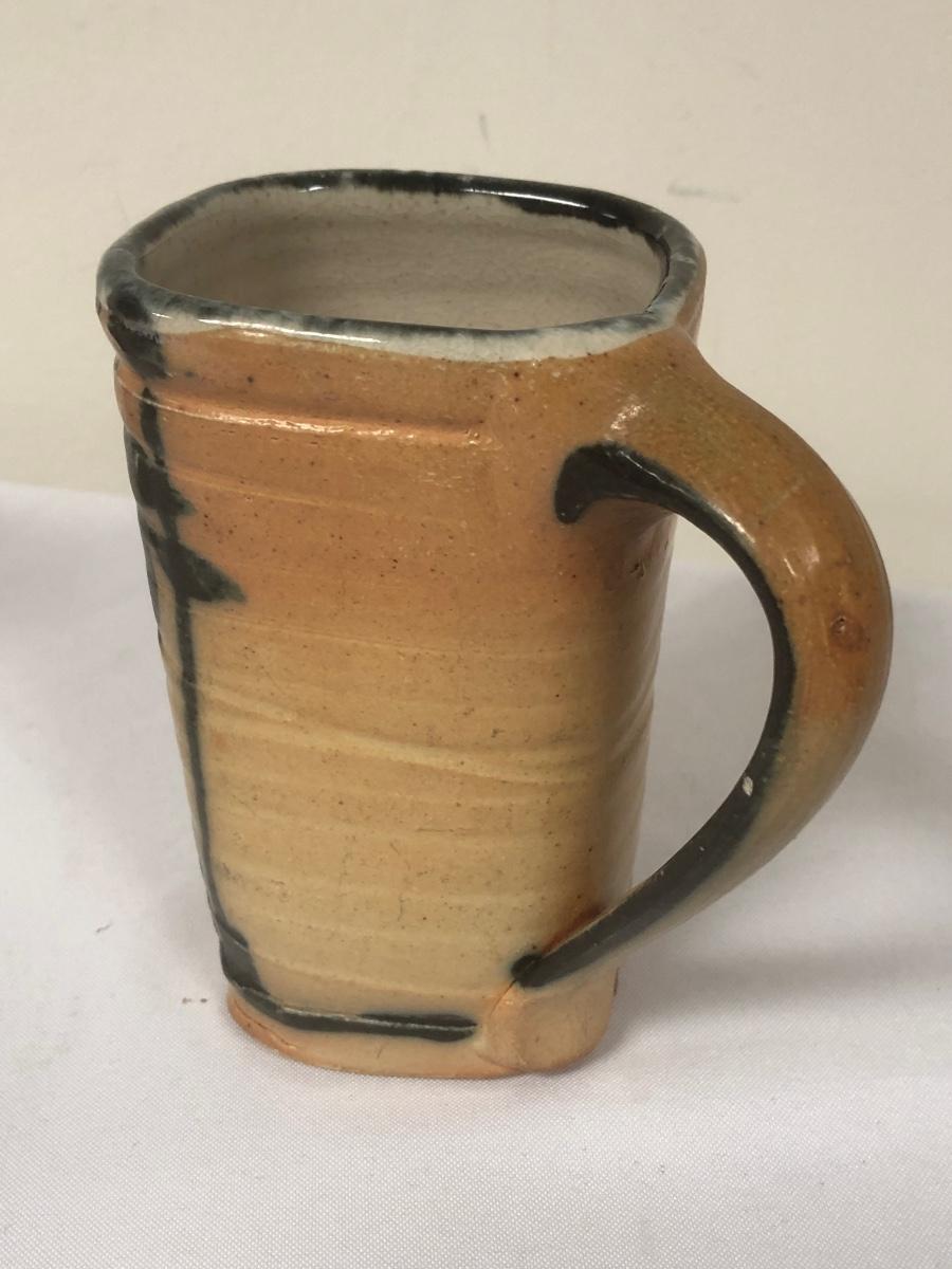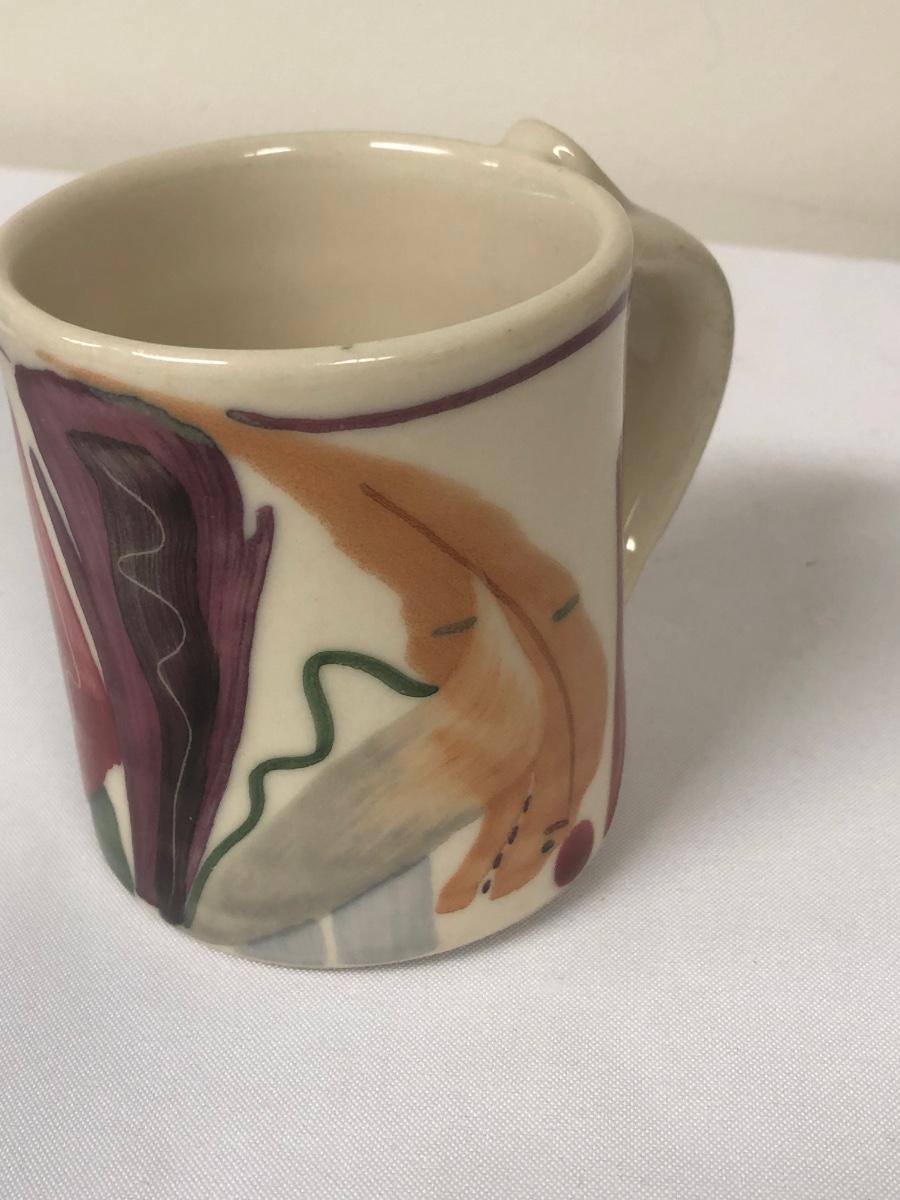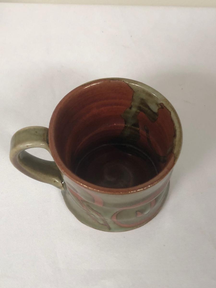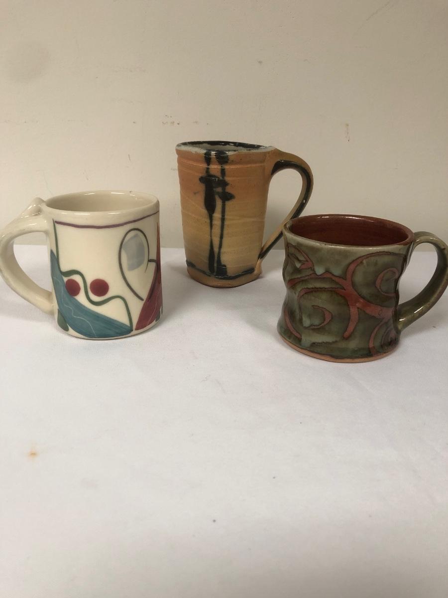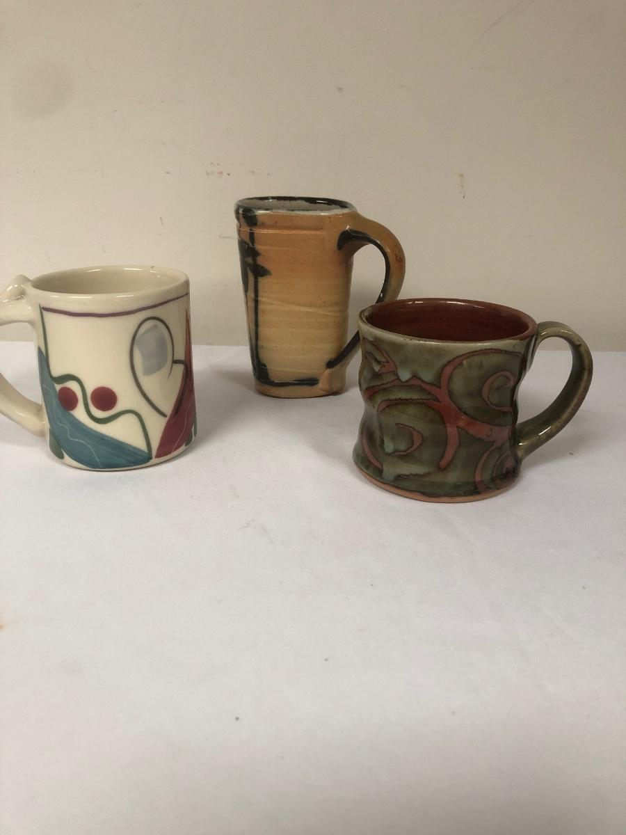 These three handmade coffee mugs are unique, with two having a whimsical design and the tallest (5”) having an Asian flare. One of the mugs has a signature. Shipping Available.