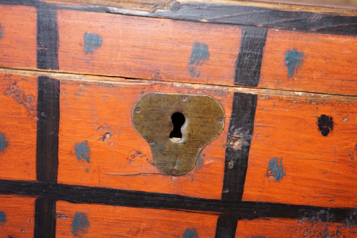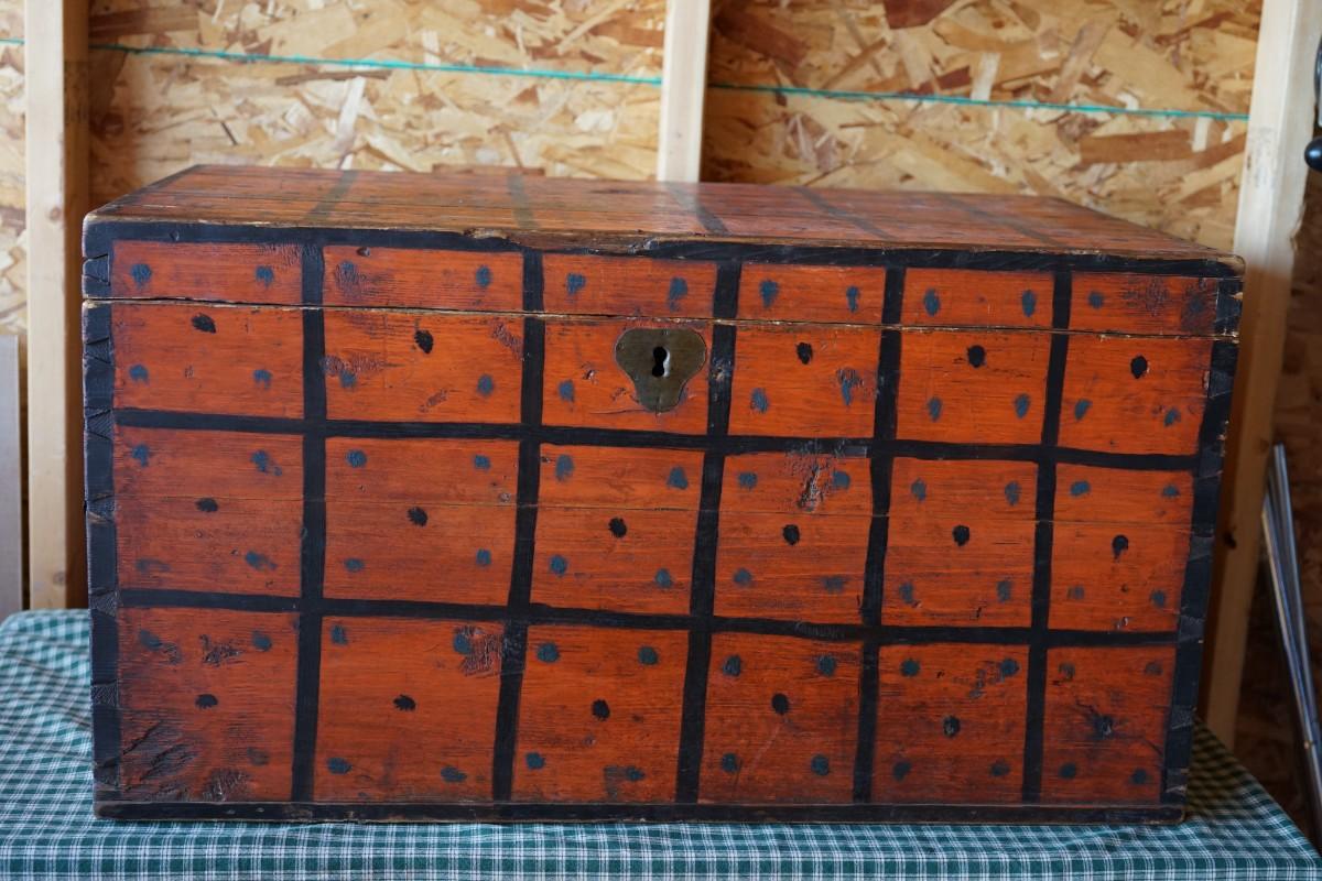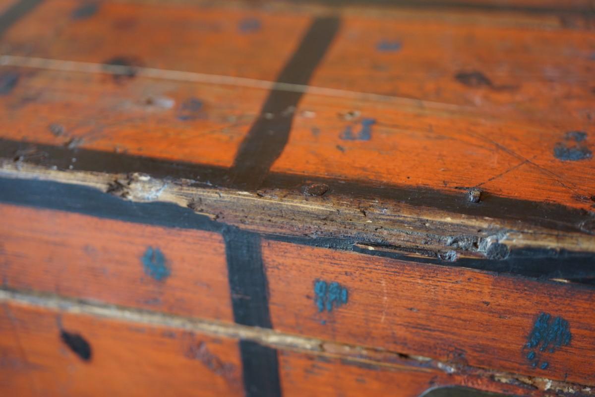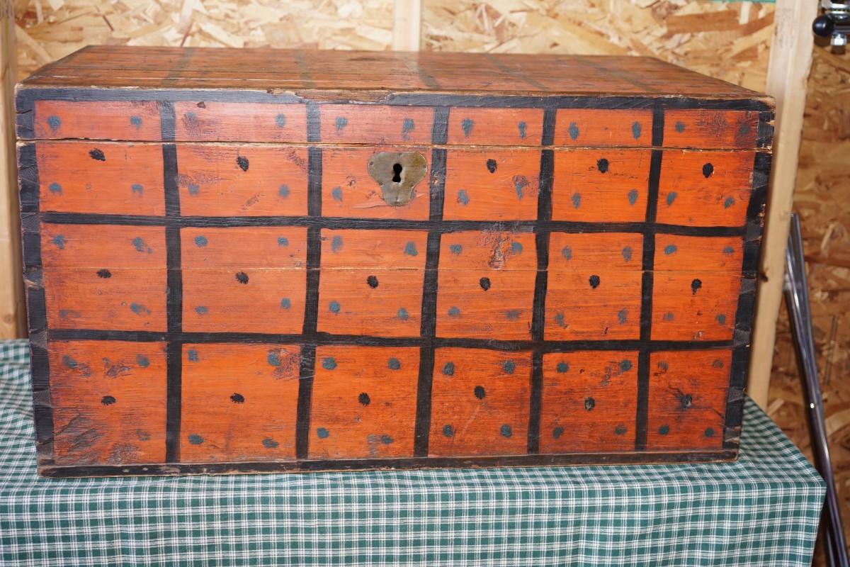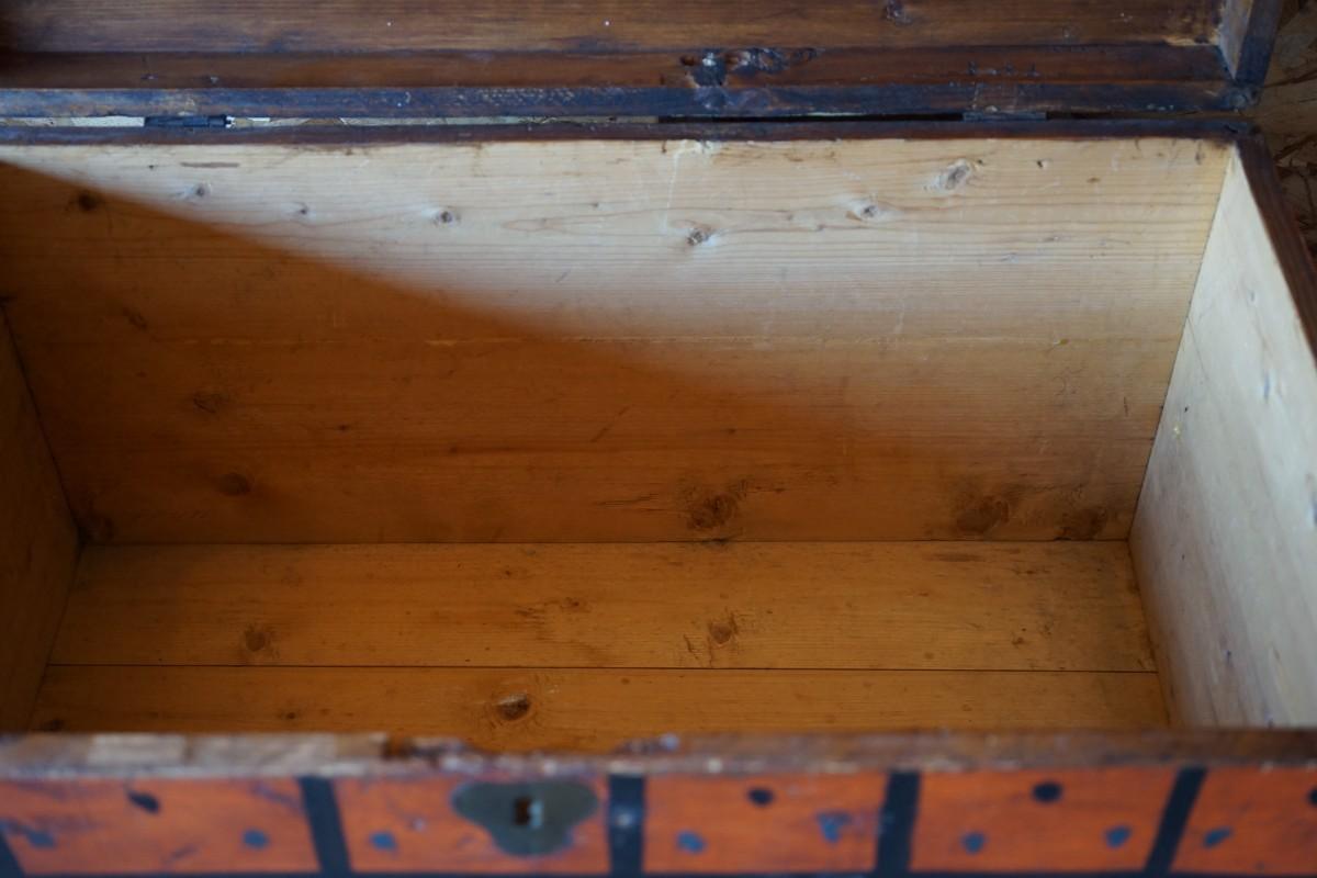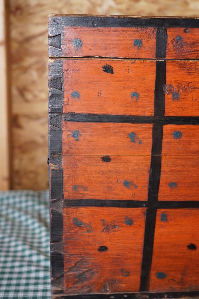 WHIMSICAL  FOLK ART PAINTED PRIMITIVE AMERICANA WOODEN TRUNK OLD ORANGE PAINT W/POLKA DOTS