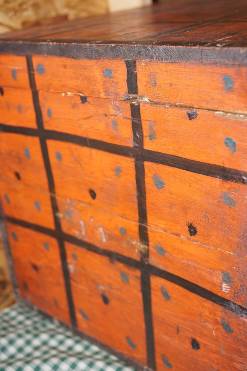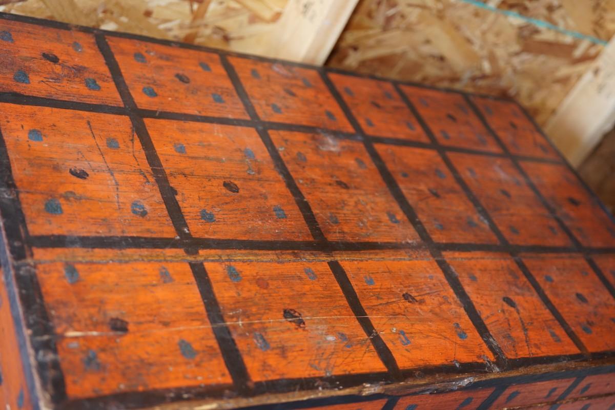 WHIMSICAL FOLK ART PAINTED PRIMITIVE AMERICANA WOODEN TRUNK OLD ORANGE PAINT W/POLKA DOTS