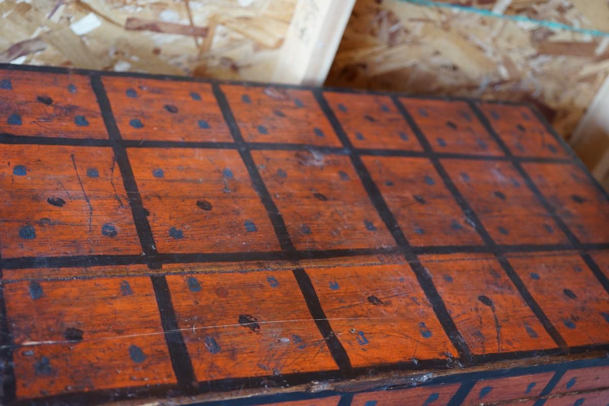 early orange paint. accented with black lines and blue and black polka dots. appears to be all original. there is a compartment for documents etc inside/ lid is missing , the interior is clean but old.