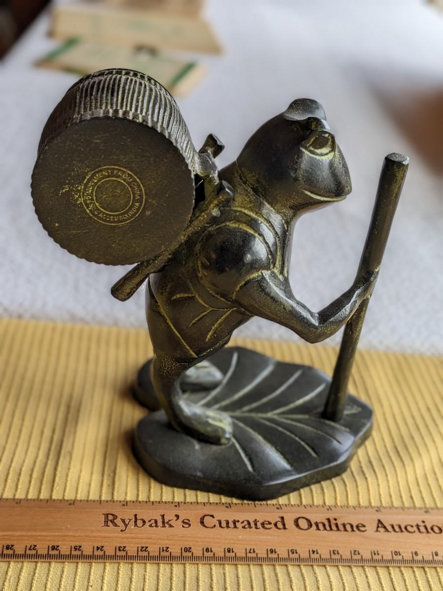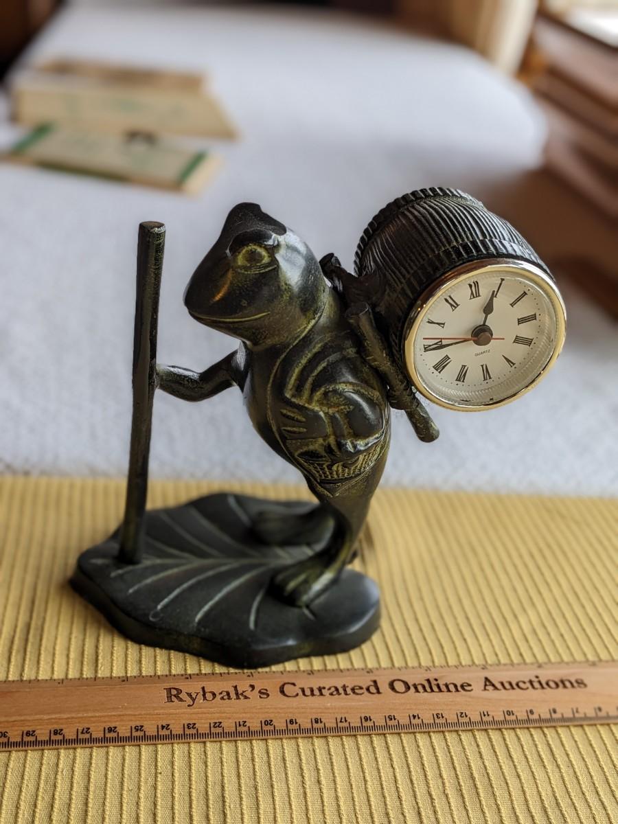 WHIMSICAL FROG STANDING ON LEAF HOLDING WALKING STICK W/ CLOCK ON BACK