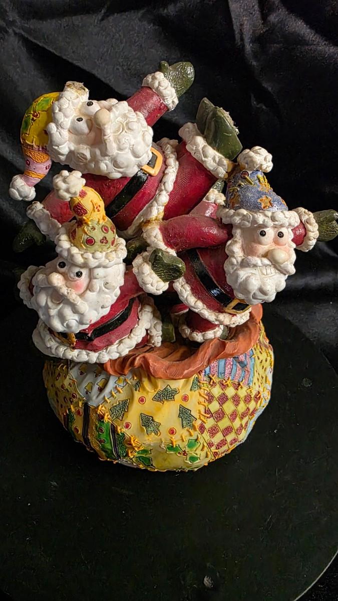 A joyful burst of Christmas charm, this vibrant holiday figurine features four cheerful Santas tumbling together in a lively swirl of color and personality. Each Santa is uniquely styled with expressive faces, playful poses, and festive attire, creating a captivating sense of motion that immediately draws the eye. They spill from a wonderfully detailed patchwork sack, decorated with bright patterns, holly motifs, stitched textures, and warm golden tones that capture the homespun magic of holiday storytelling.