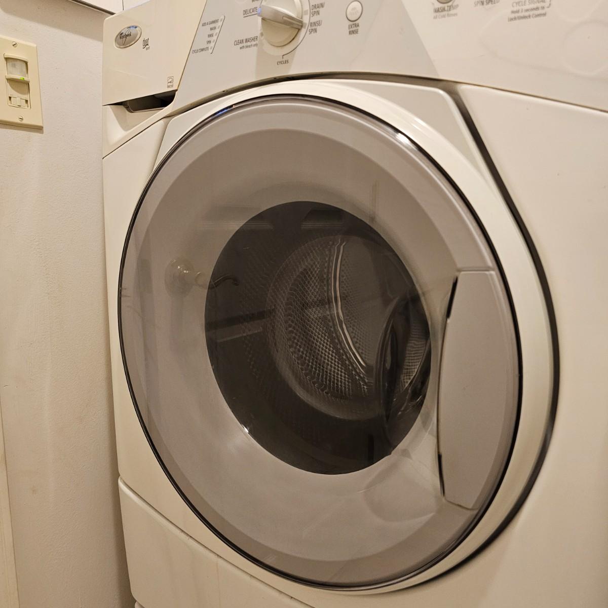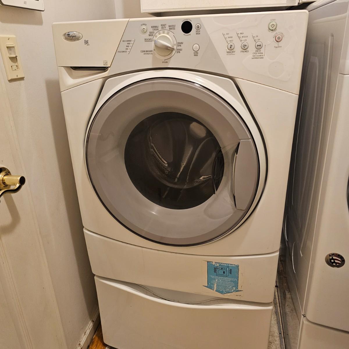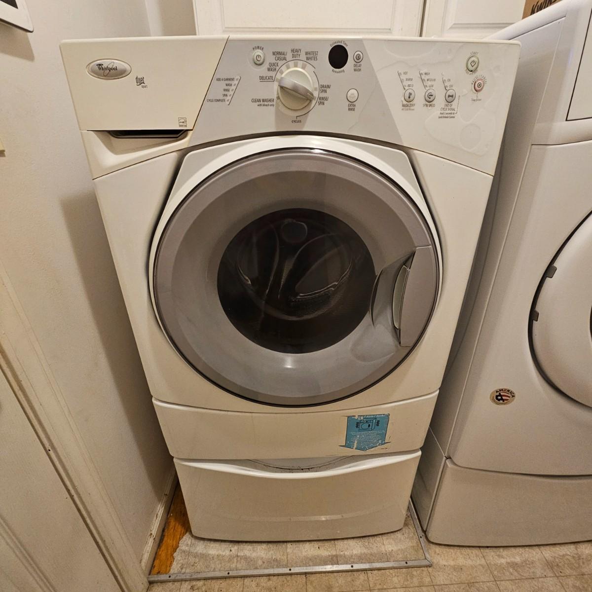 Front load Whirlpool Duet Sport model washer. Multiple cycles, temperatures and load sizes. Clear front door window. Washer measures 27" x 28" x 50"H and includes the optional storage pedestal drawer at the bottom. Item powered on when plugged in and turned on. See photos for details. Local pickup only. Winning bidder must bring assistance to help move and load this item due to its weight and/or size. Winner will also be responsible for disconnecting washer before move.